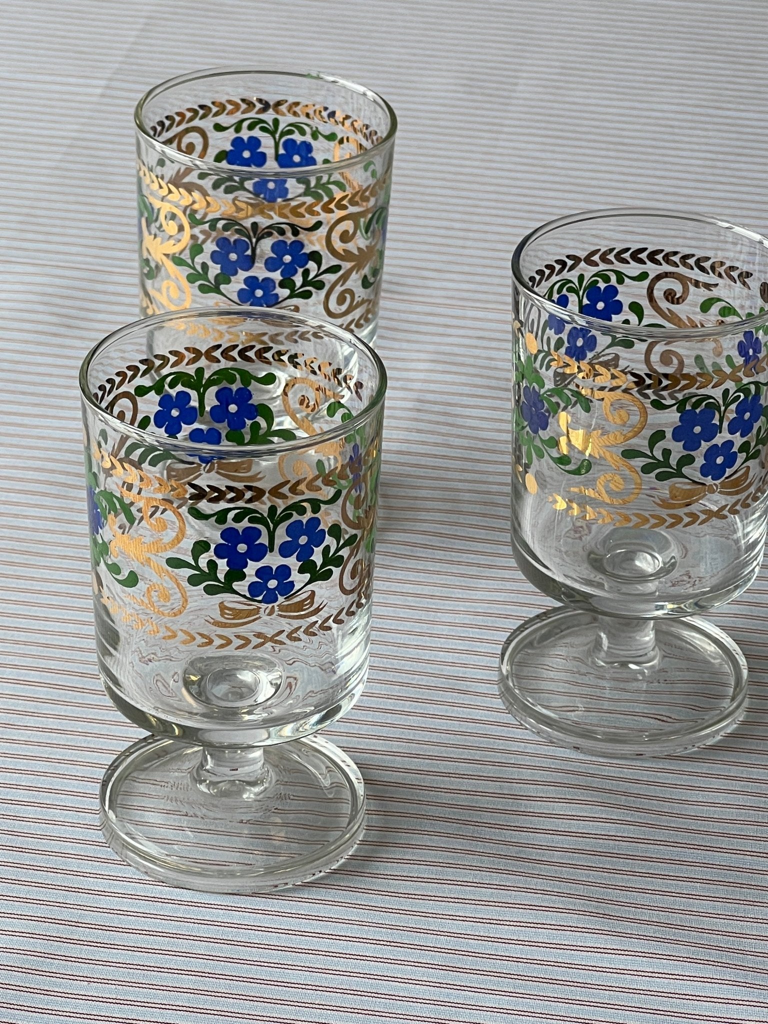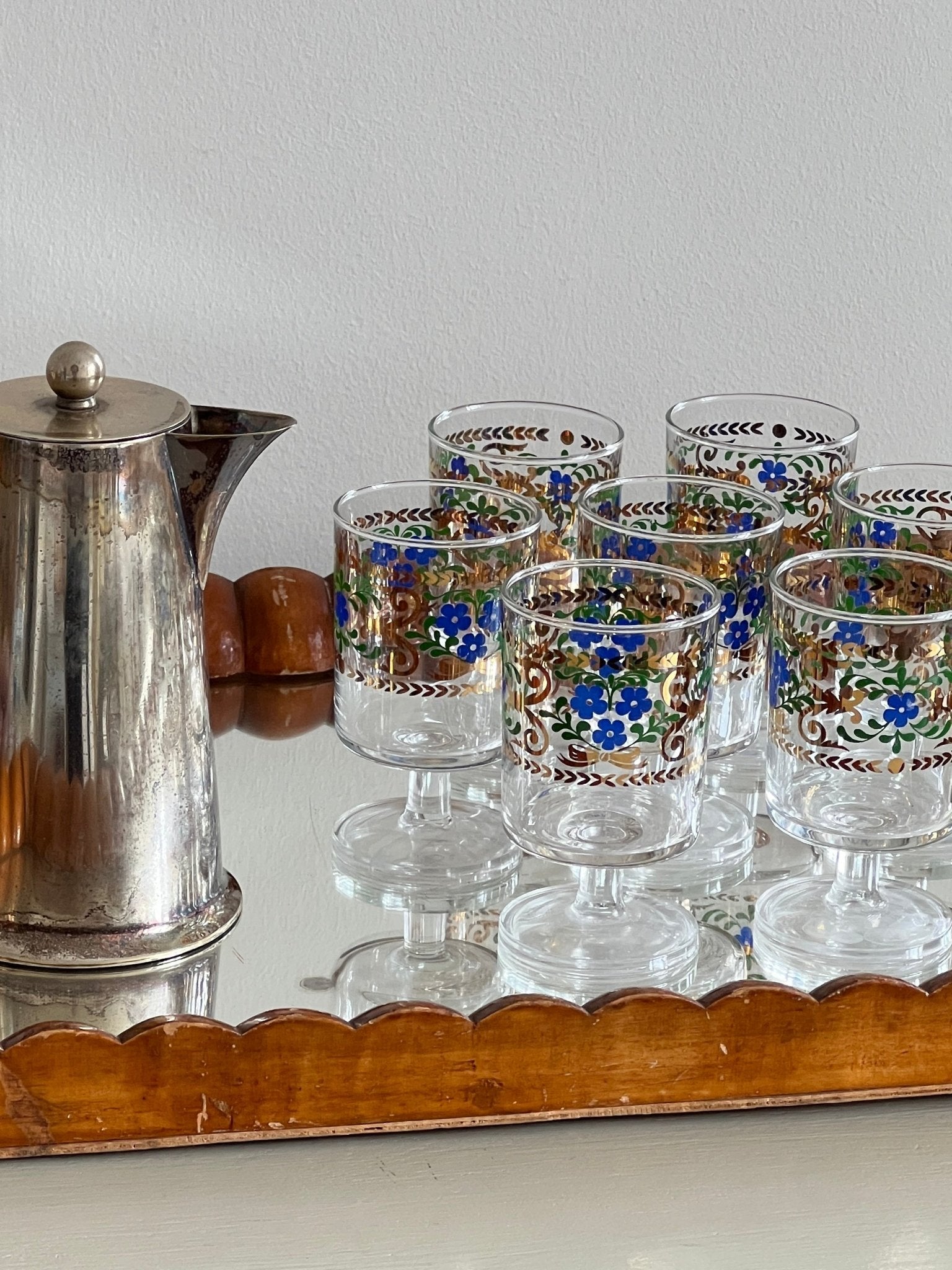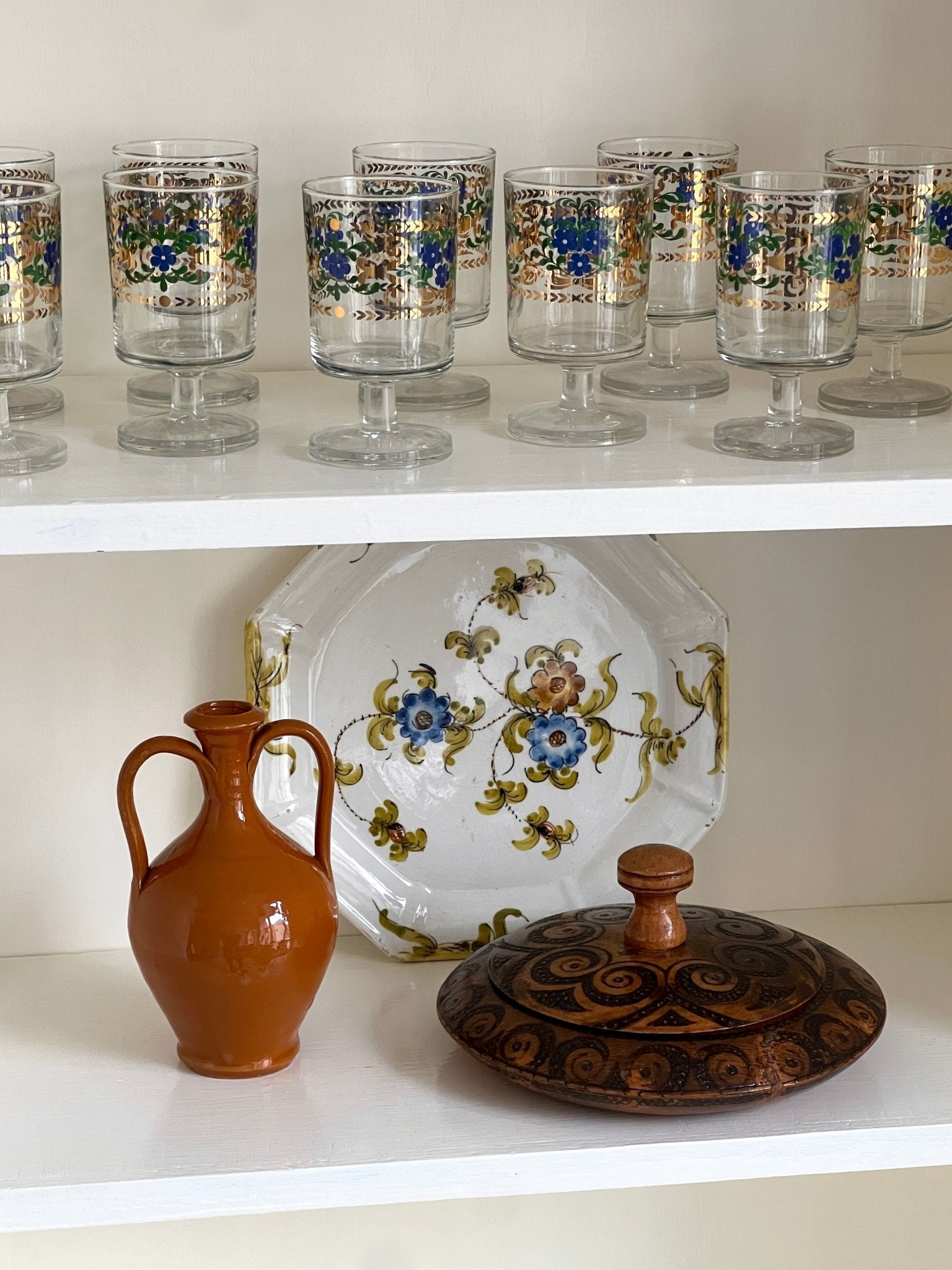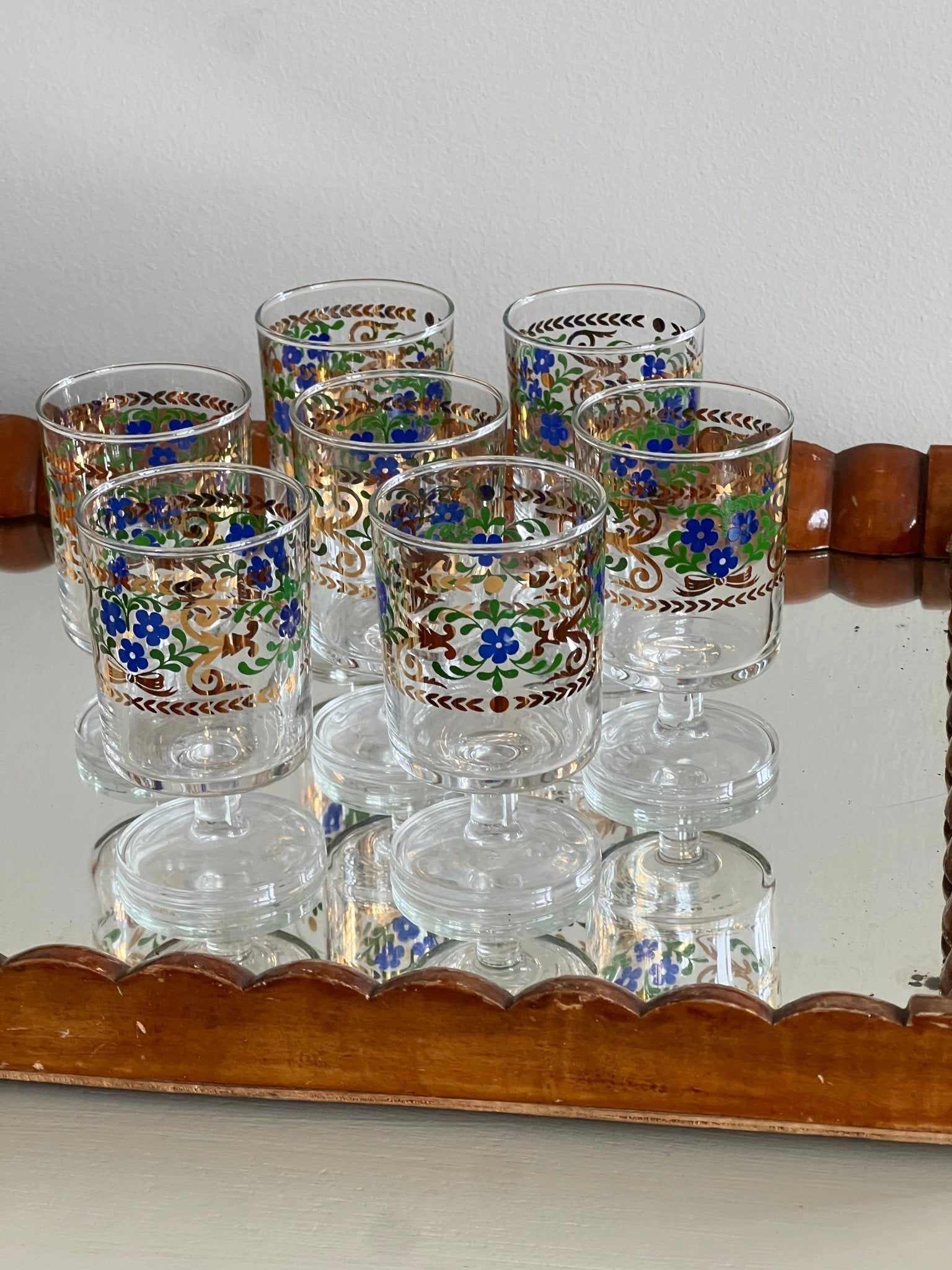 Beautiful French wine glasses with floral decor. 8 pcs are available. In excellent vintage condition.