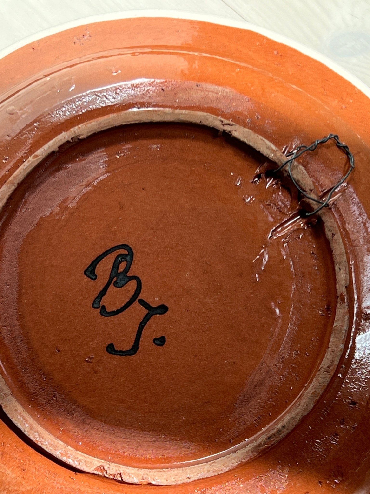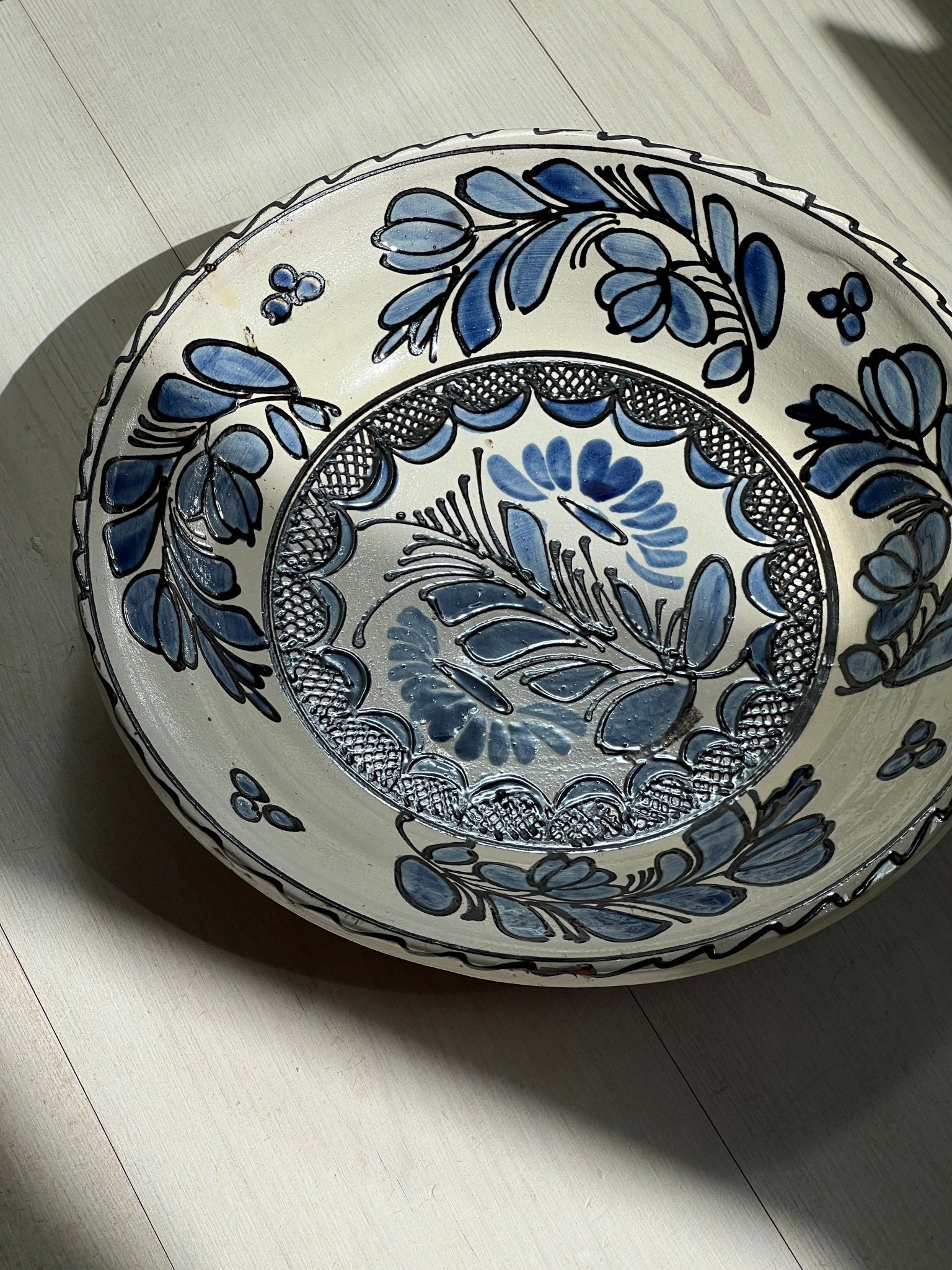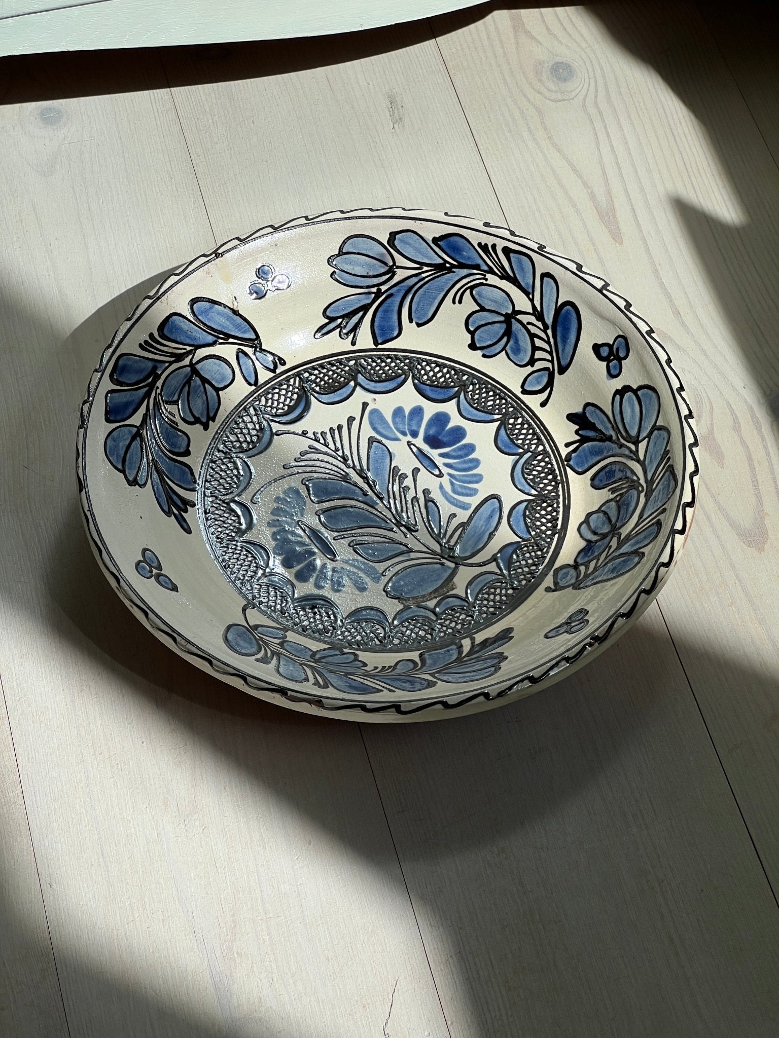 Handpainted terracotta platter with blue and cream-coloured decor. In mint condition. Wall mount is included.