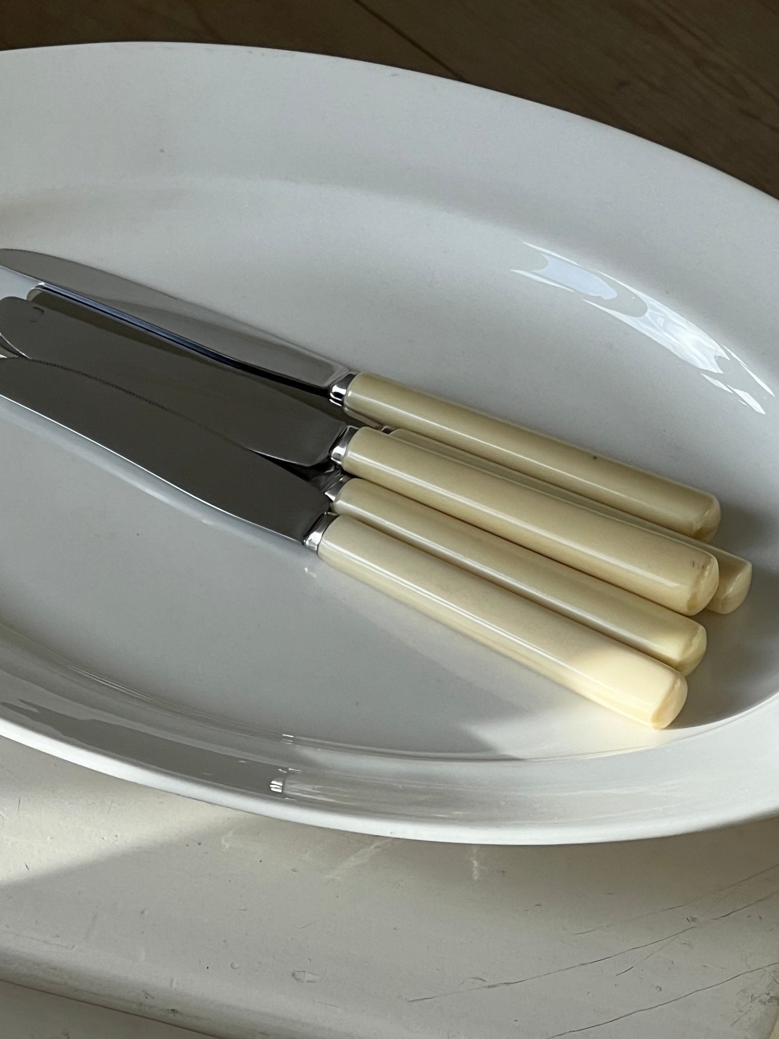 Butter coloured knives in stainless steel. A favourite of ours. Dishwasher safe. 4 pcs are left. In good vintage condition.