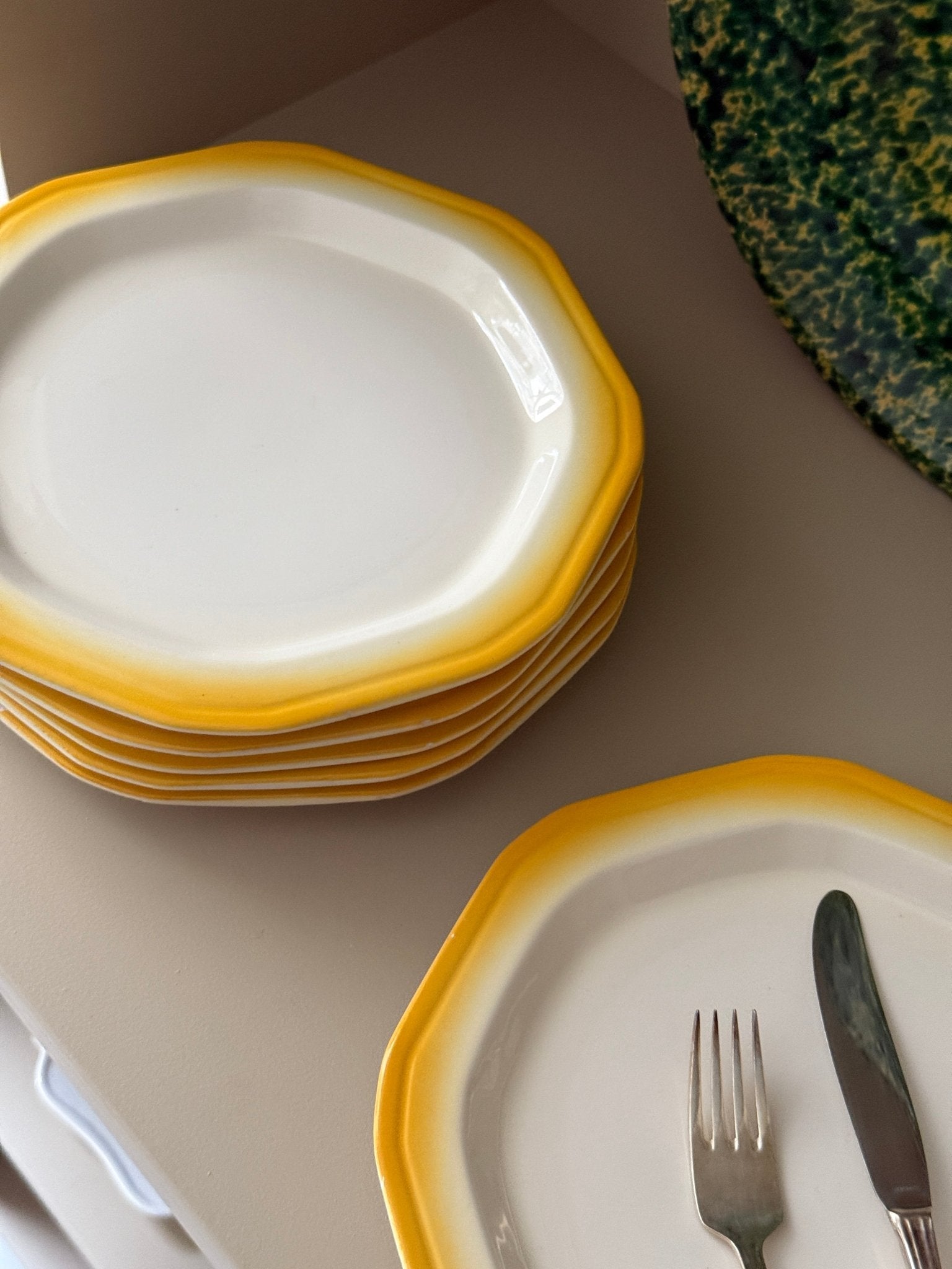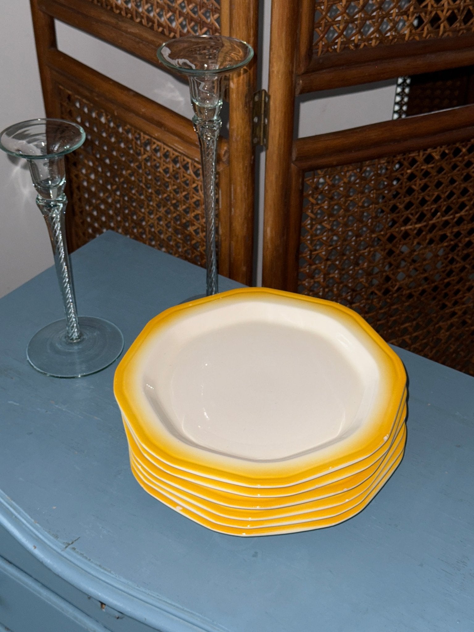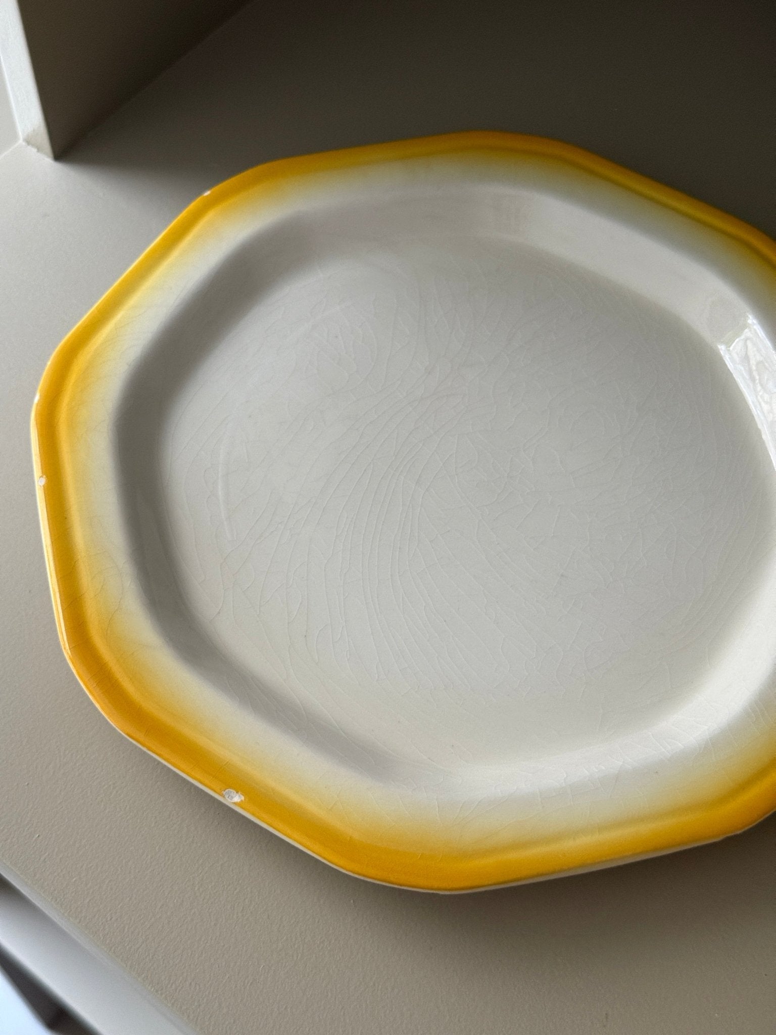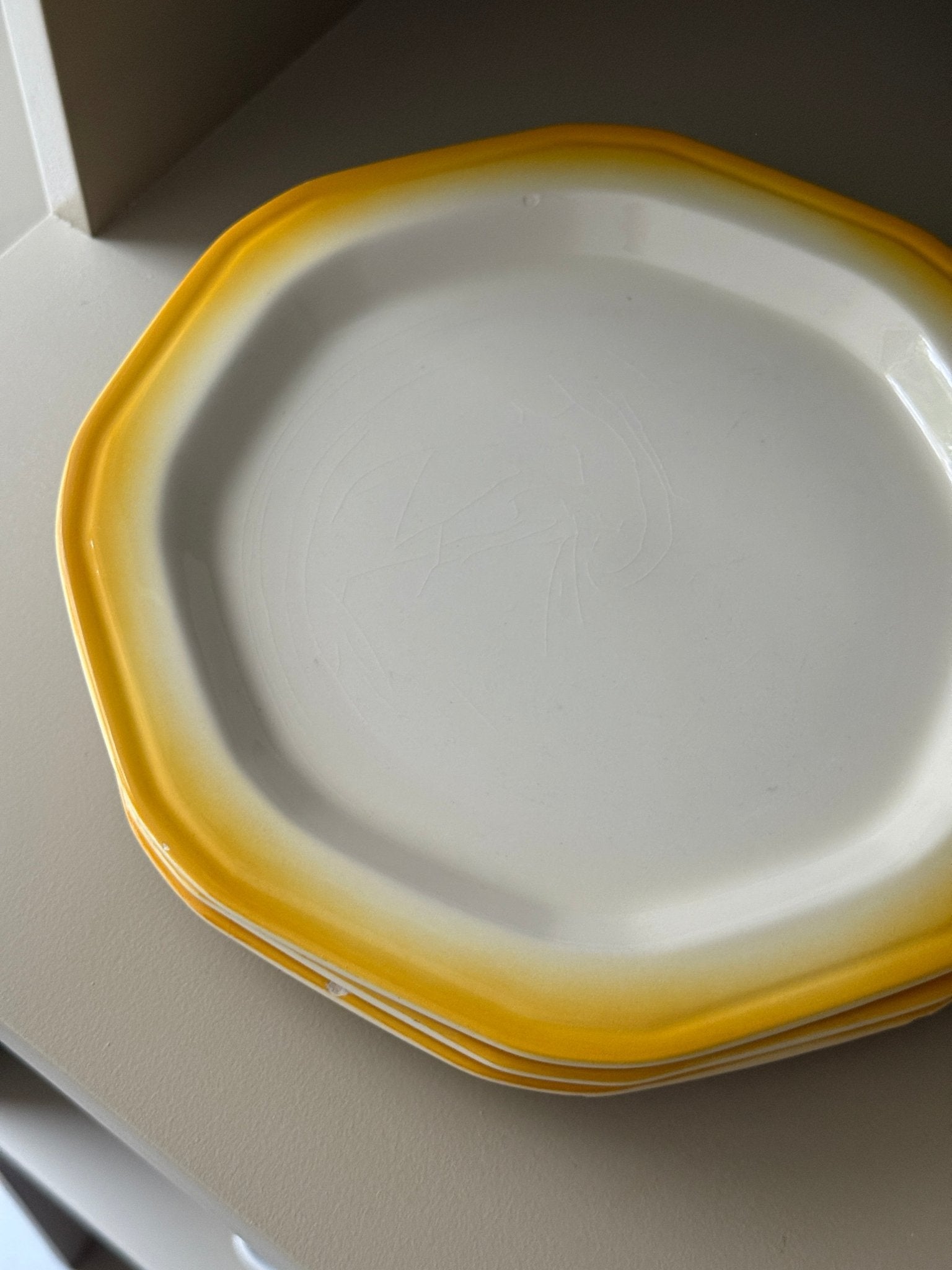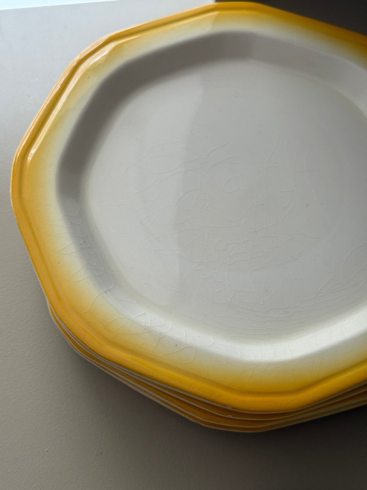 Octagonal dinner plates with yellow rim. Made in Italy. 6 pcs available. Crazing appears as shown in the photos and two minor chips, still in very good condition. Price is set accordingly.
