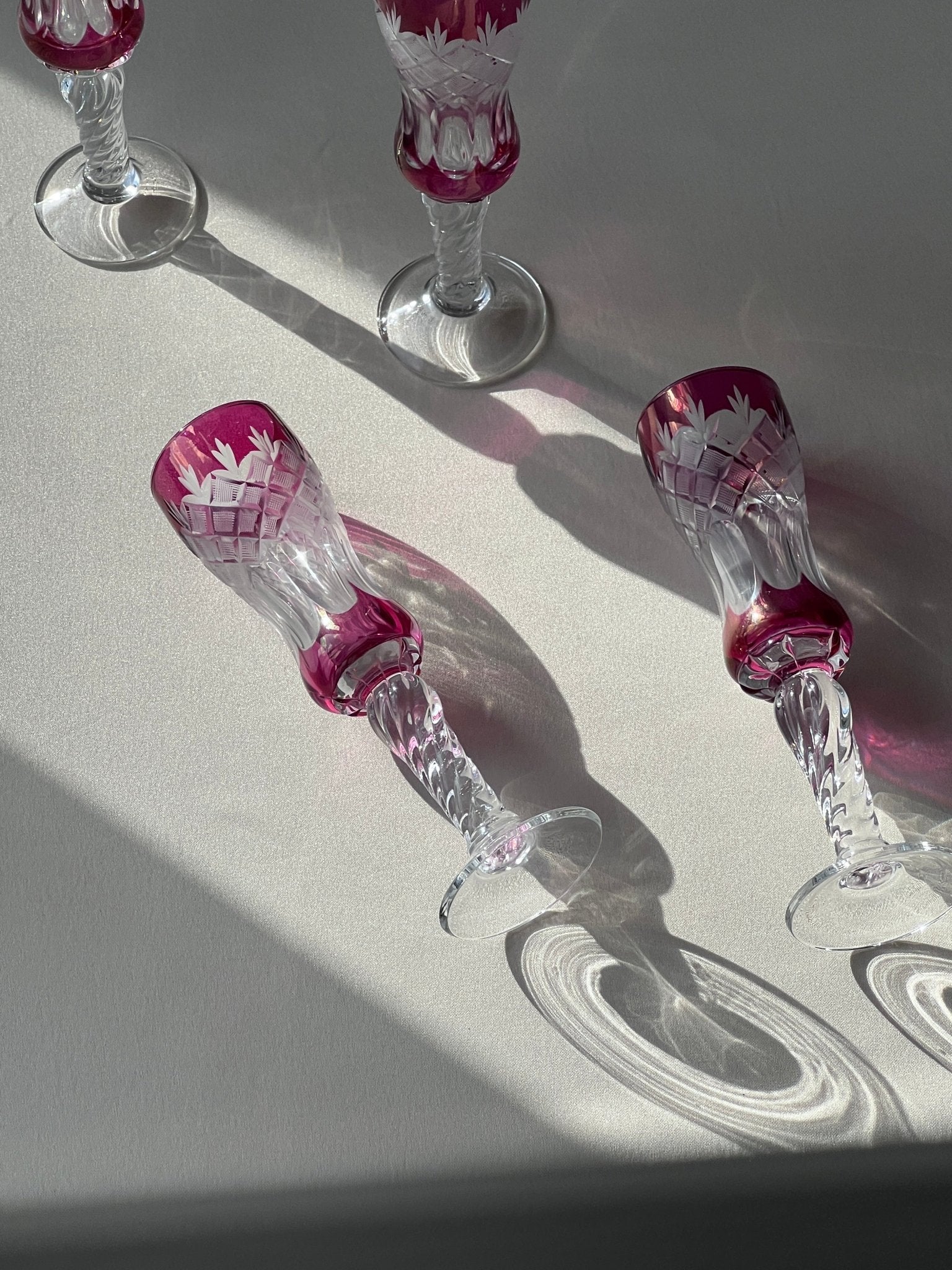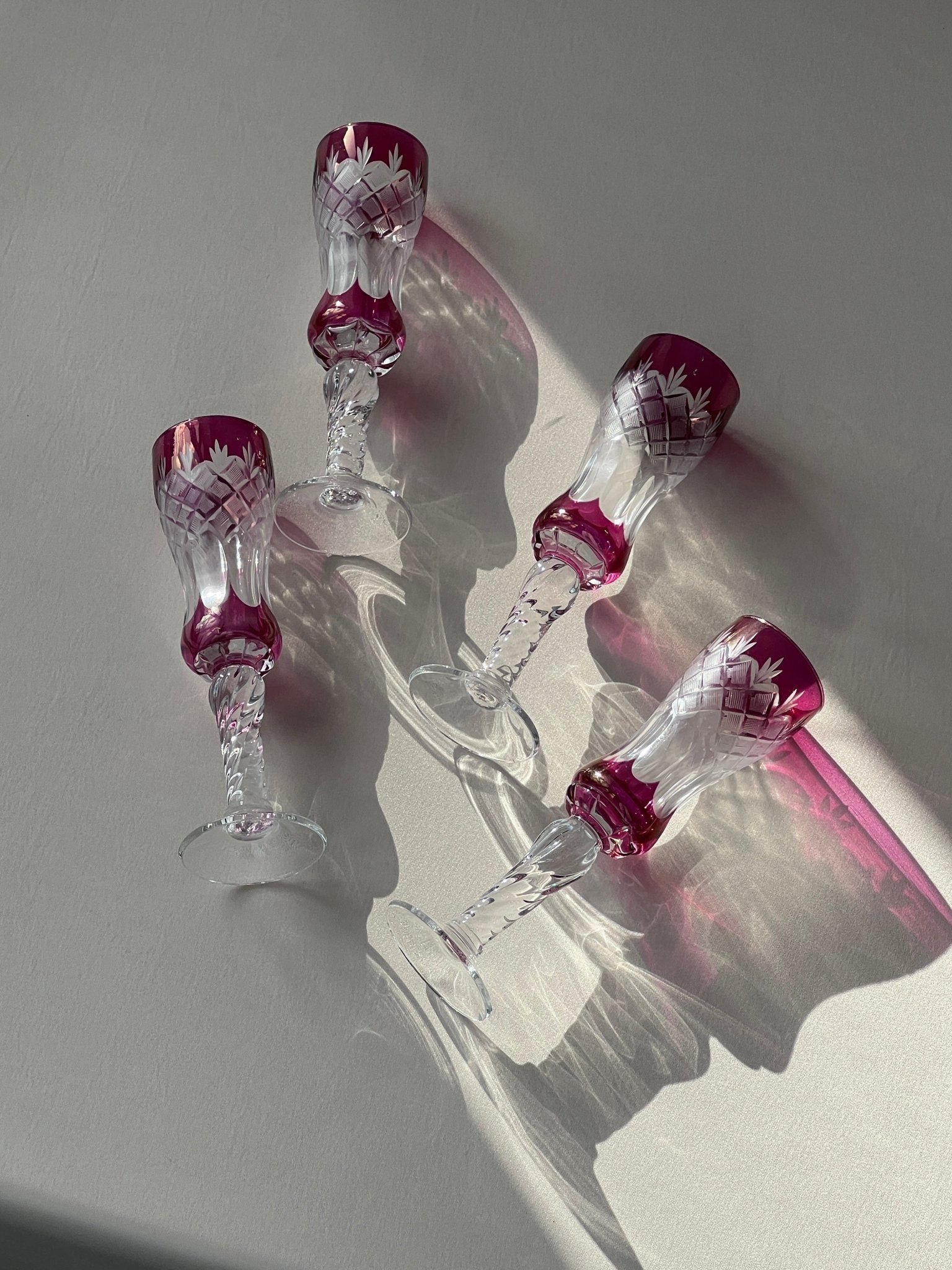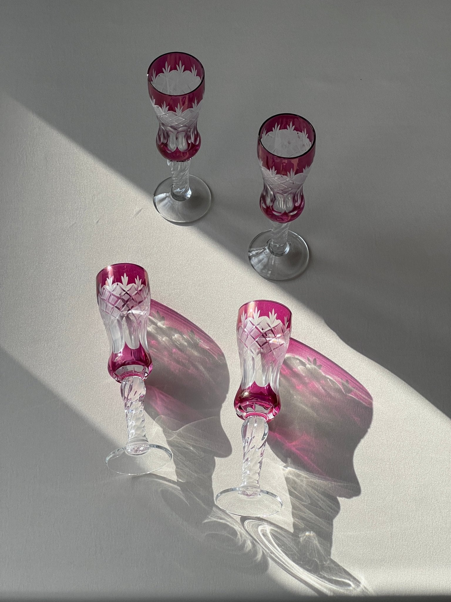 Tall, pink liquor glasses. 4 pcs available, sold together. In excellent vintage condition except one tiny cut on one of the feet.