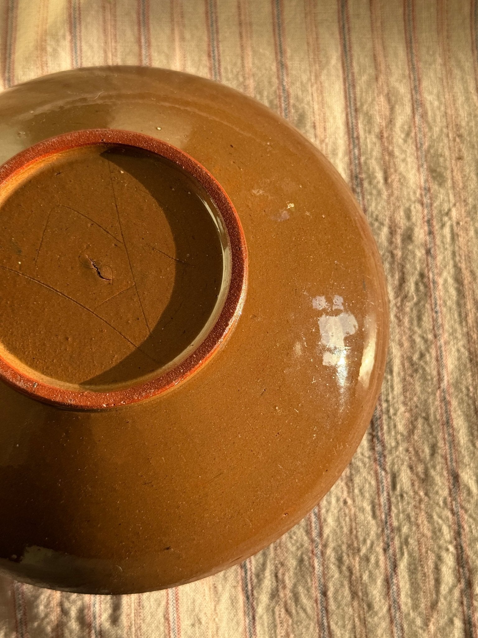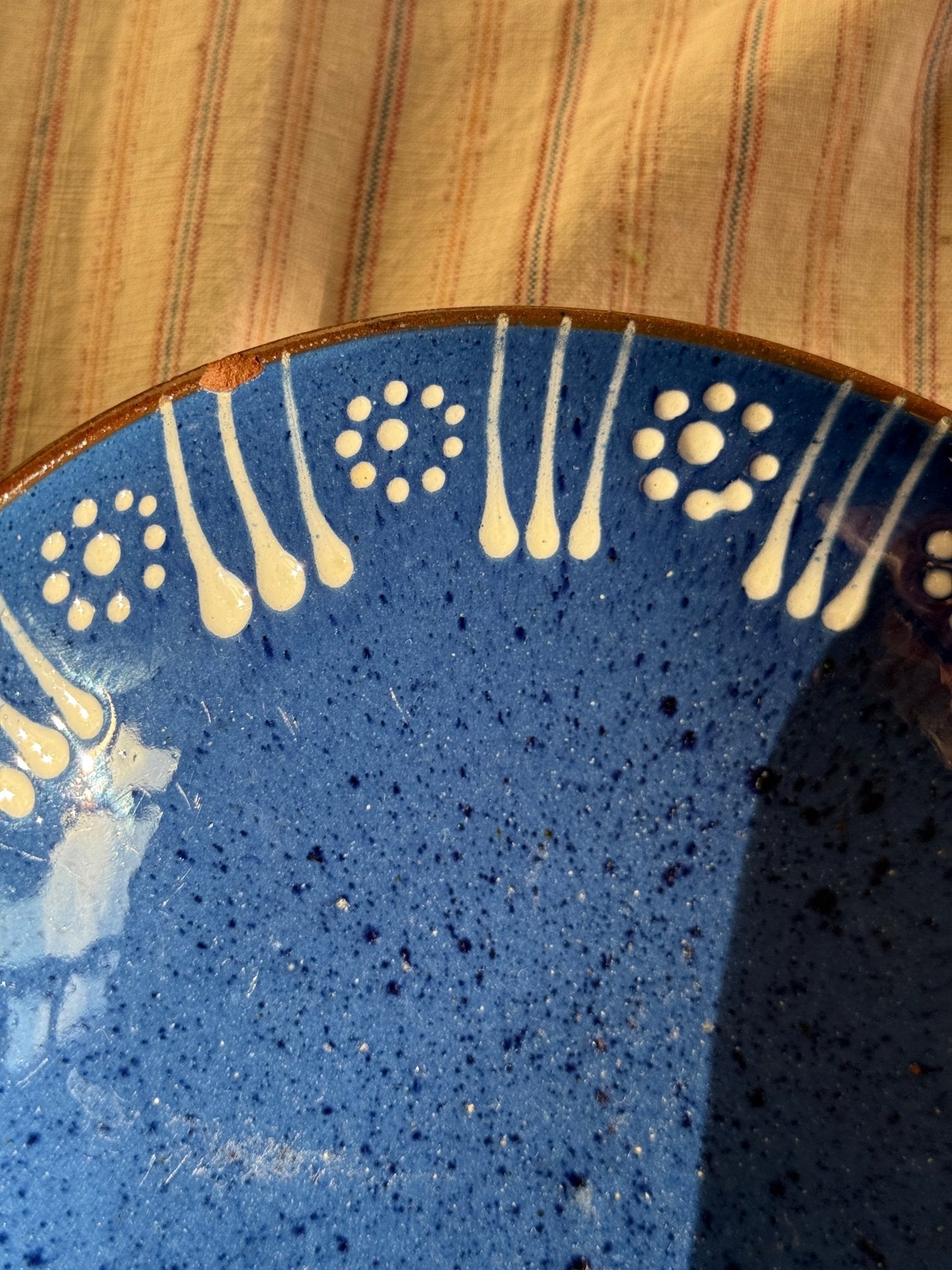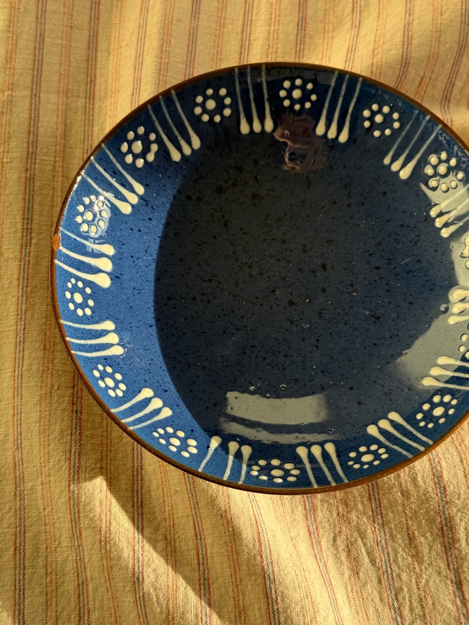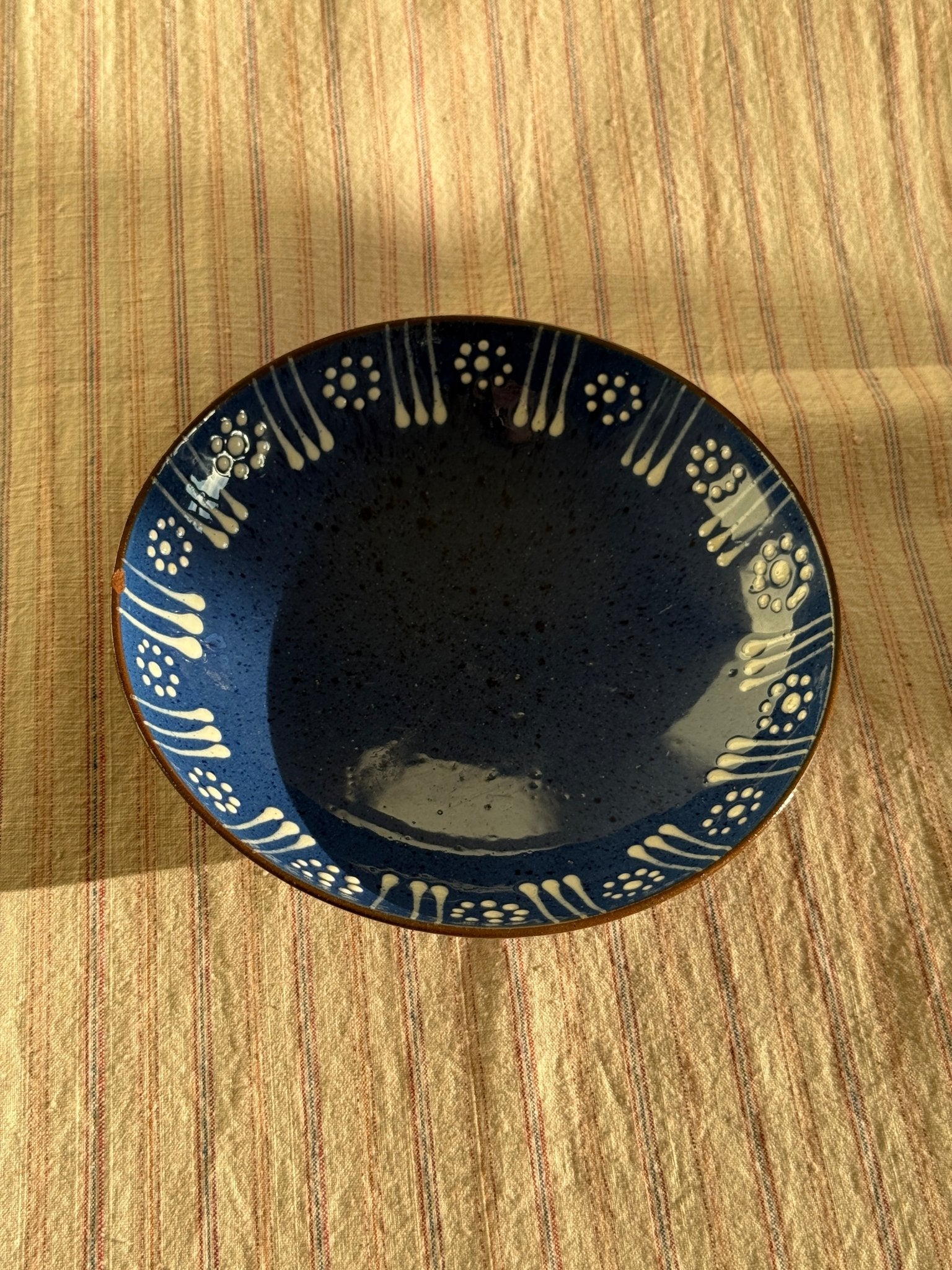 Blue ceramic bowl with handpainted decoration. One tiny notch on the edge, otherwise in excellent condition.