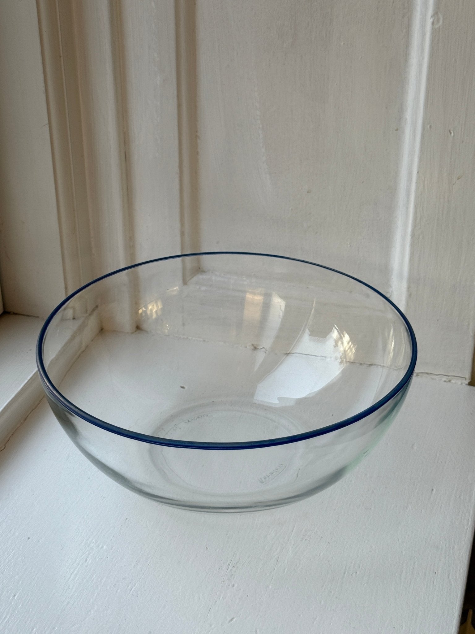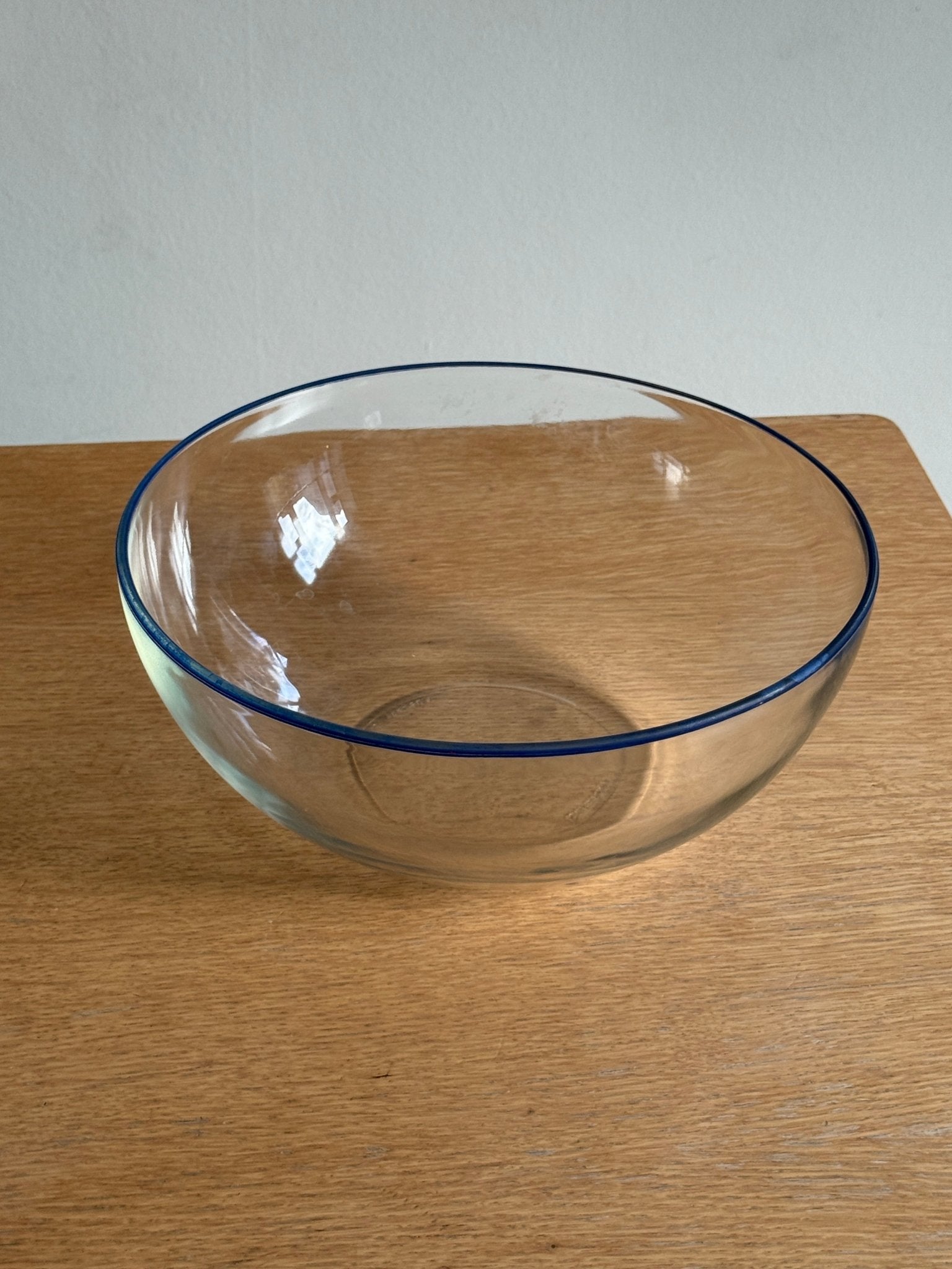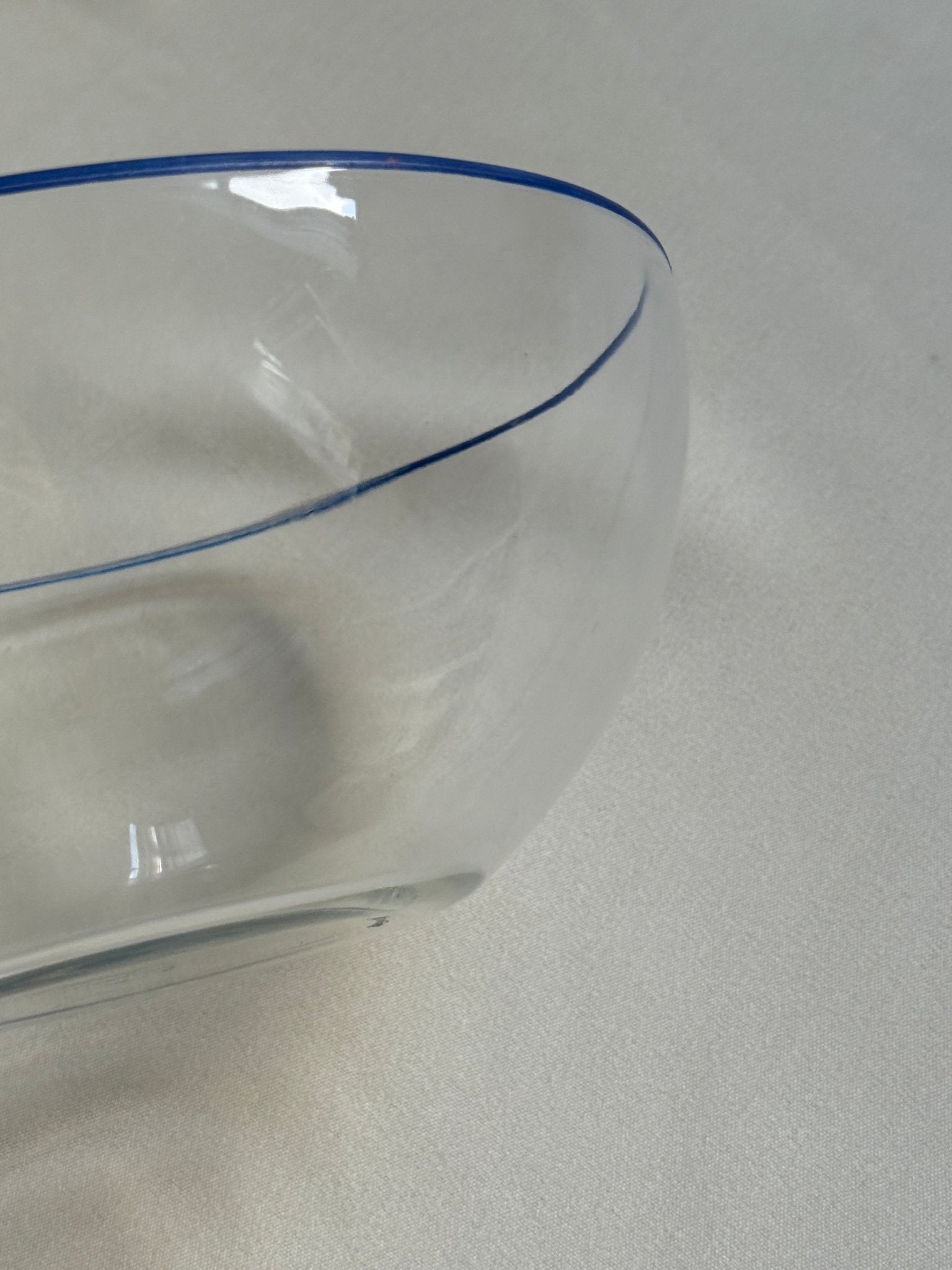 Large, beautiful glass bowl with blue rim. Bormioli, Italy. In excellent condition.
