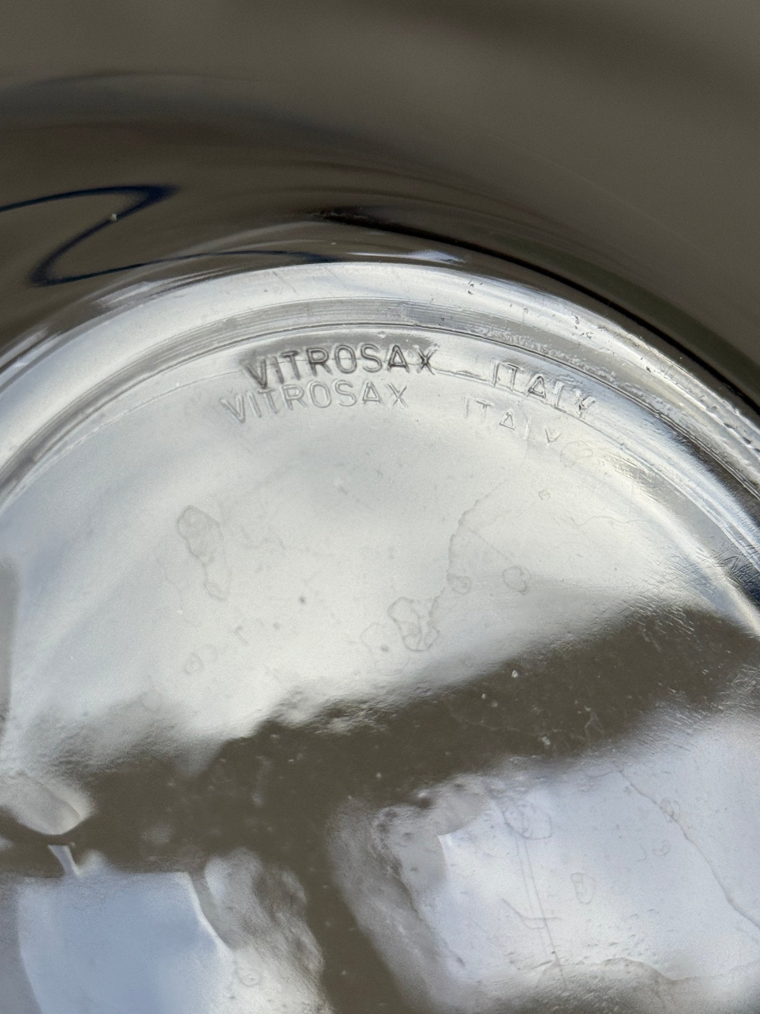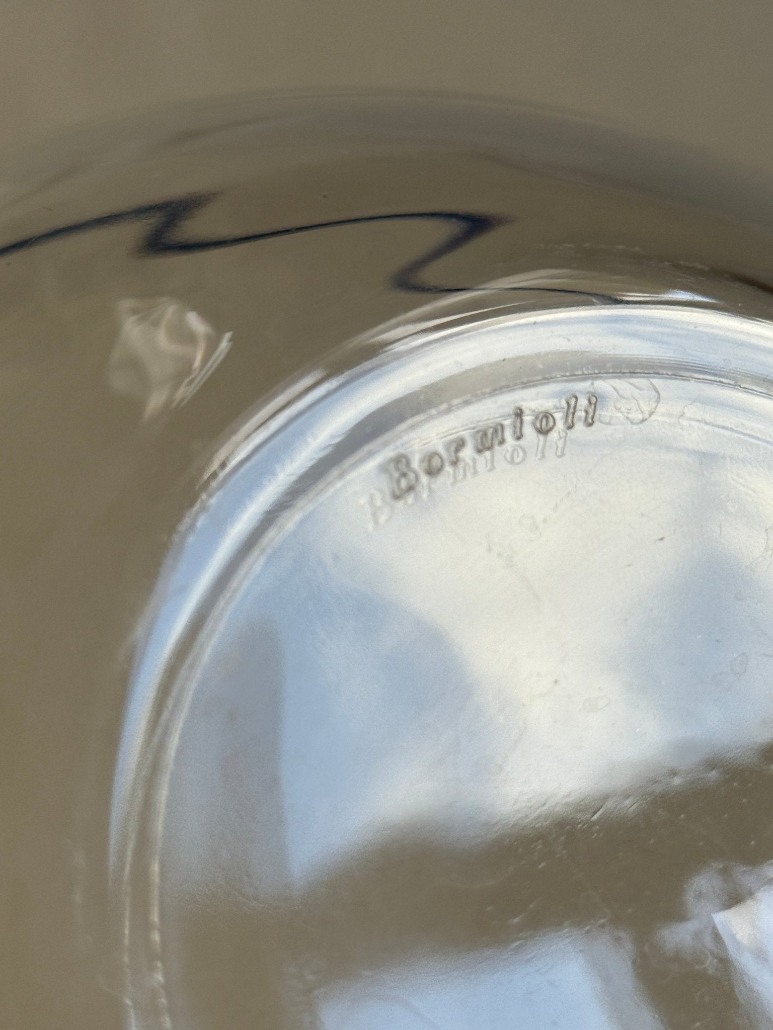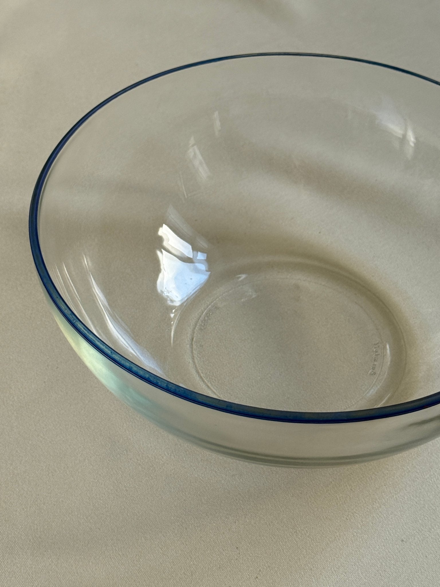 Large, beautiful glass bowl with blue rim. Bormioli, Italy. In excellent condition.