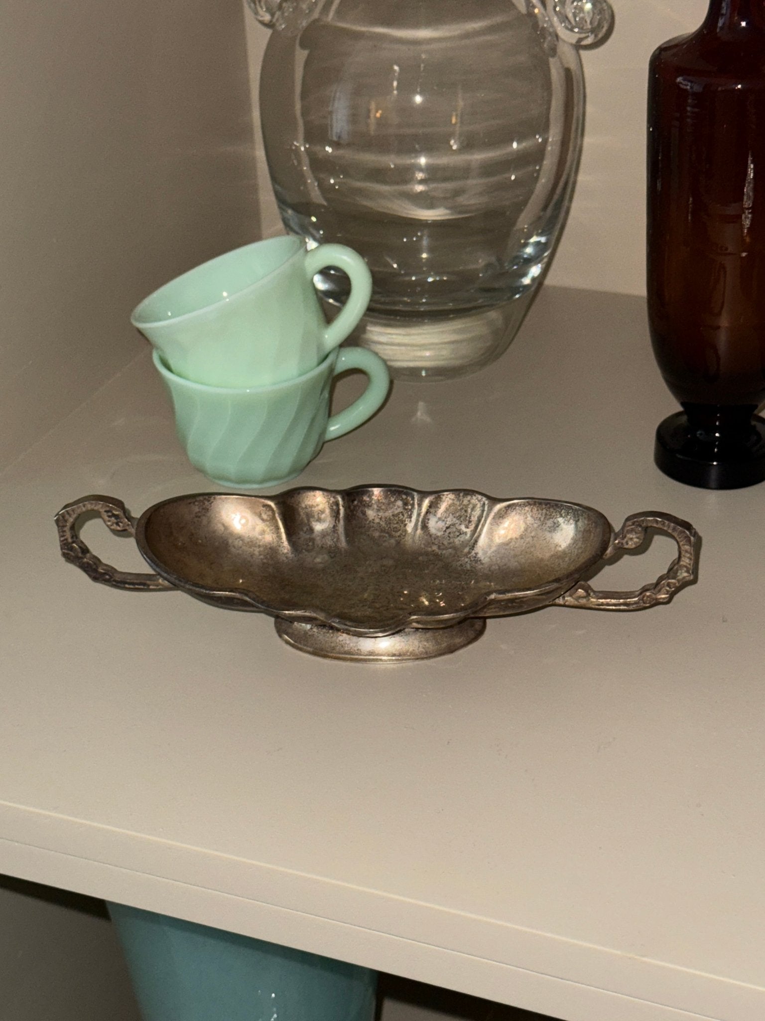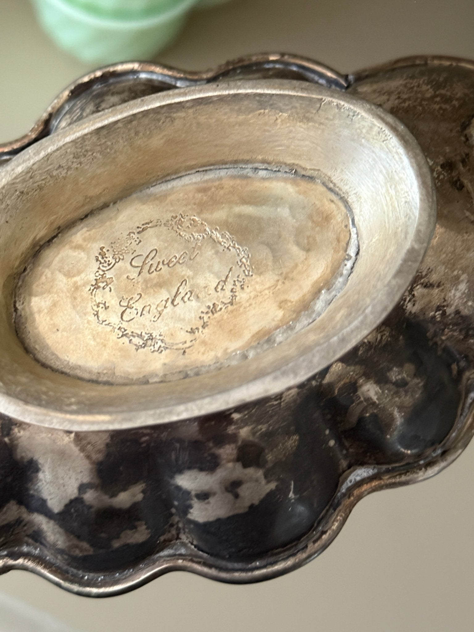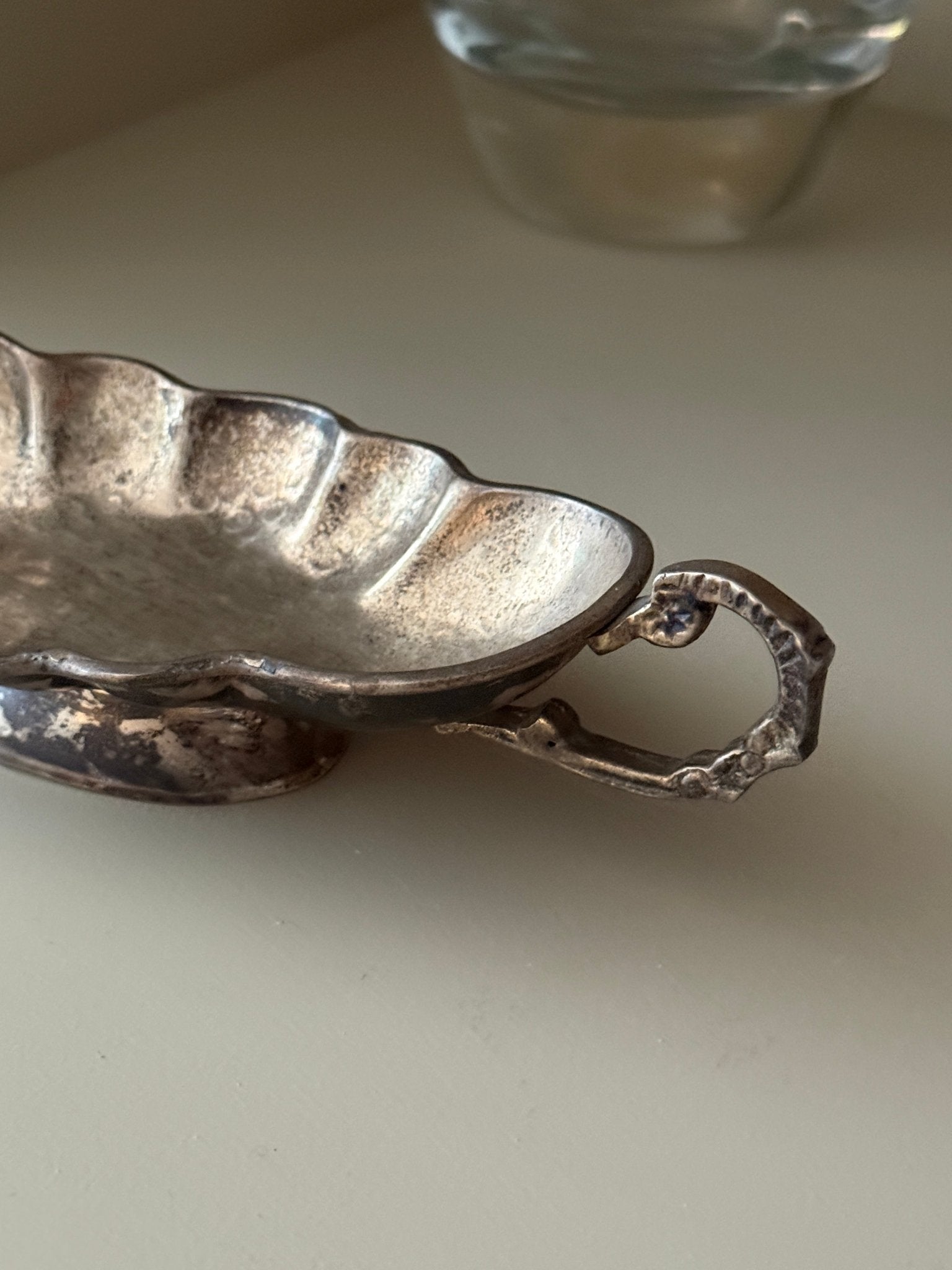 Scalloped serving dish with handles. Silver plated. Origin: England, found in Italy. Patina appears, but still in lovely condition.