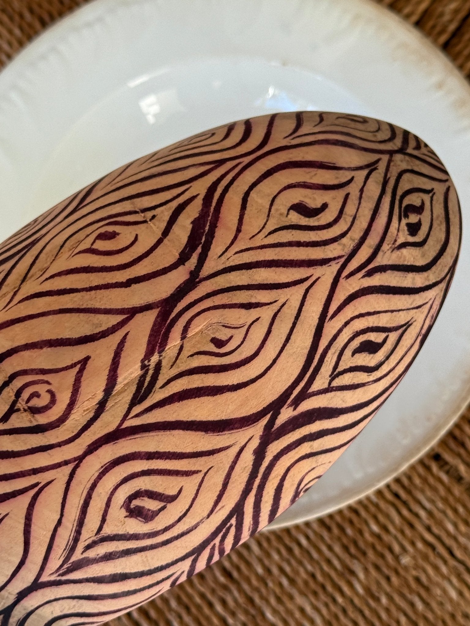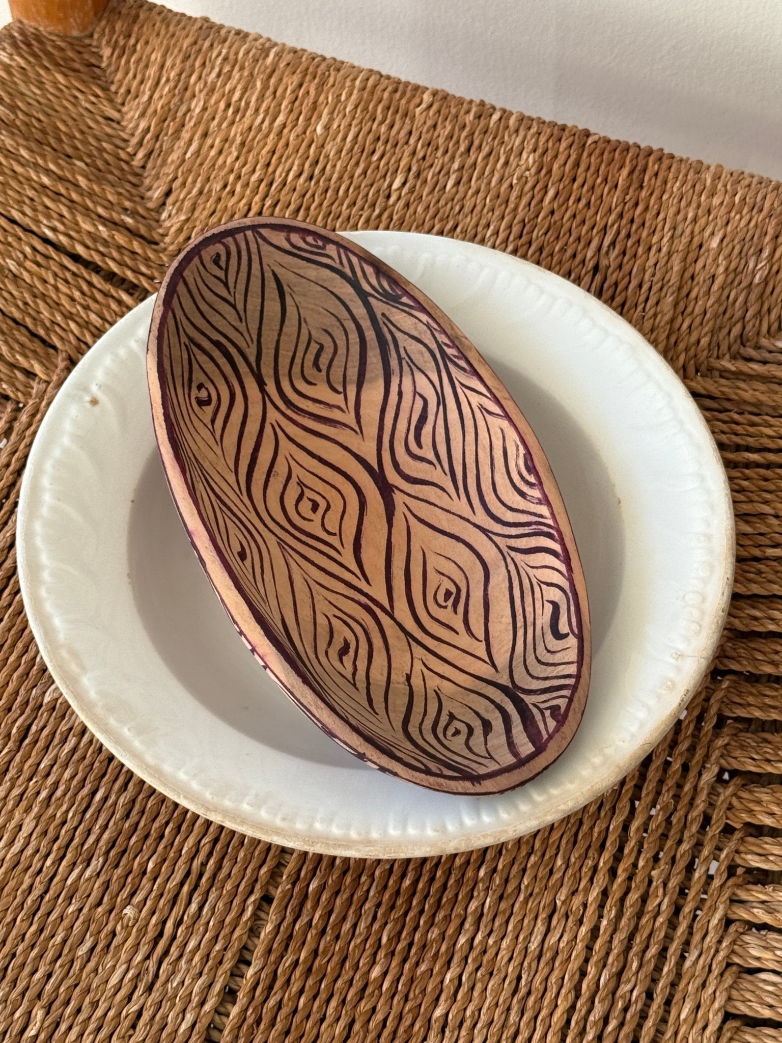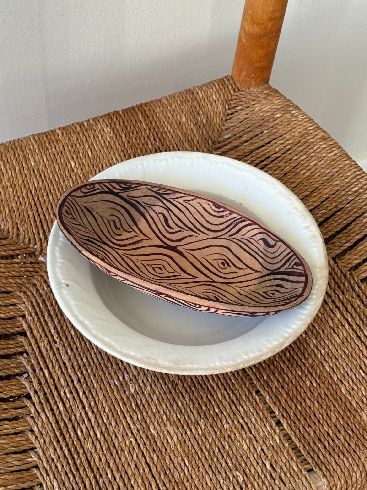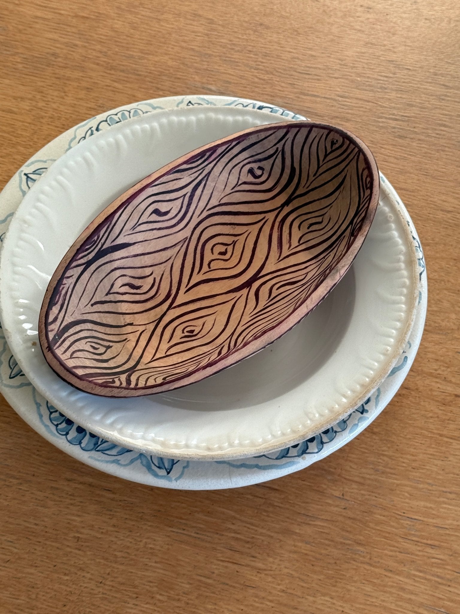Wooden dish with wavy decoration. Found in Italy. In excellent condition, though it’s a little wobbly.