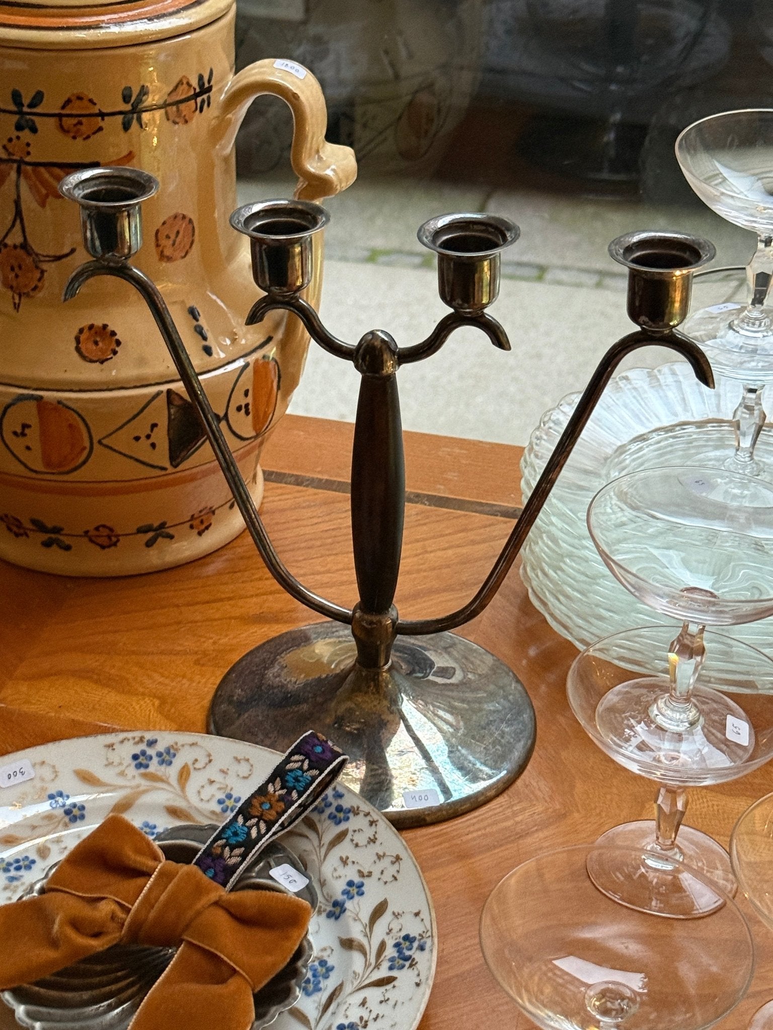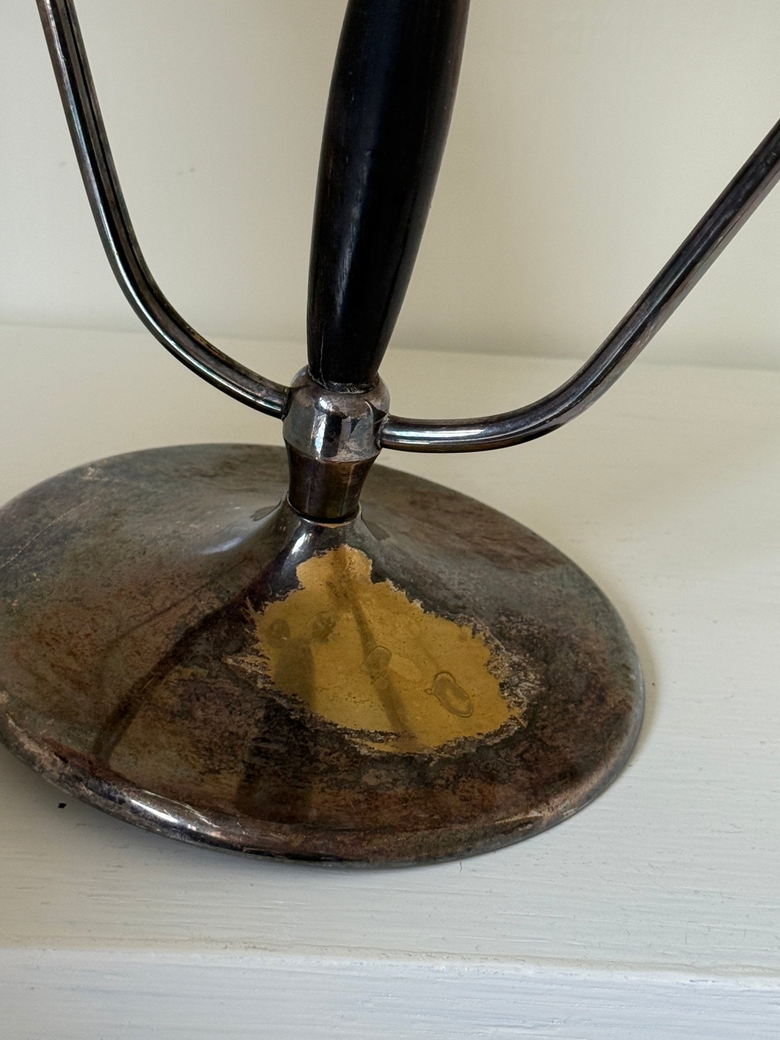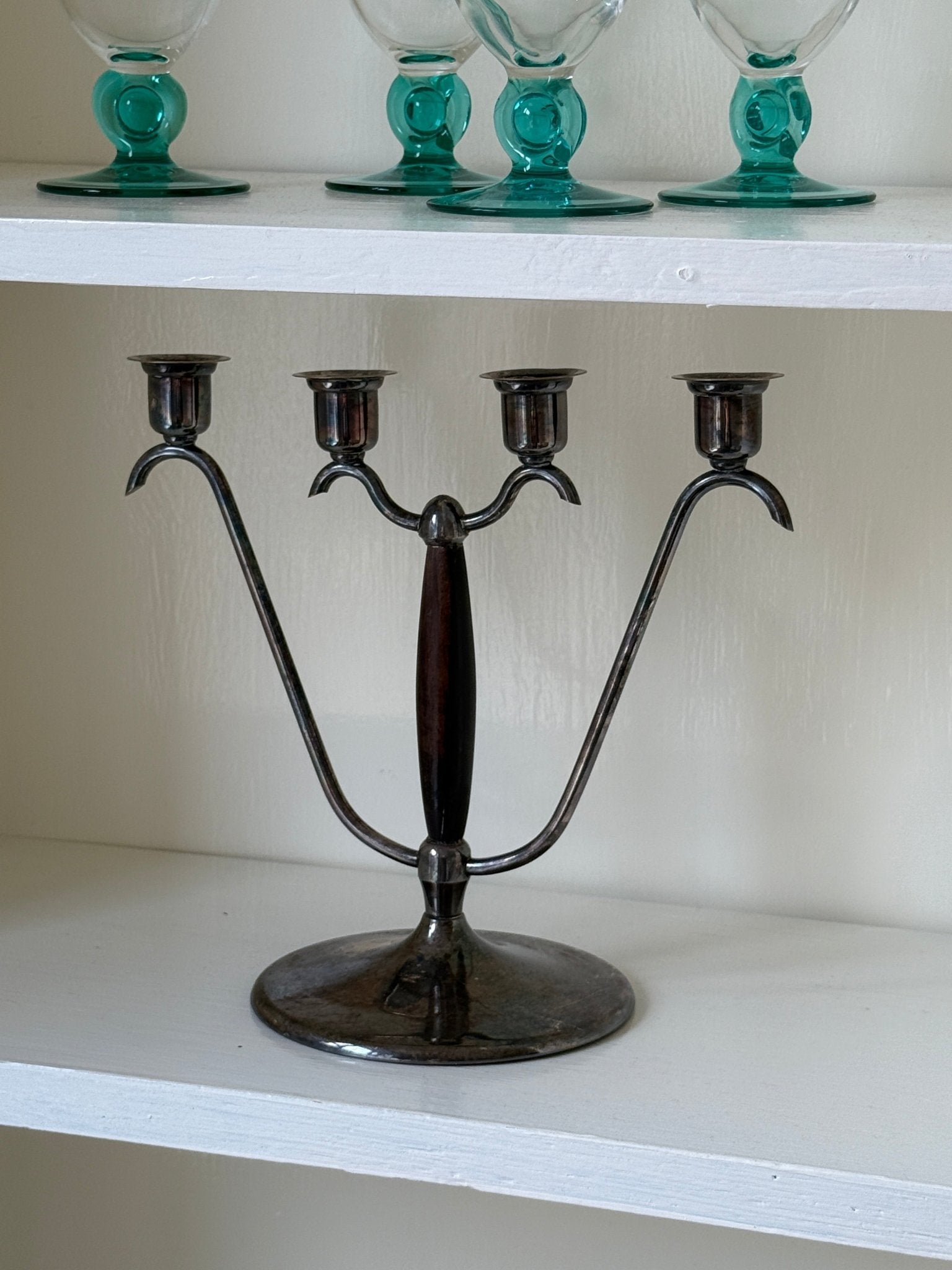 Beautiful Advent candleholder in silver plate and wood. It has a small area of wear to the silver plating on the base, but it still stands beautifully.