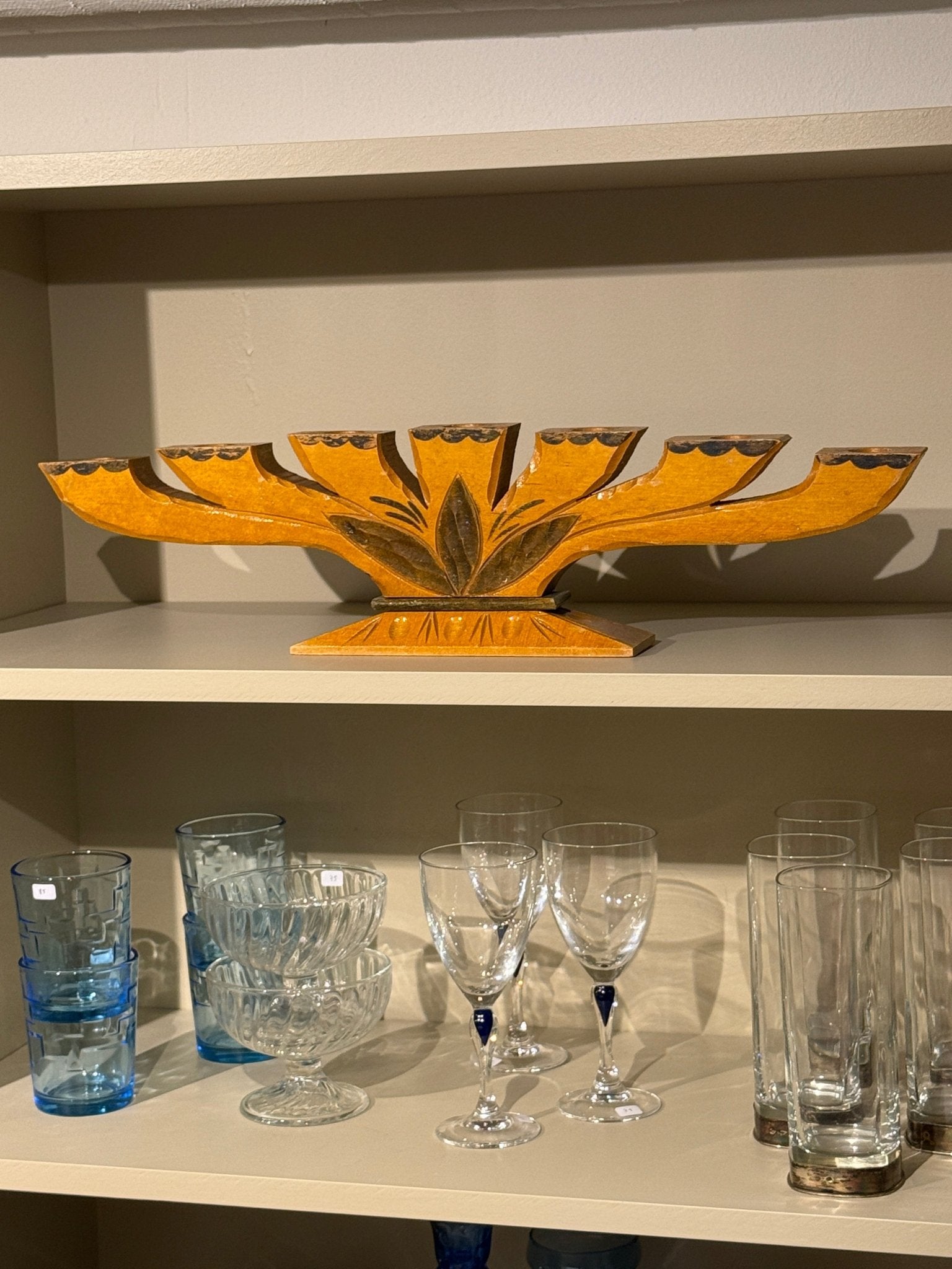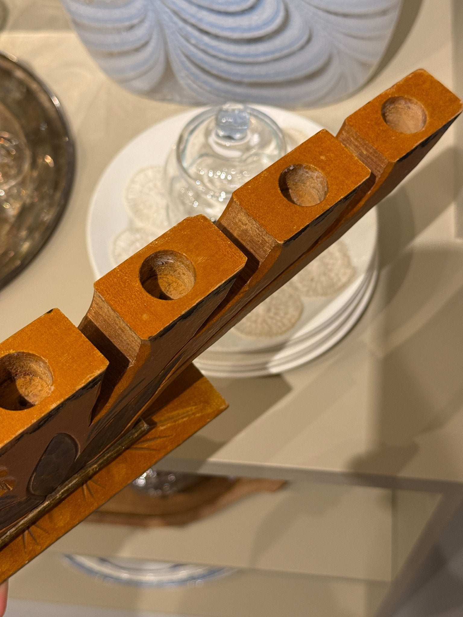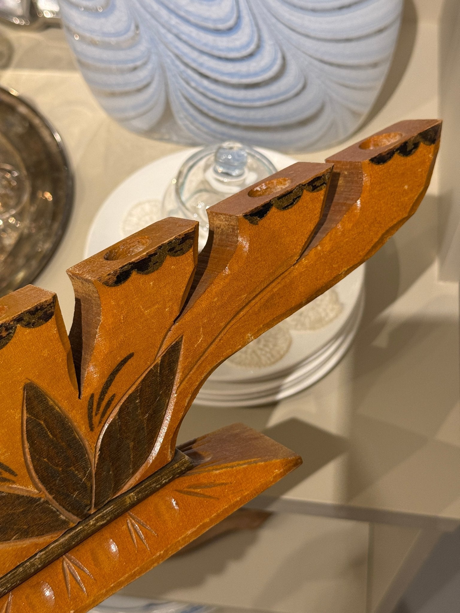 Swedish wooden candelabra with carvings. Fits normal candles. In excellent condition.