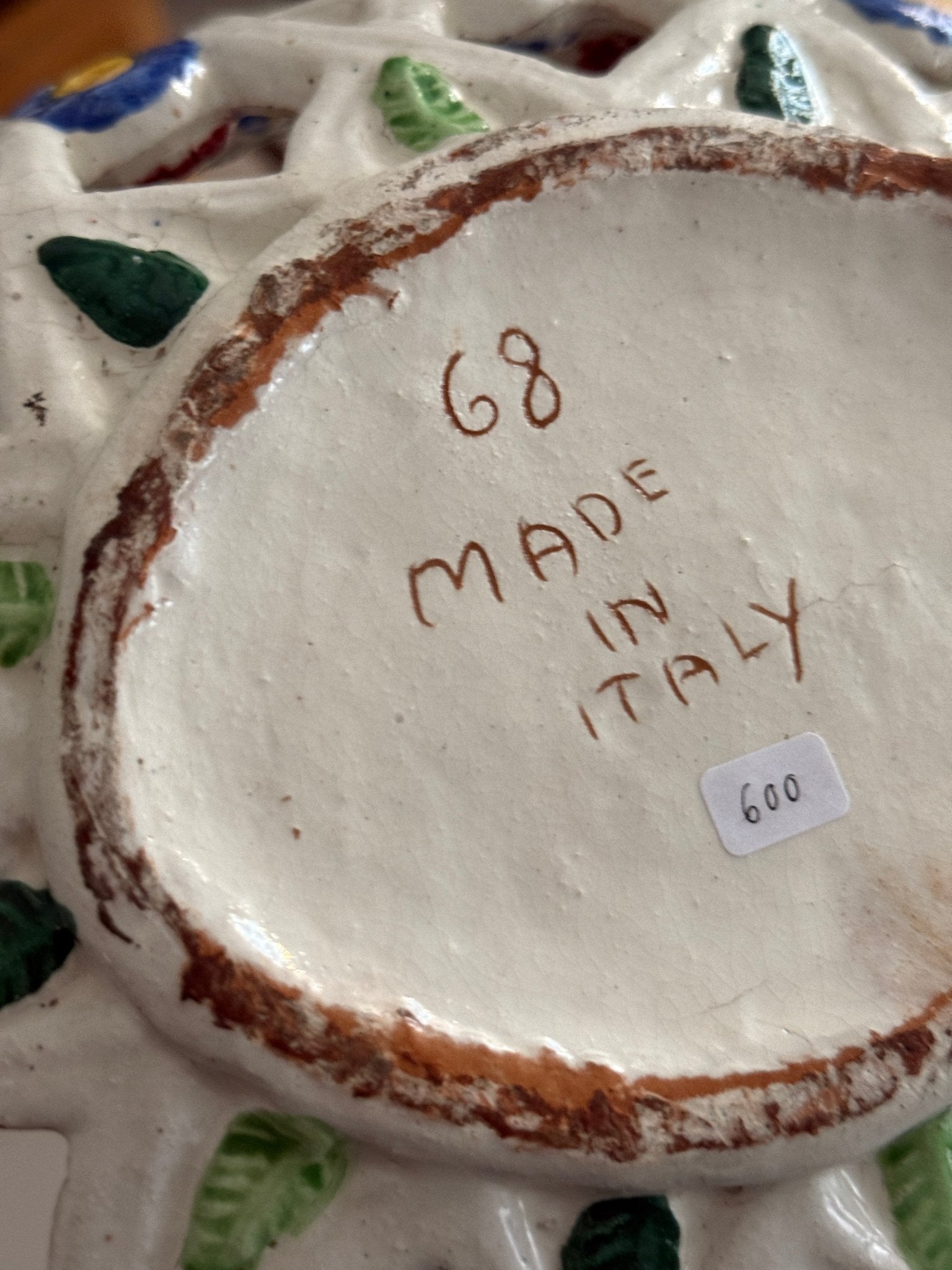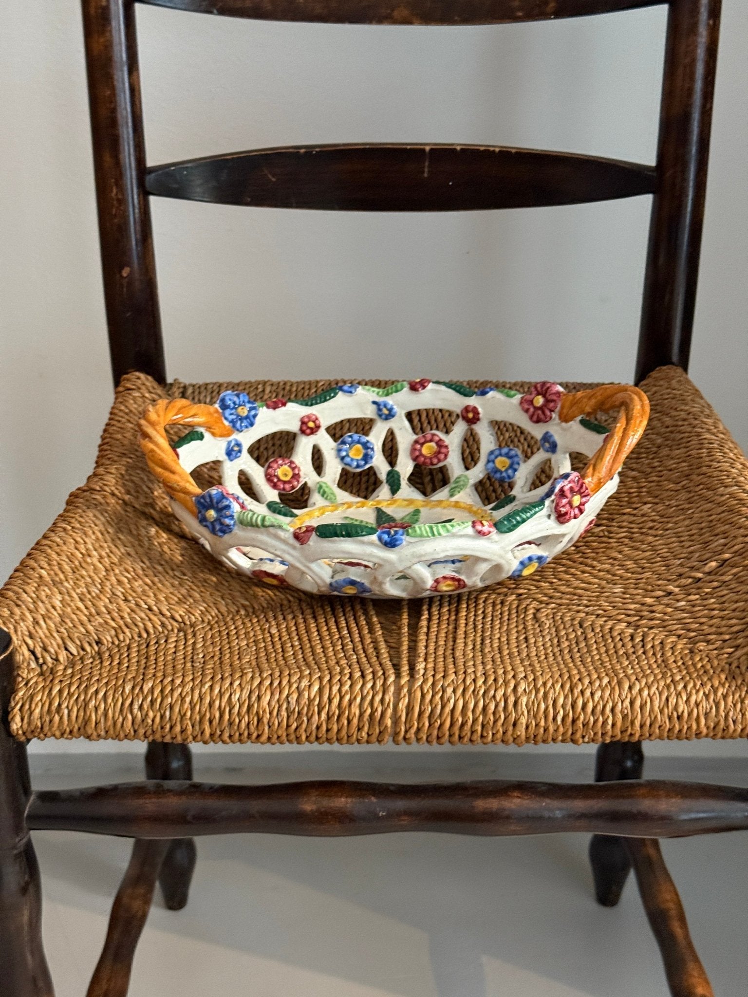 Italian floral ceramic basket. Minor patina consistent with age, otherwise in beautiful condition.