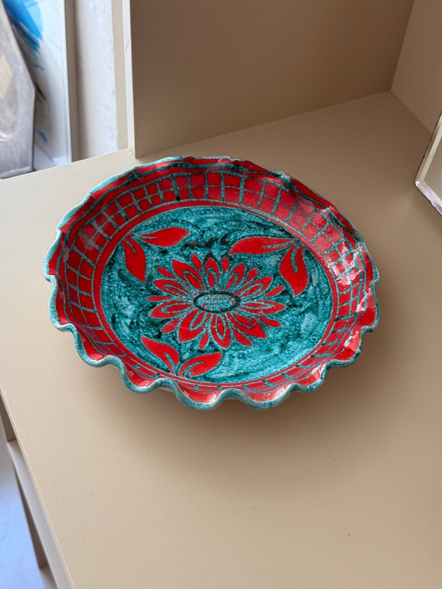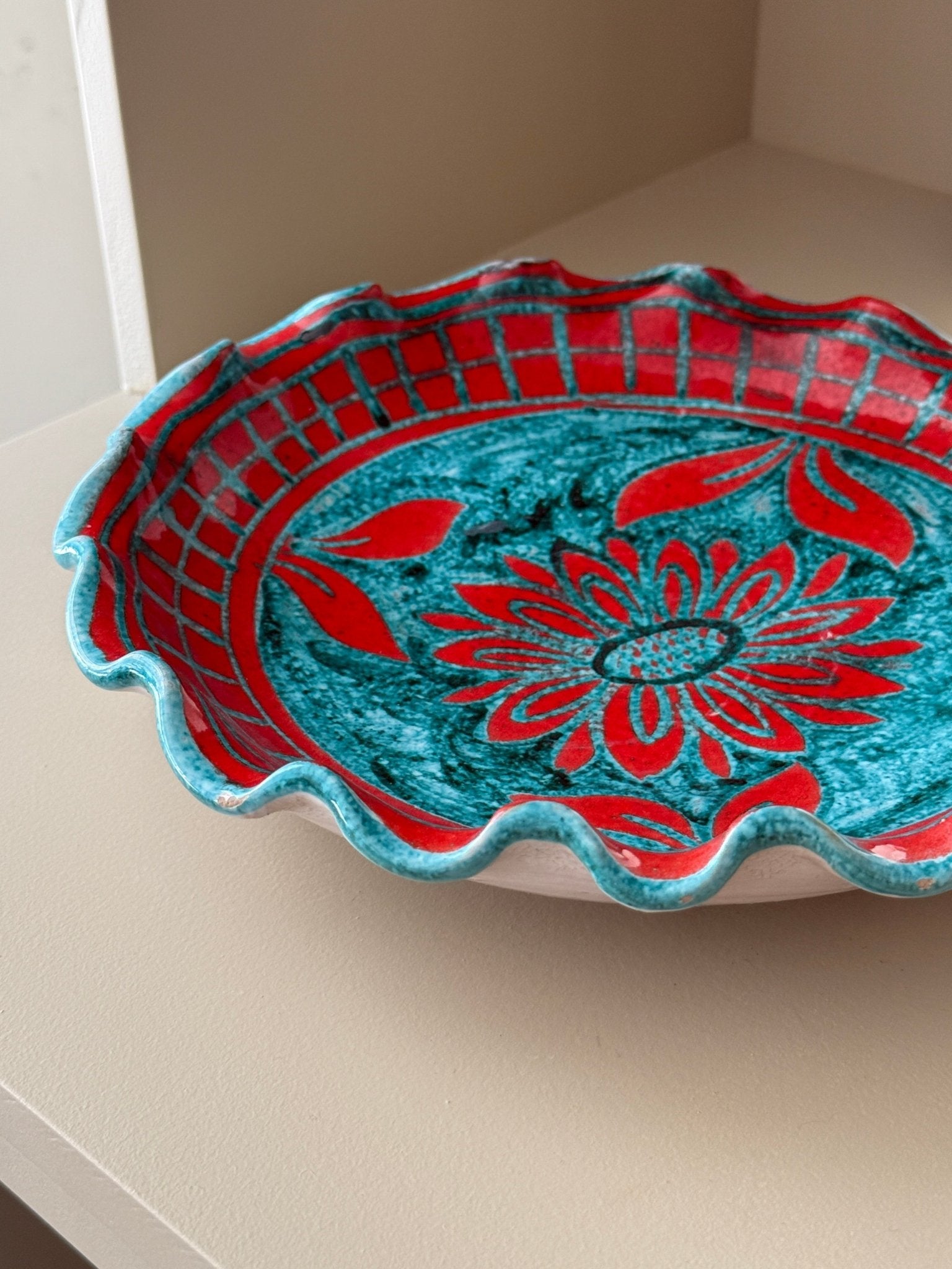 Stunning ceramic bowl with curved edges in vibrant colours, made in Italy. Can be displayed on the wall or used as a fruit bowl. Wall mount is included.