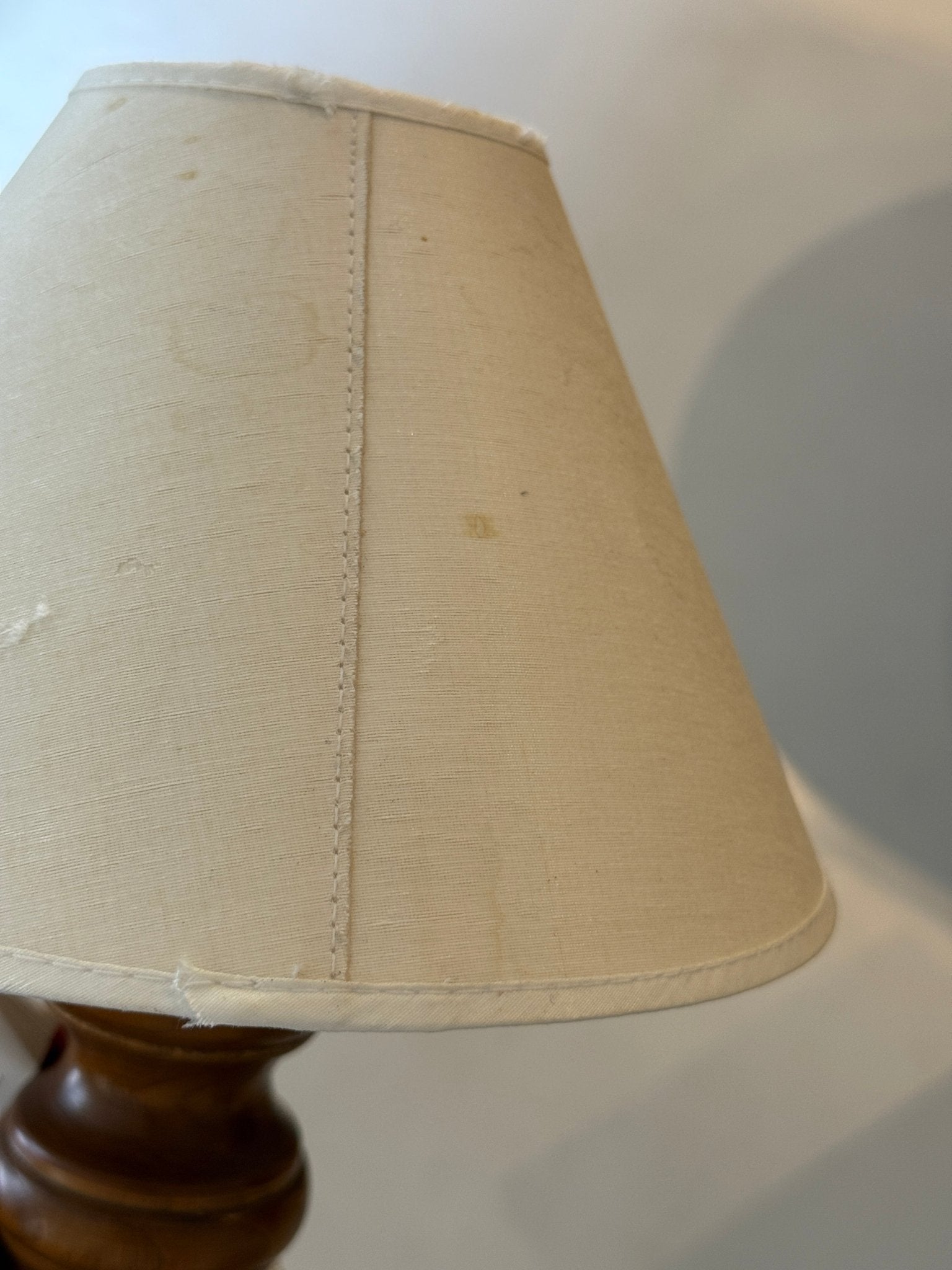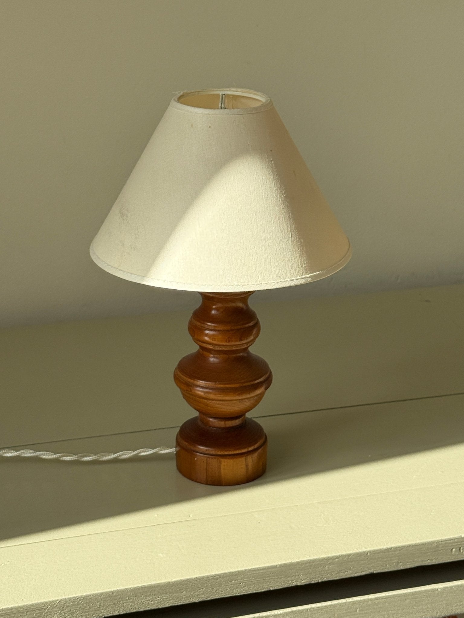 Wooden table lamp. Italy. A new fabric cord has been added. In excellent condition. The shade is included, but has lots of wear. Fits an E14 bulb.