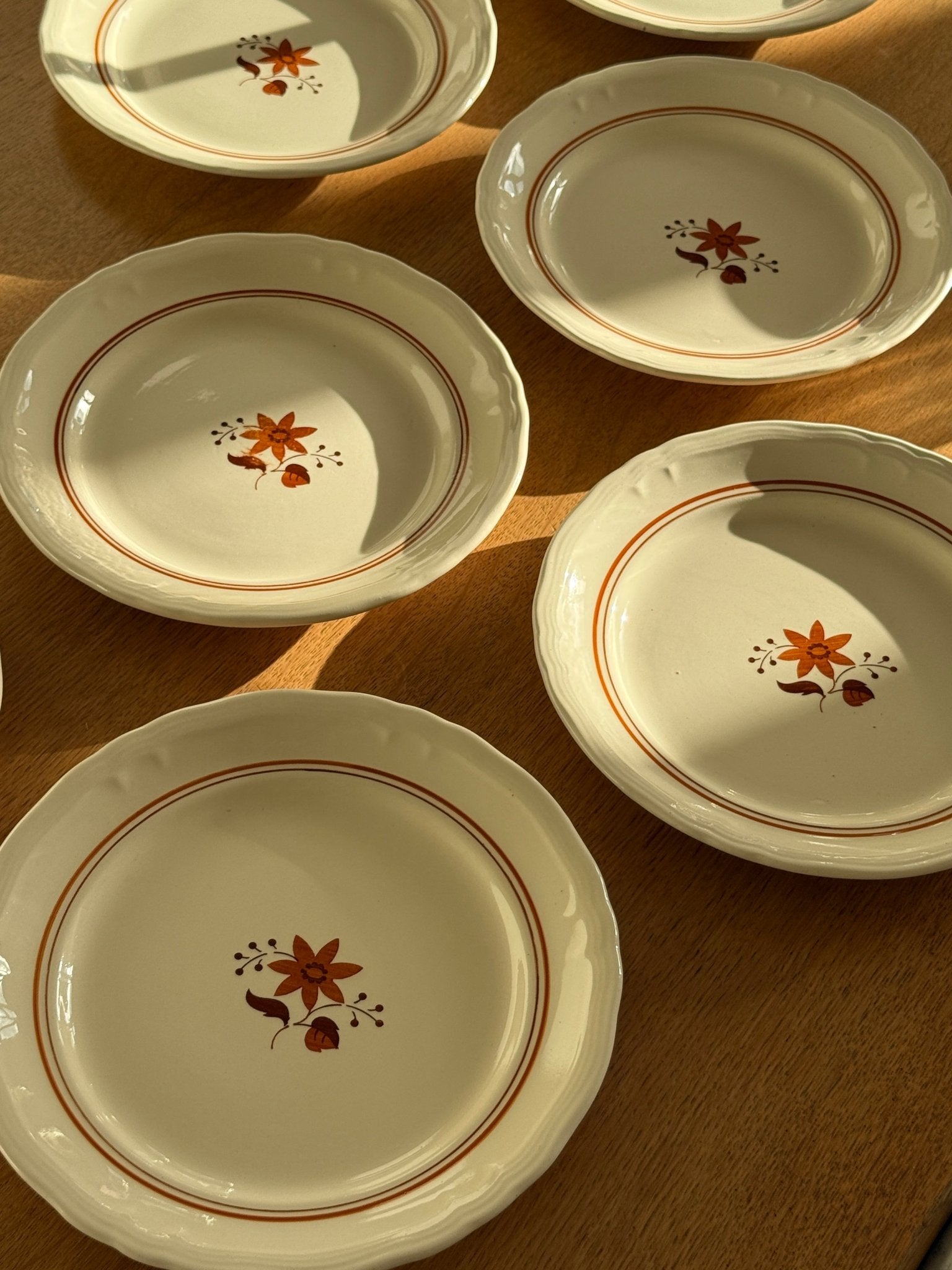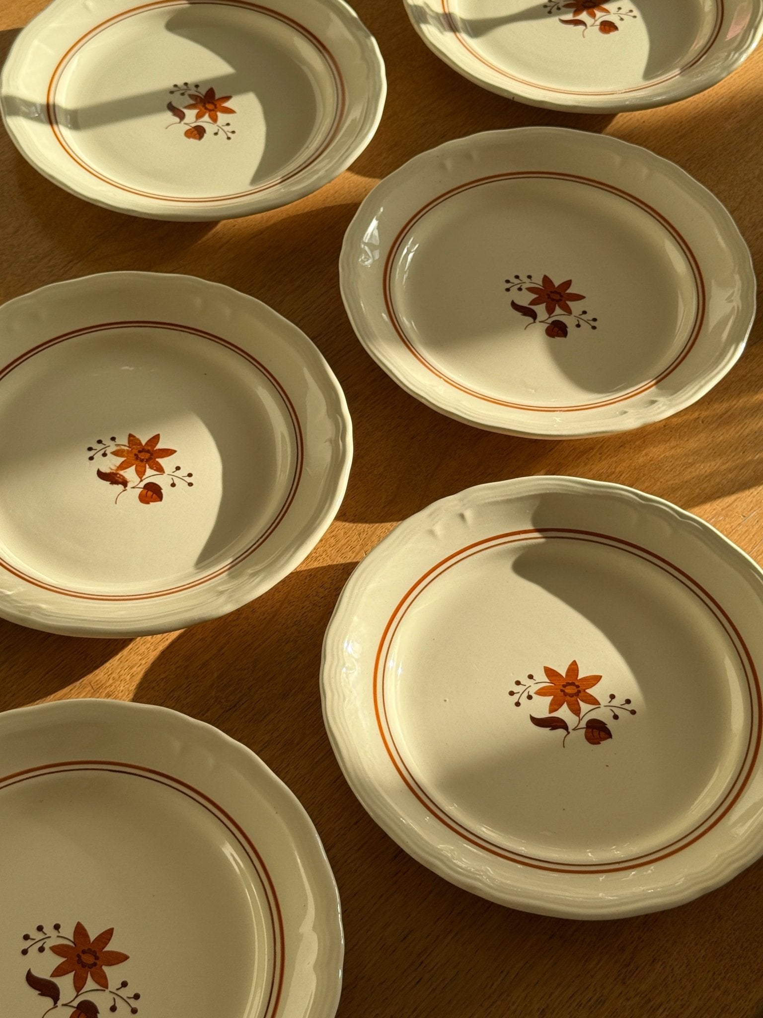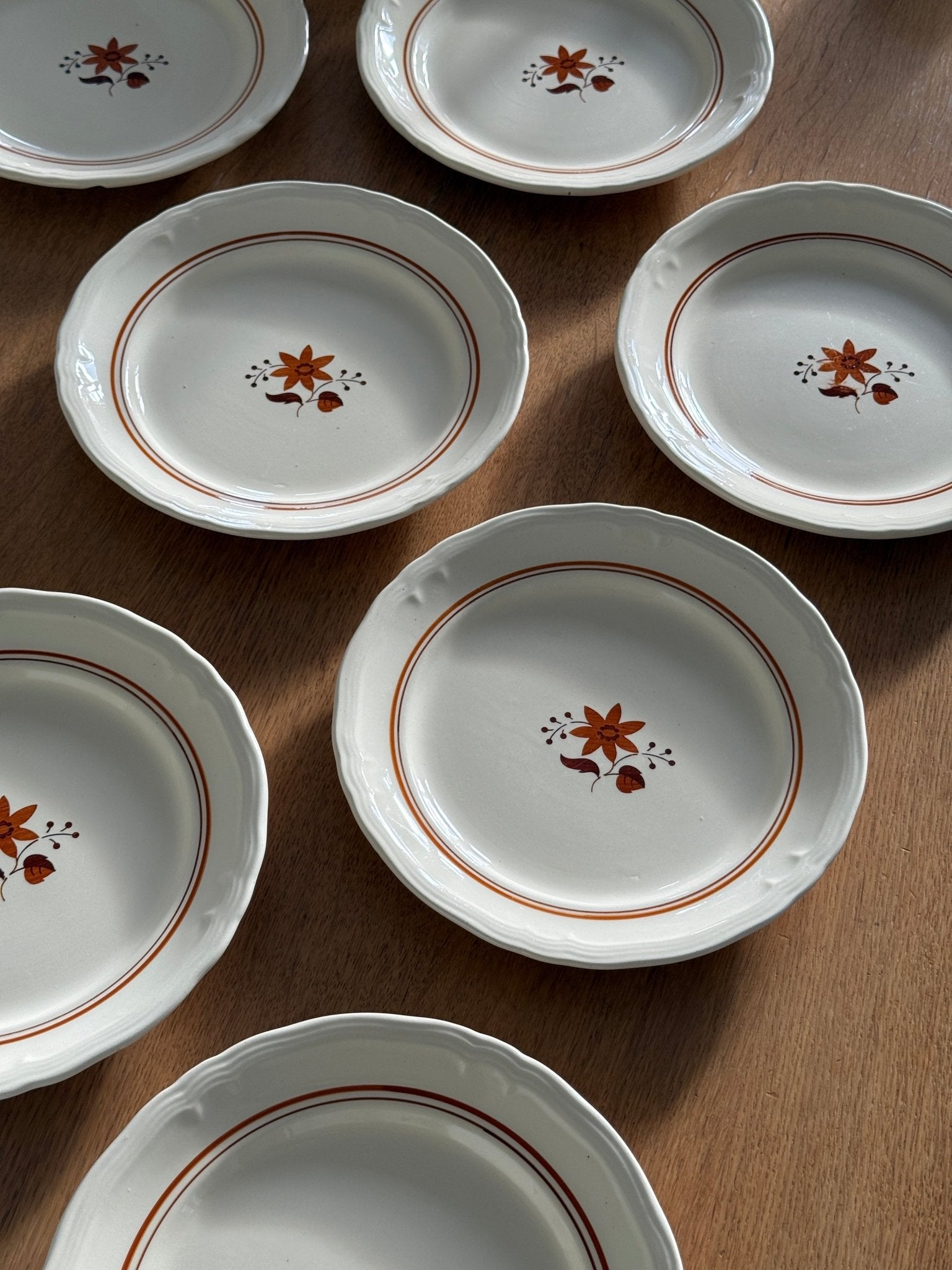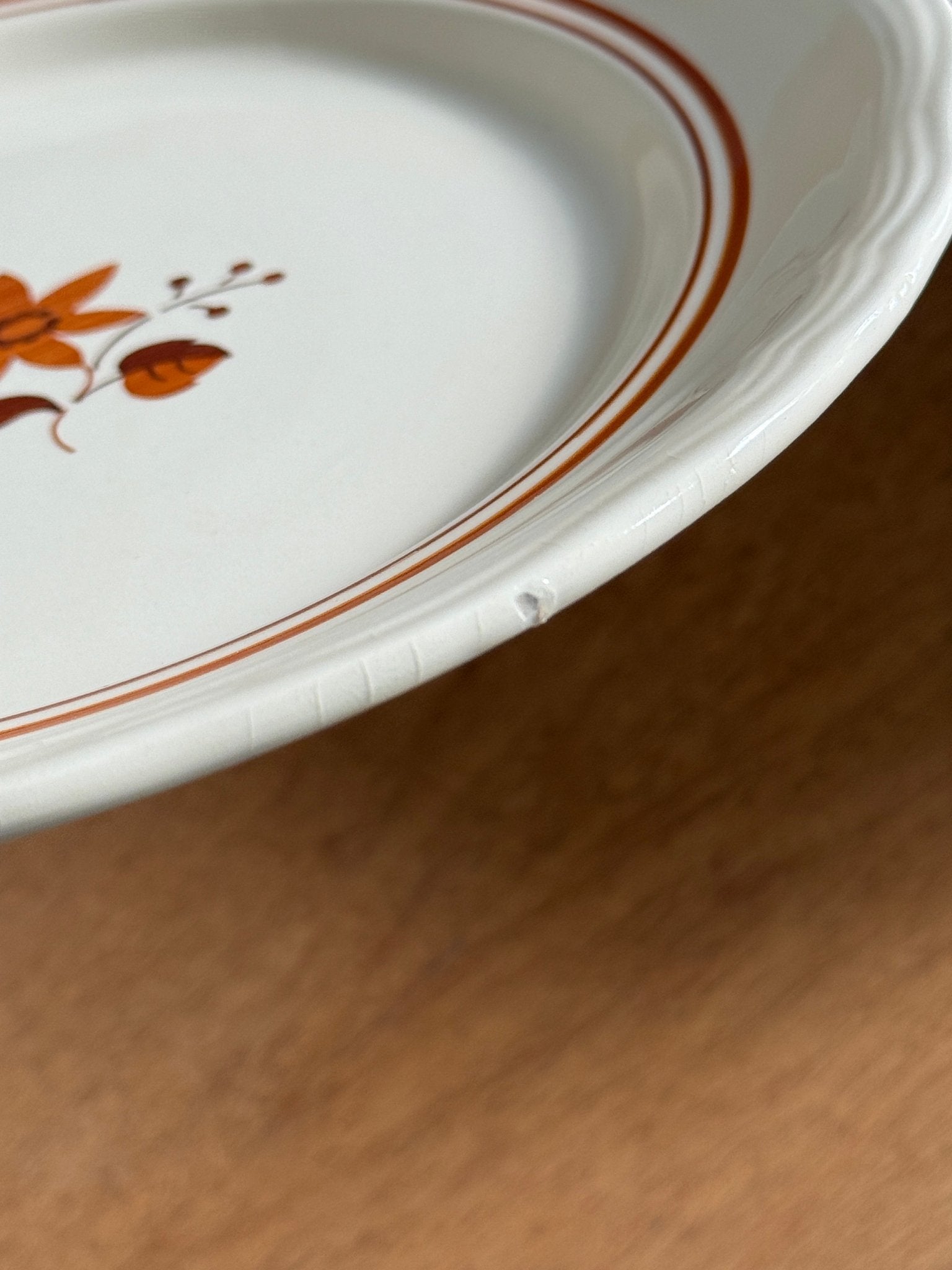 Orange floral dinner plates. 9 pcs available, price is per piece. In very good condition though 3 plates have one cut each as shown on the photos.