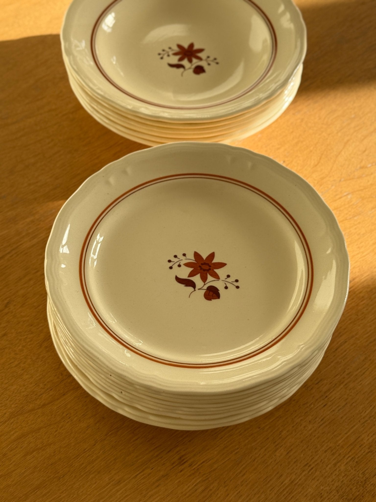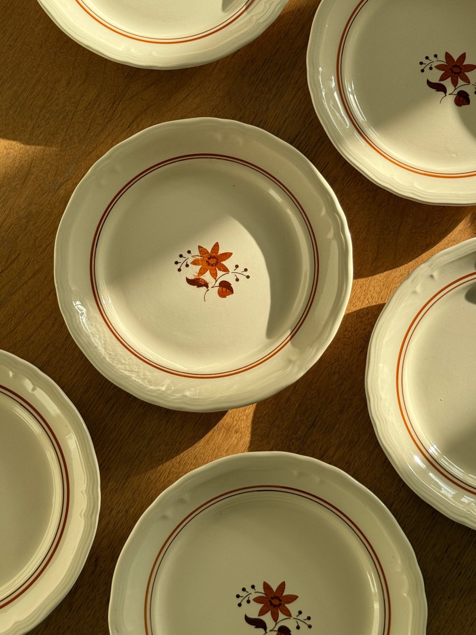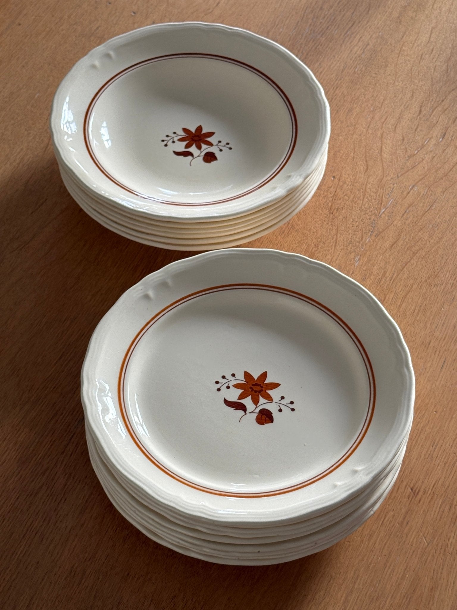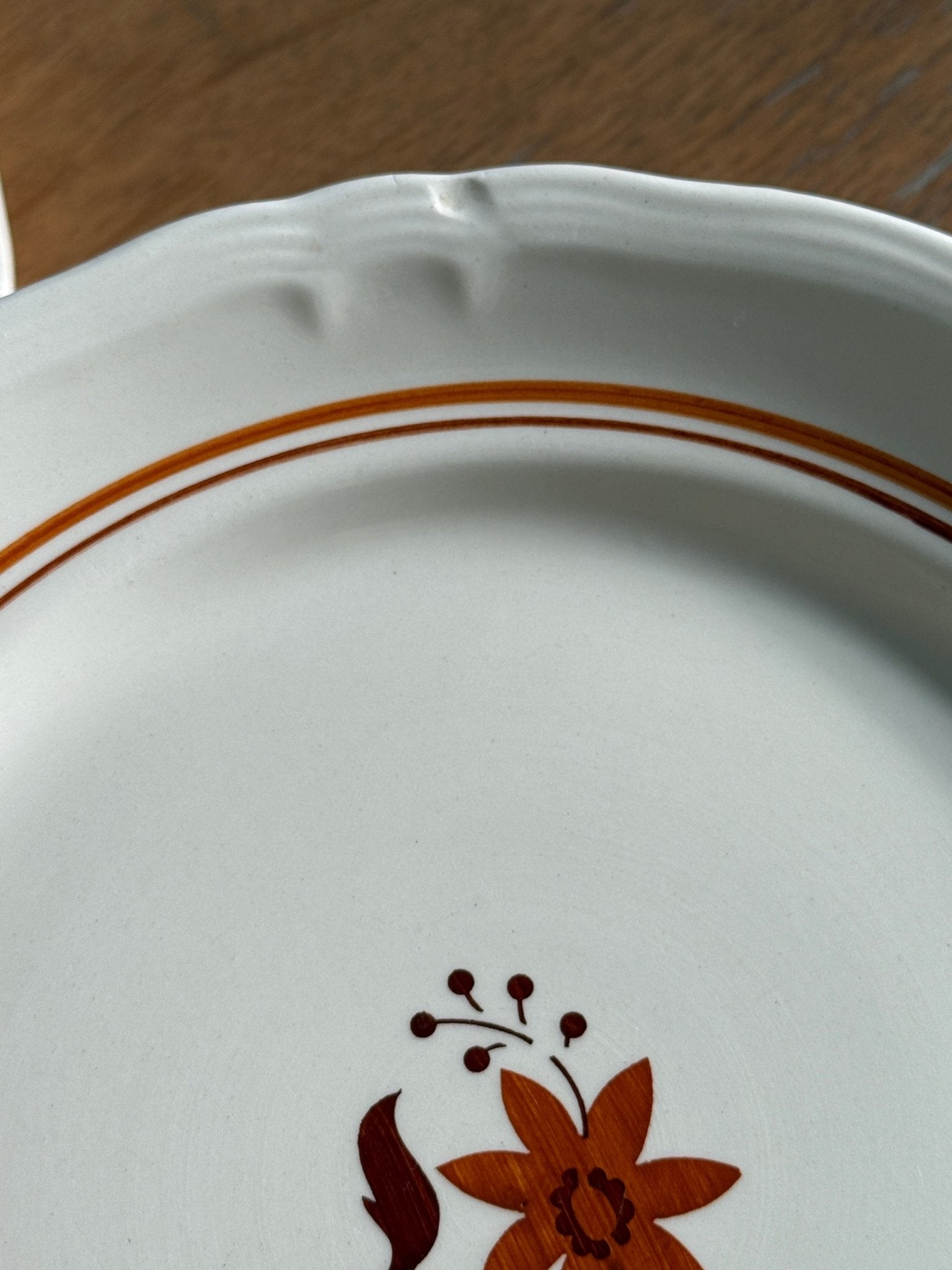 Orange floral dinner plates. 9 pcs available, price is per piece. In very good condition though 3 plates have one cut each as shown on the photos.