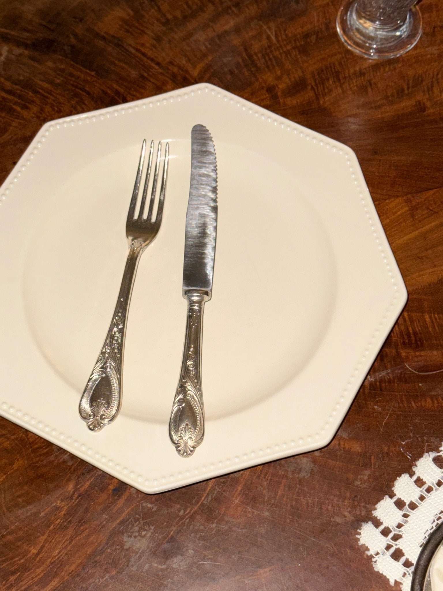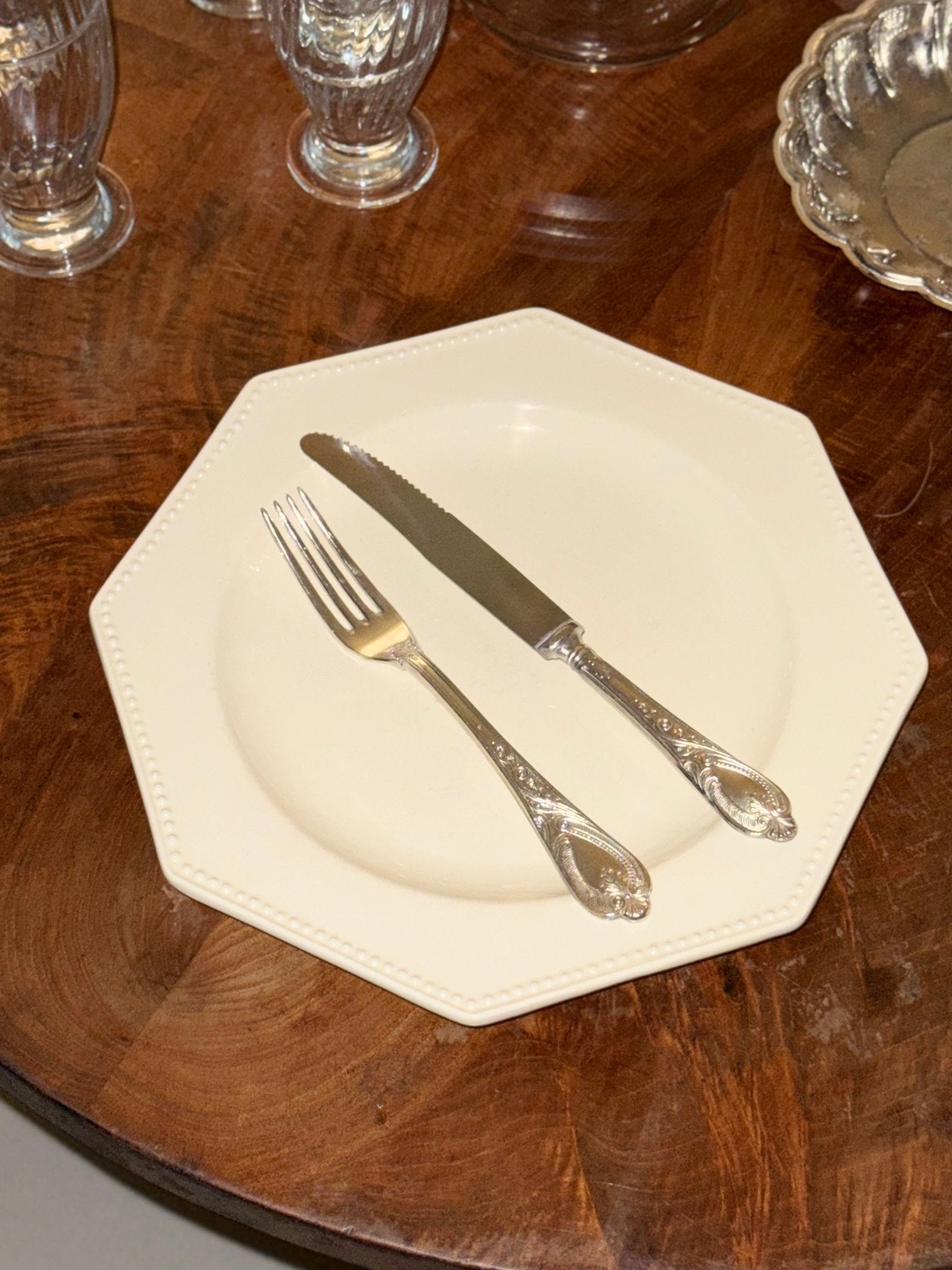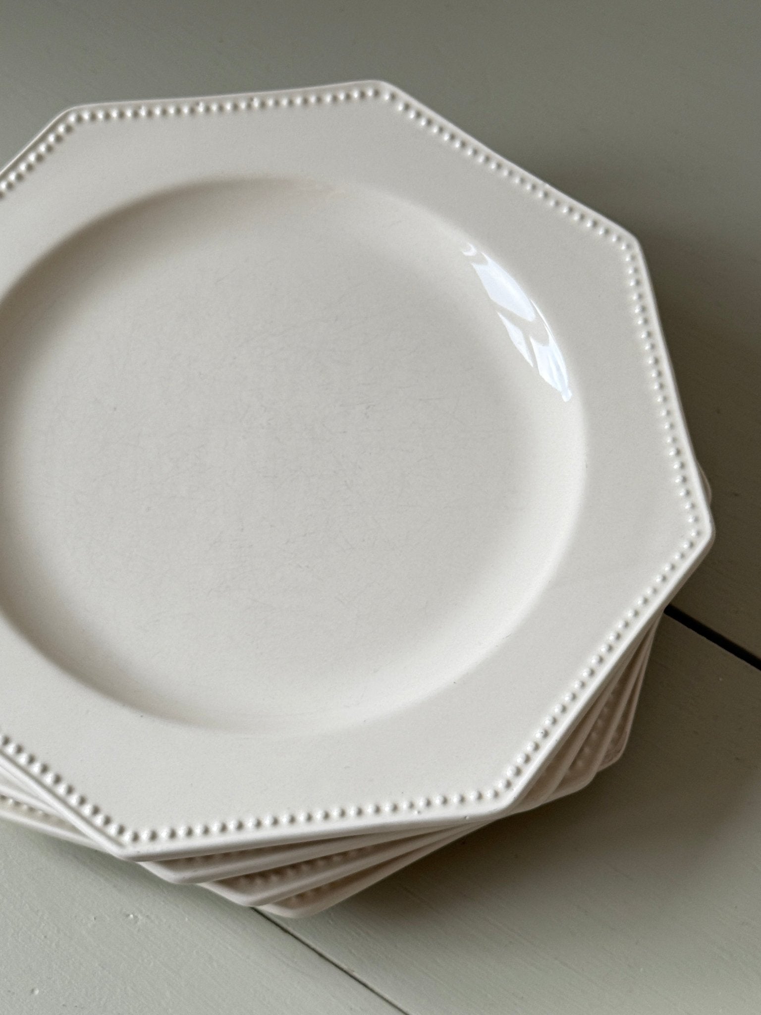 Octagonal platter with pearl edge. In excellent condition except for minor scratches as shown in the photos.