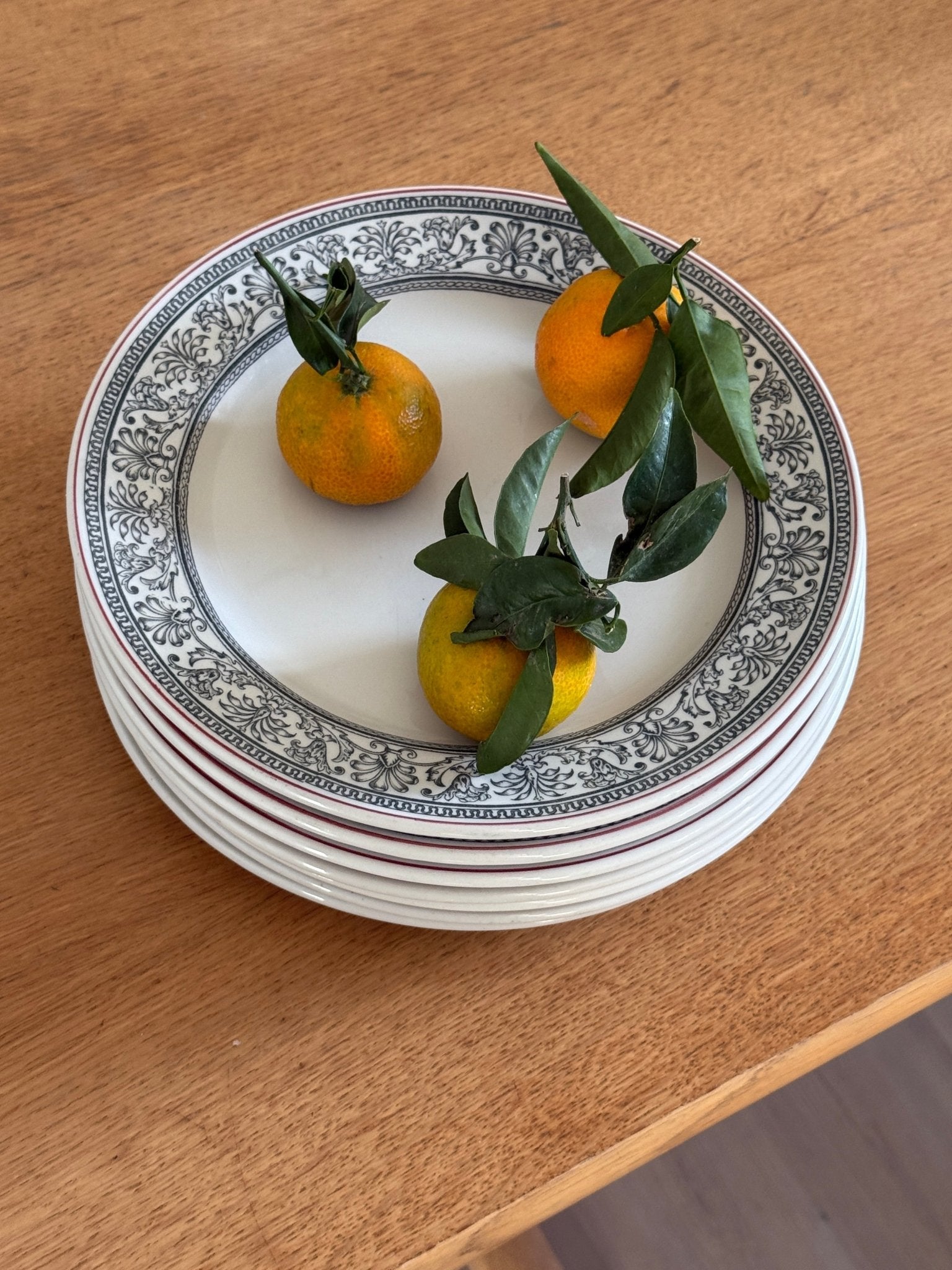 Red striped dinner plates with floral pattern. England. 12 pcs available. In excellent condition.