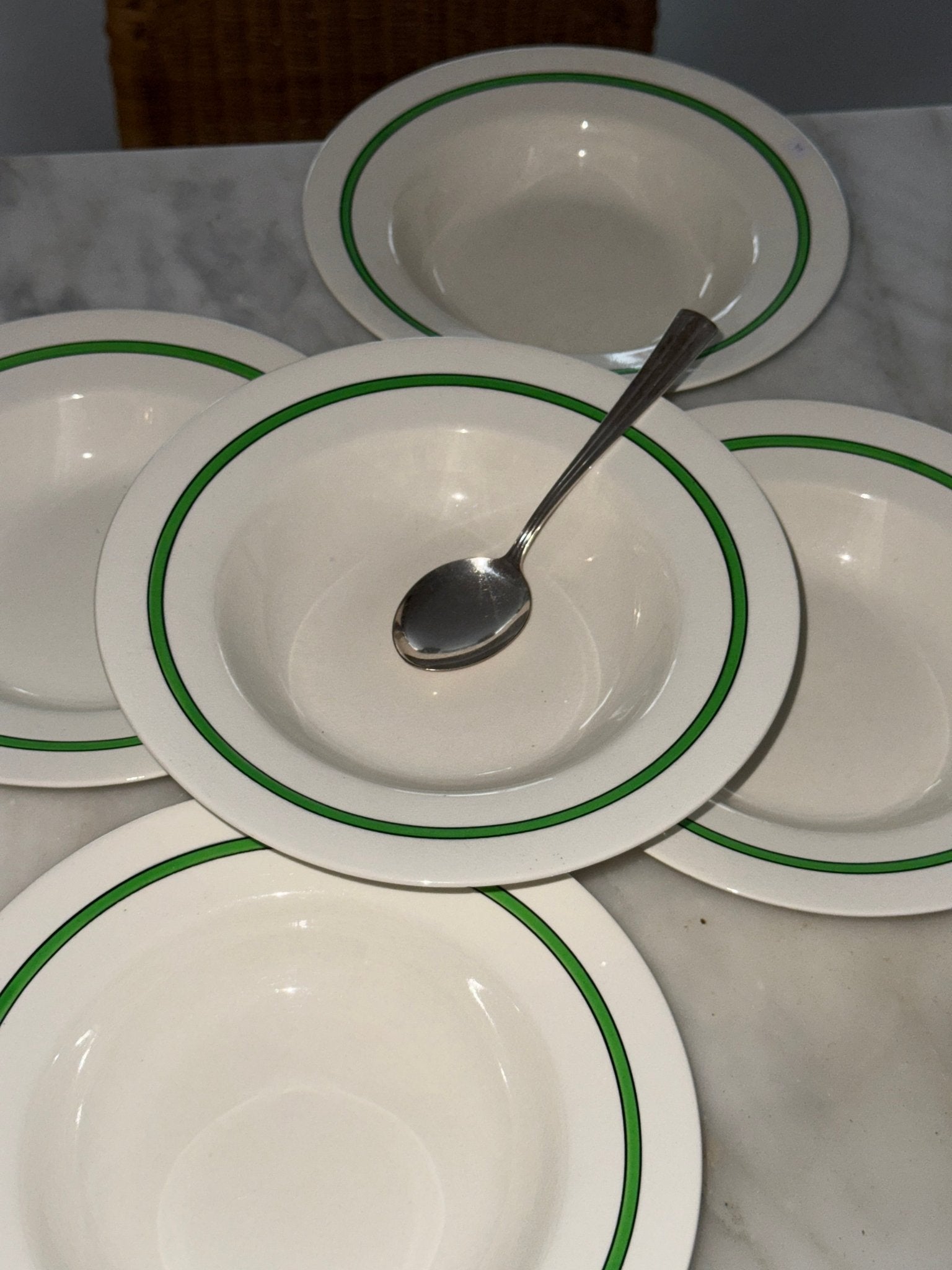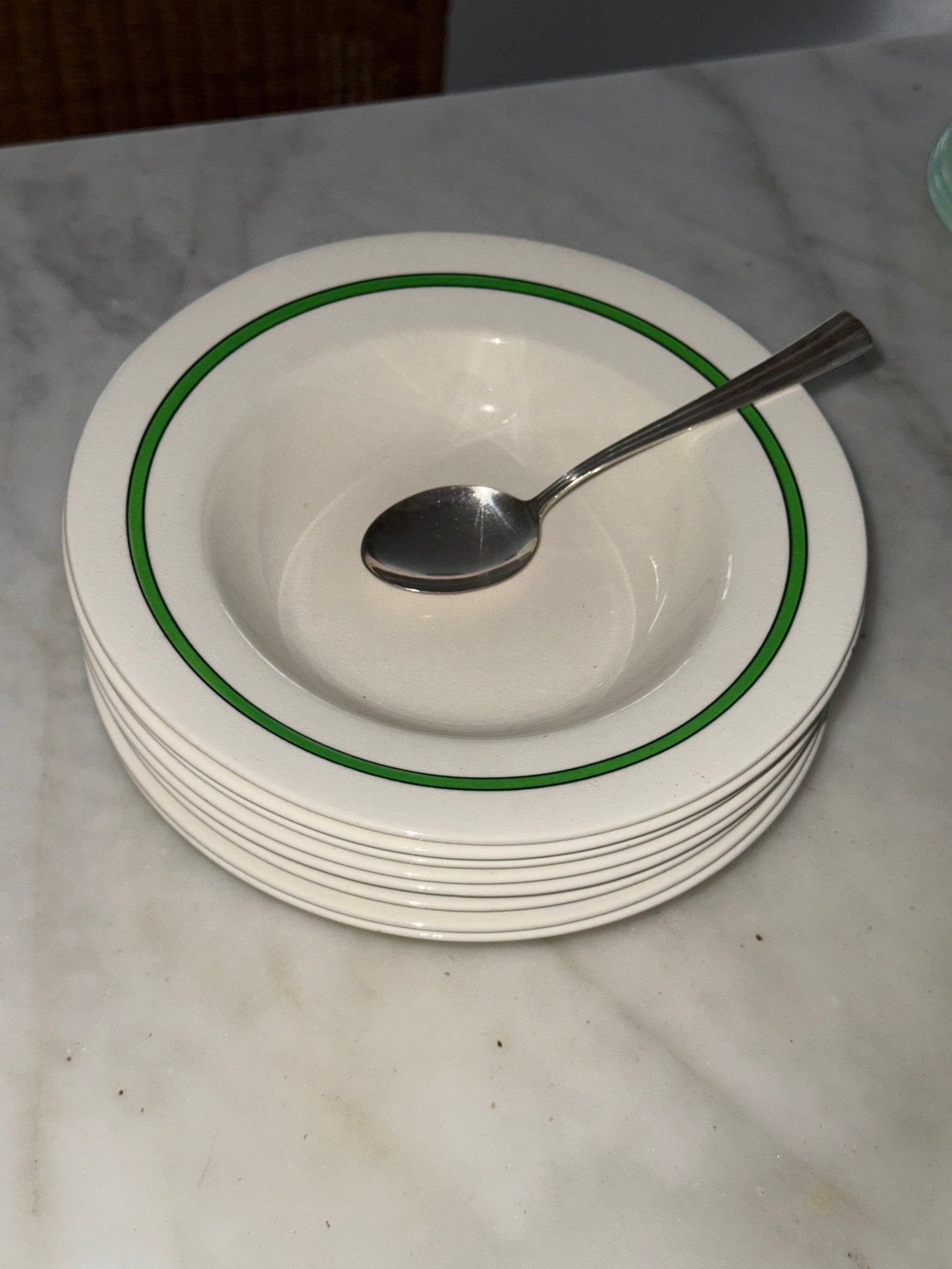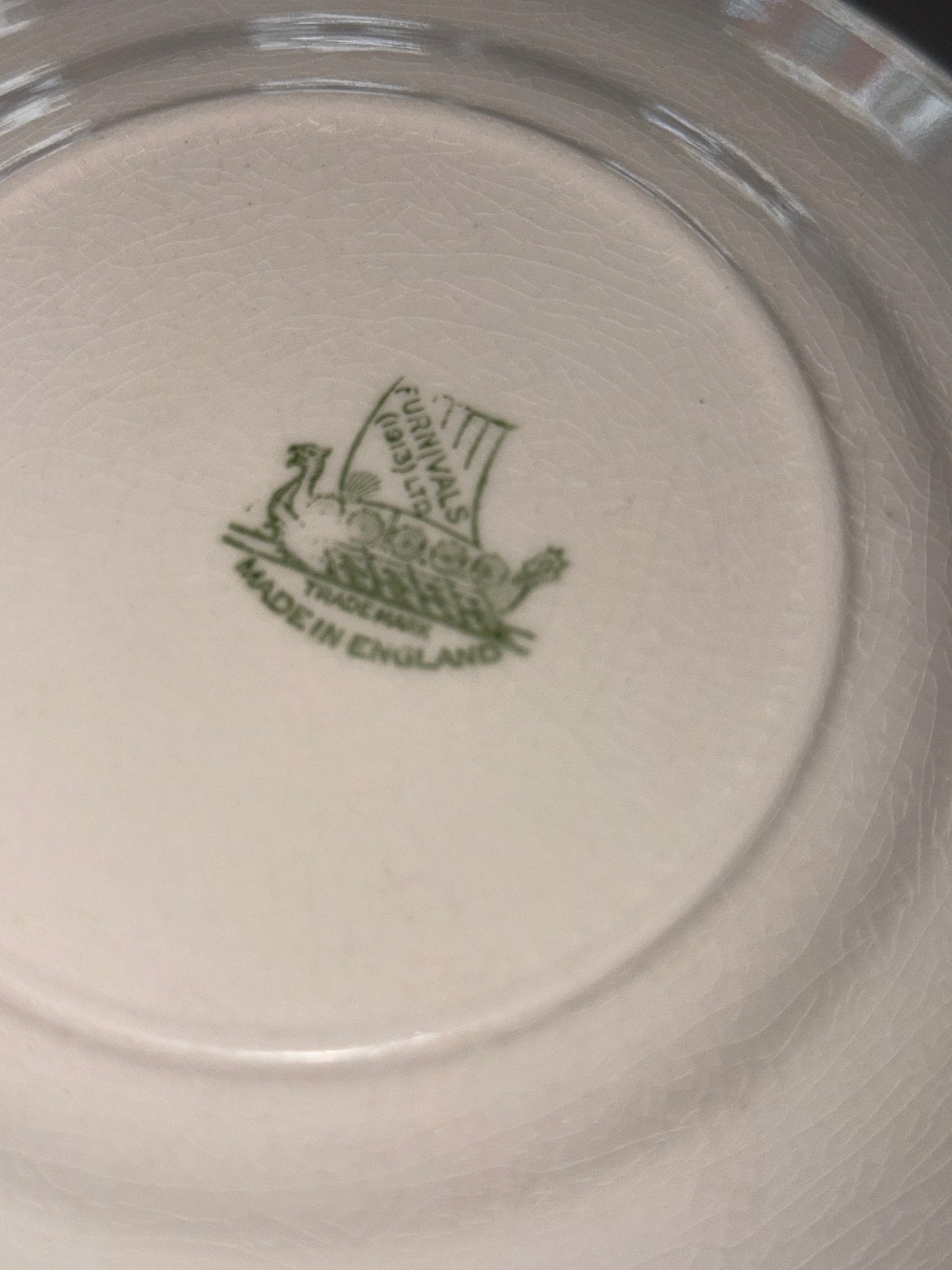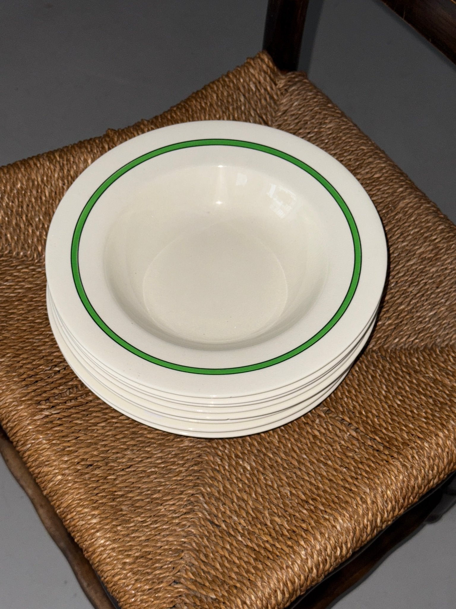Green striped side plates. Furnivals, England. 8 pcs available. In excellent condition — minor crazing as shown in the photos.