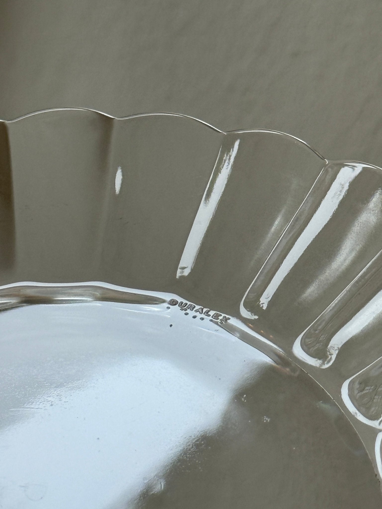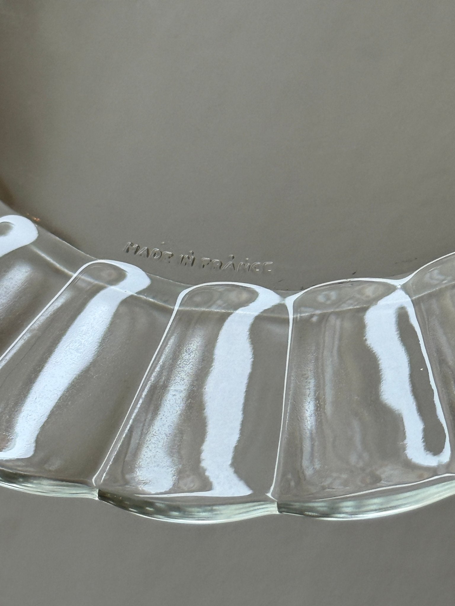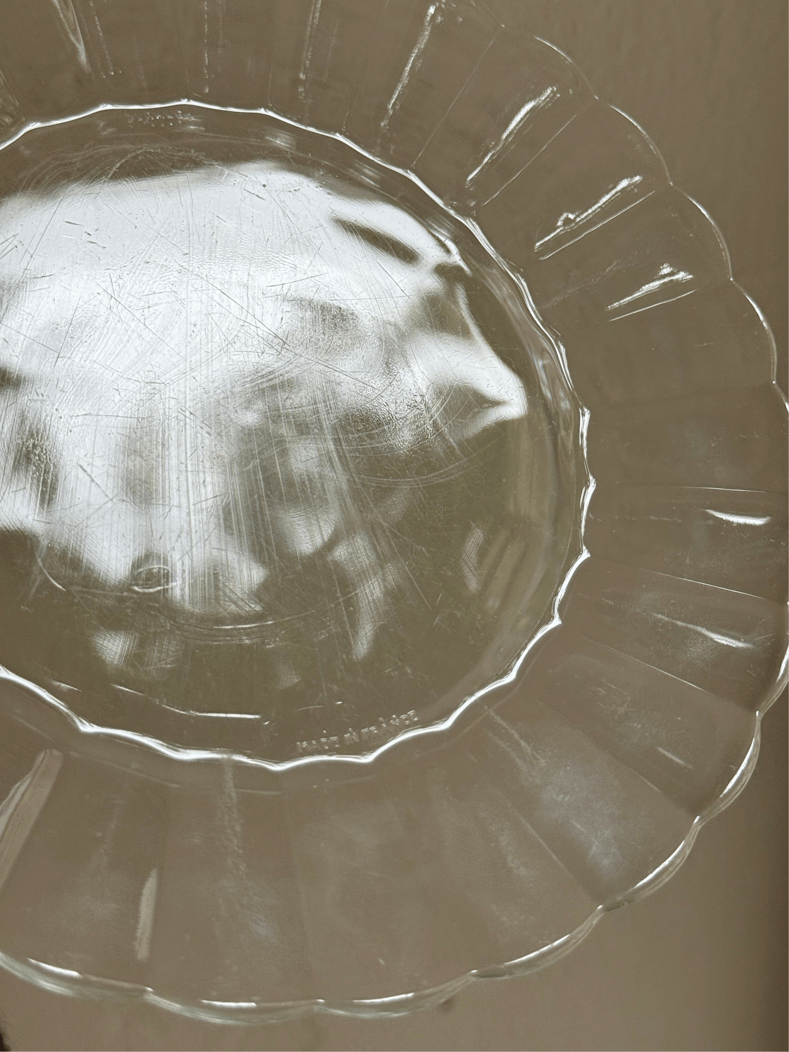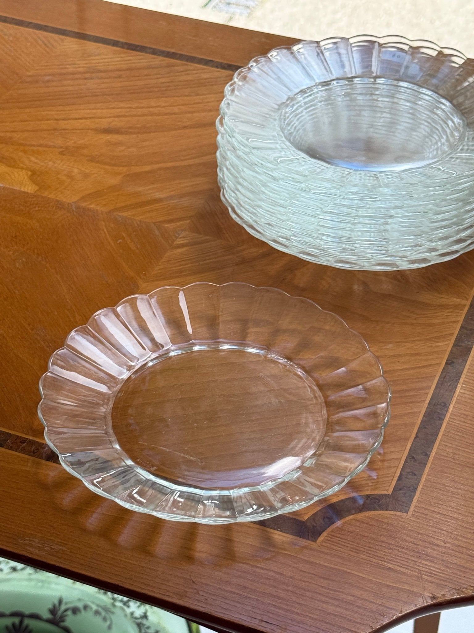 Glass plates with a flower-shaped rim. 12 pcs left. All have visible scratches — price adjusted accordingly. Still perfectly suitable for serving.