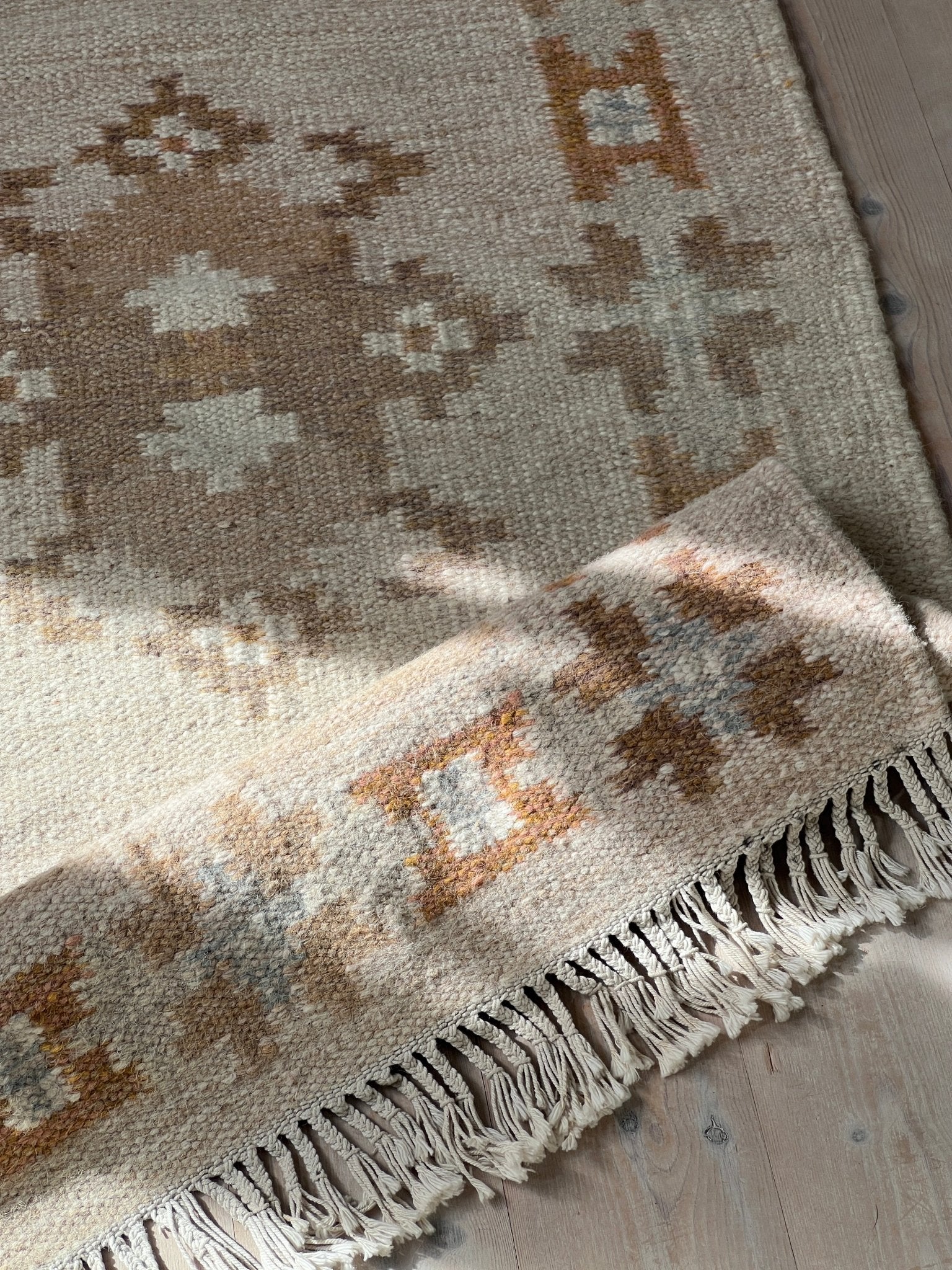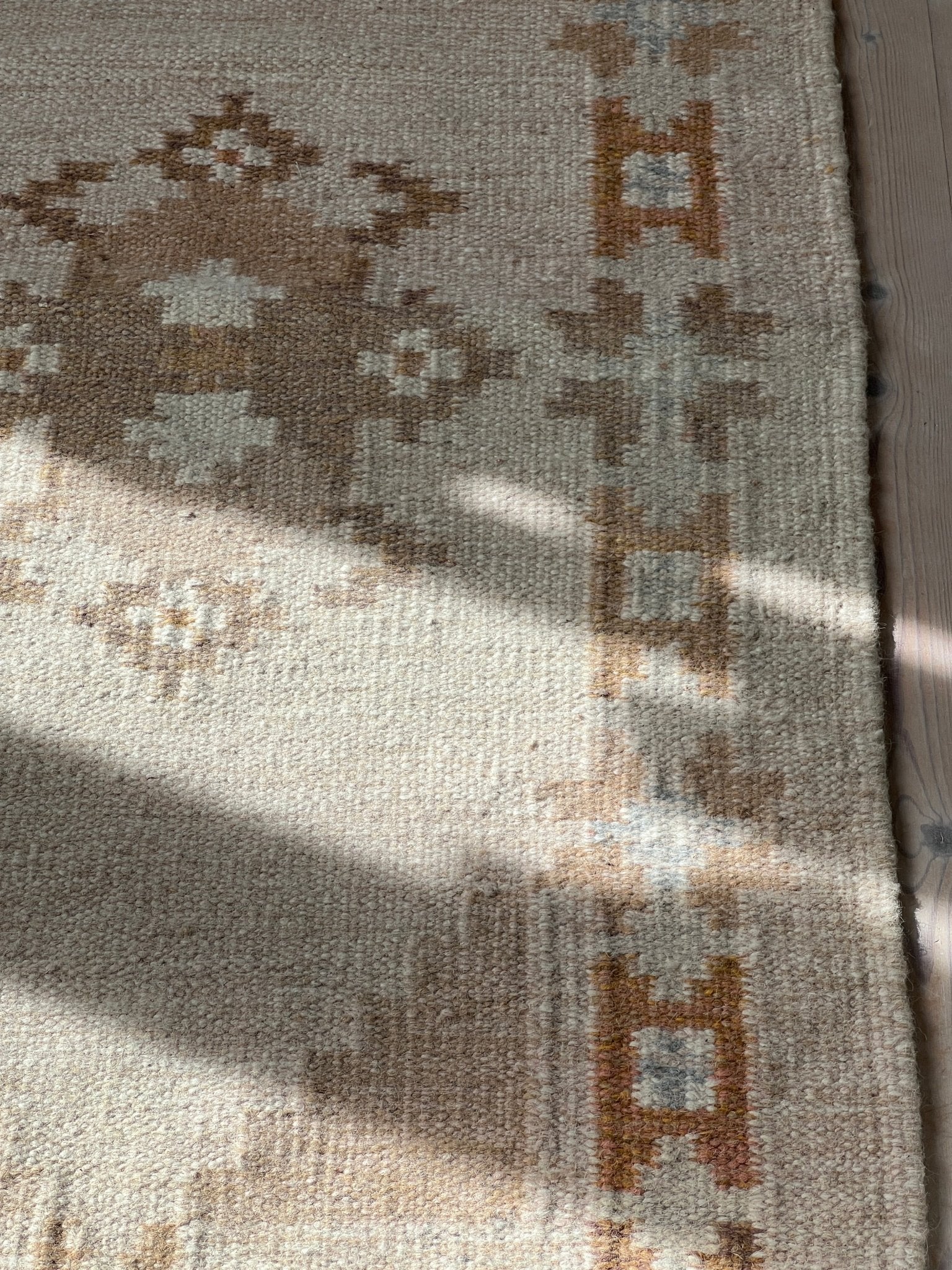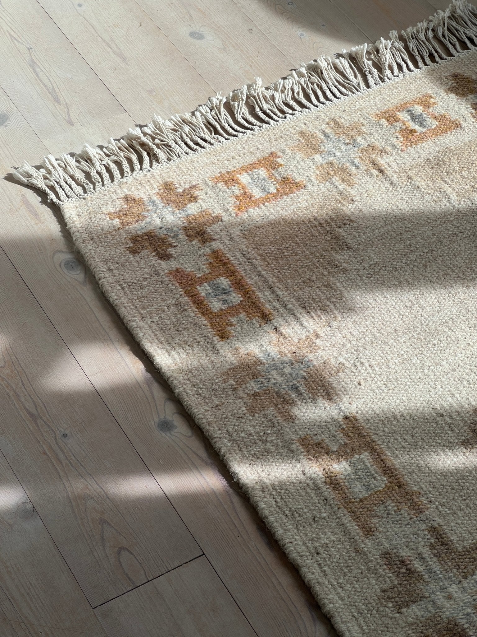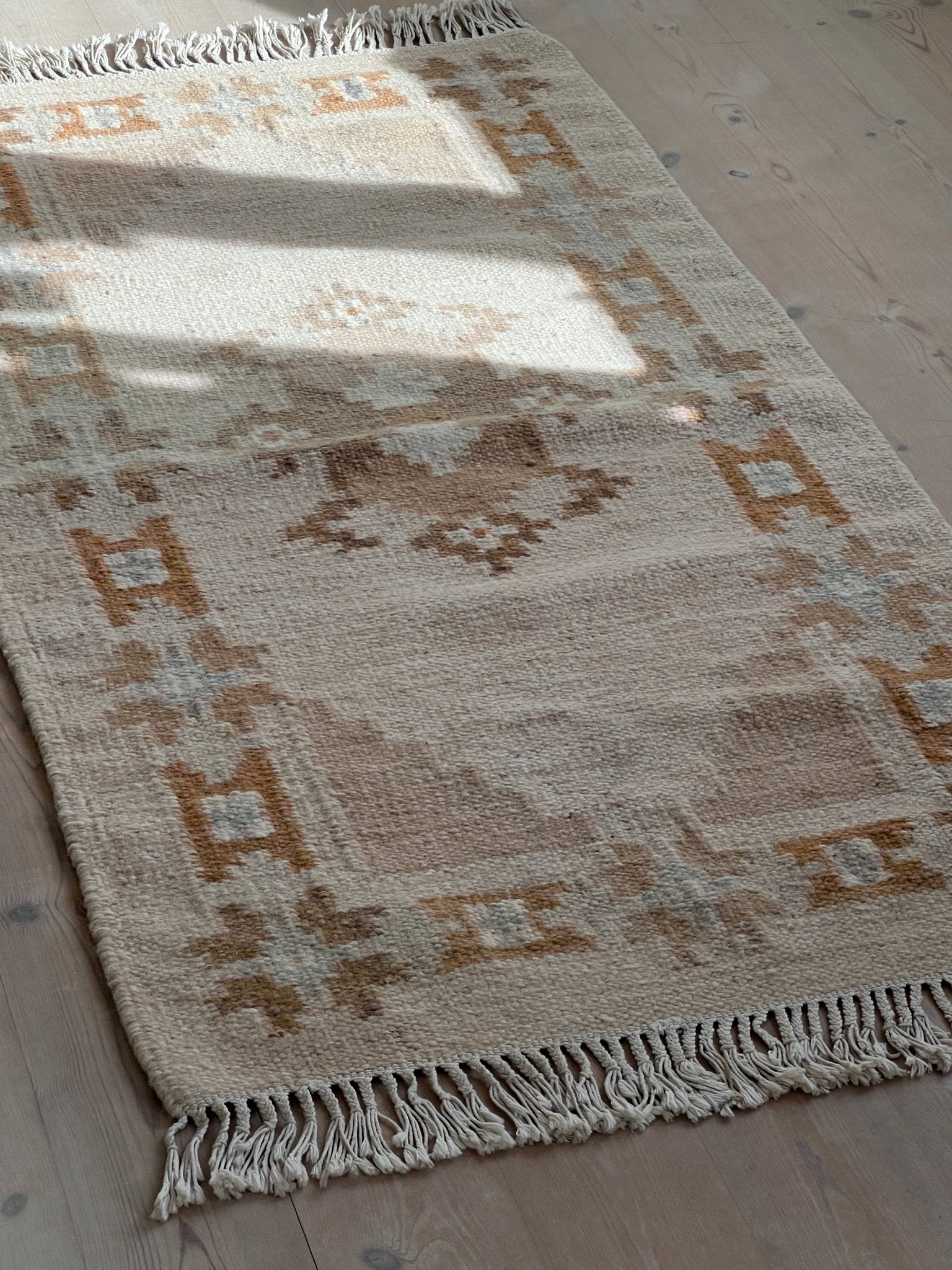 Flatweave rug in a lovely almond colour with a hint of sky blue. In very good vintage condition.