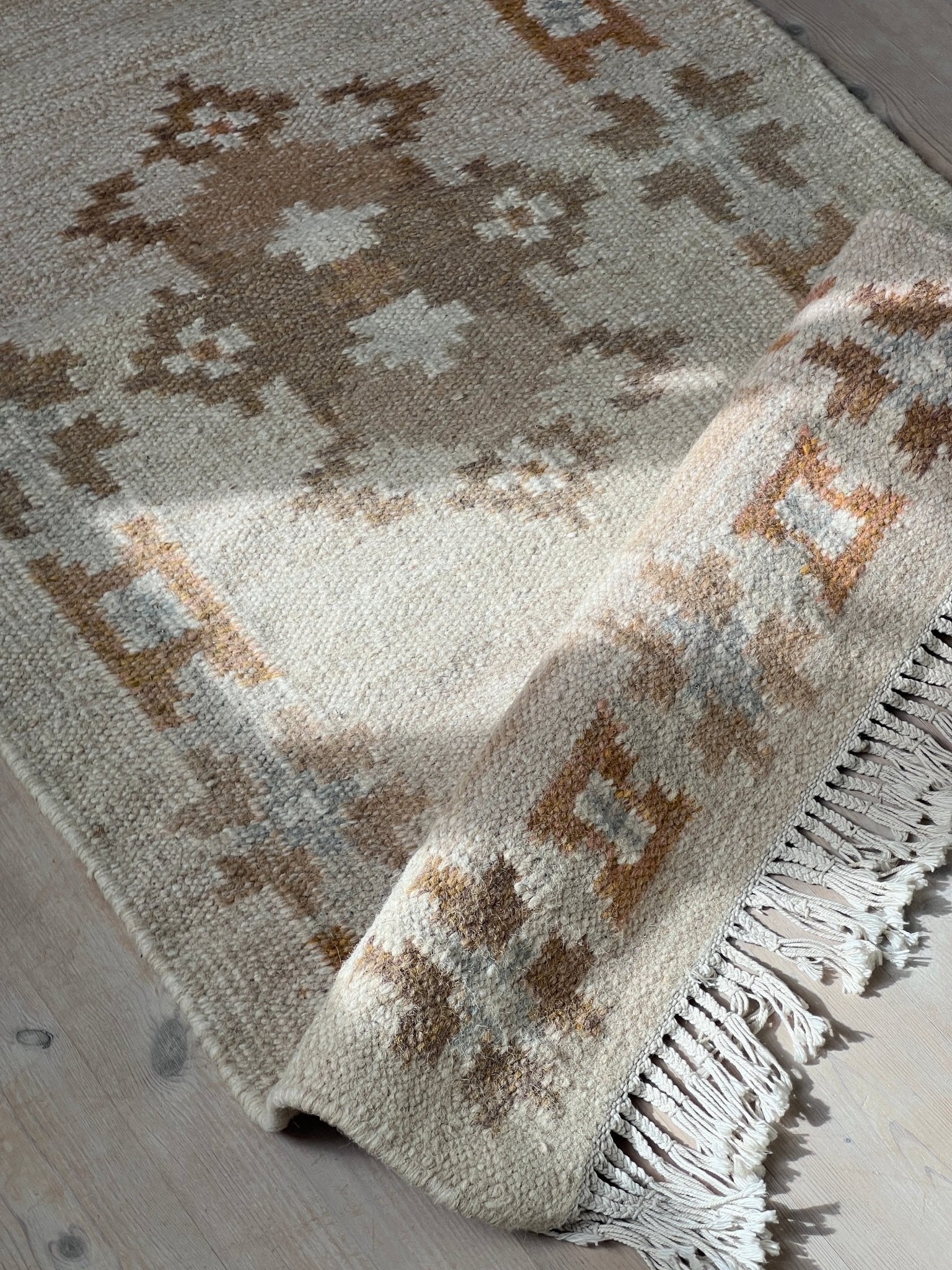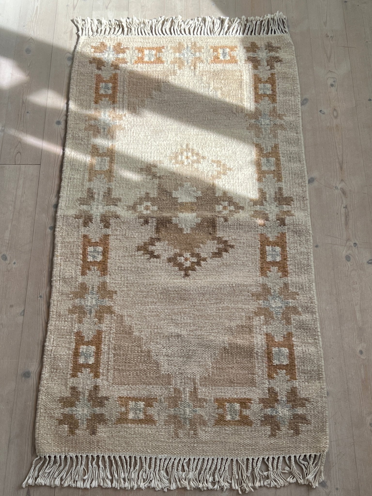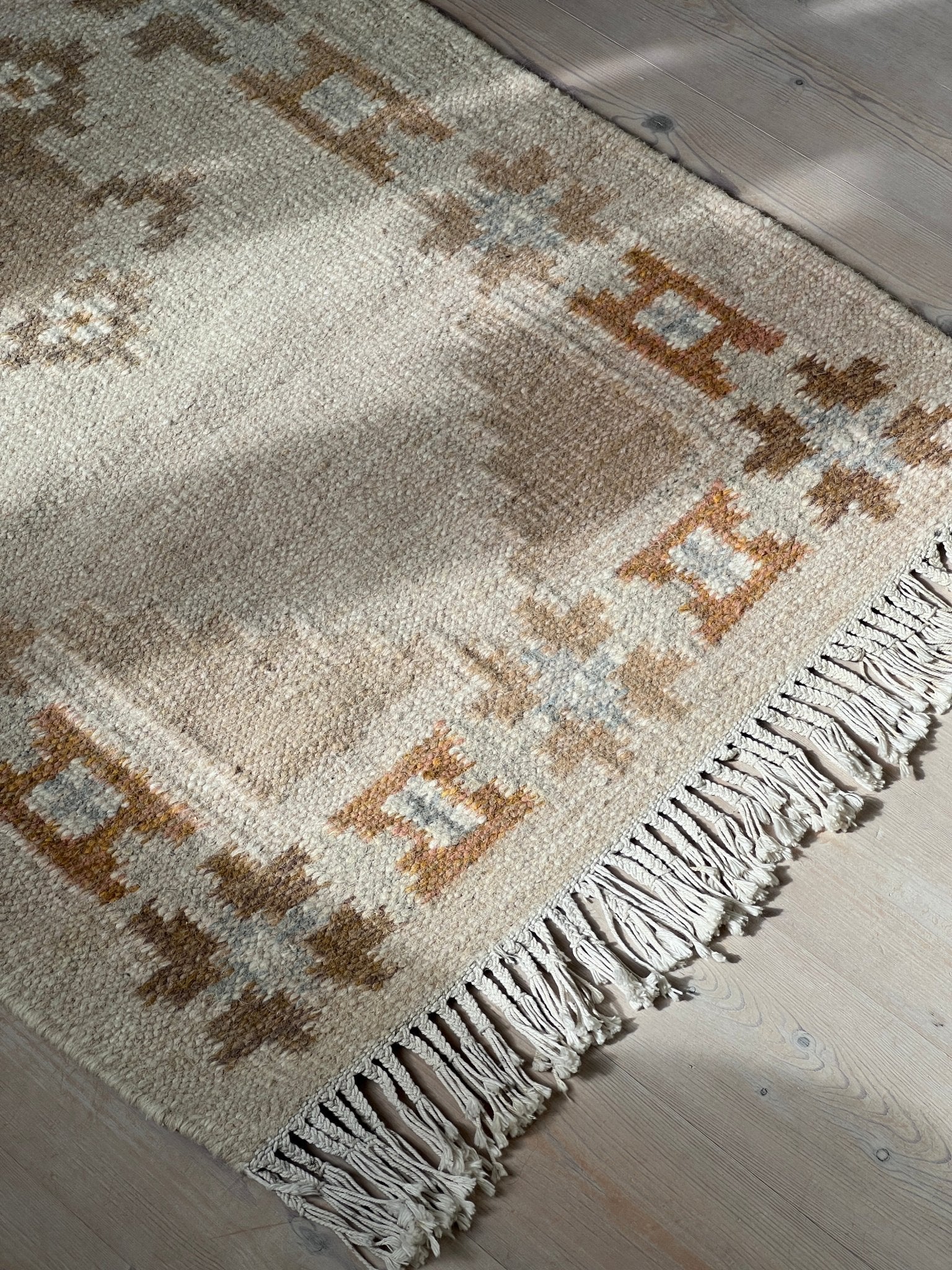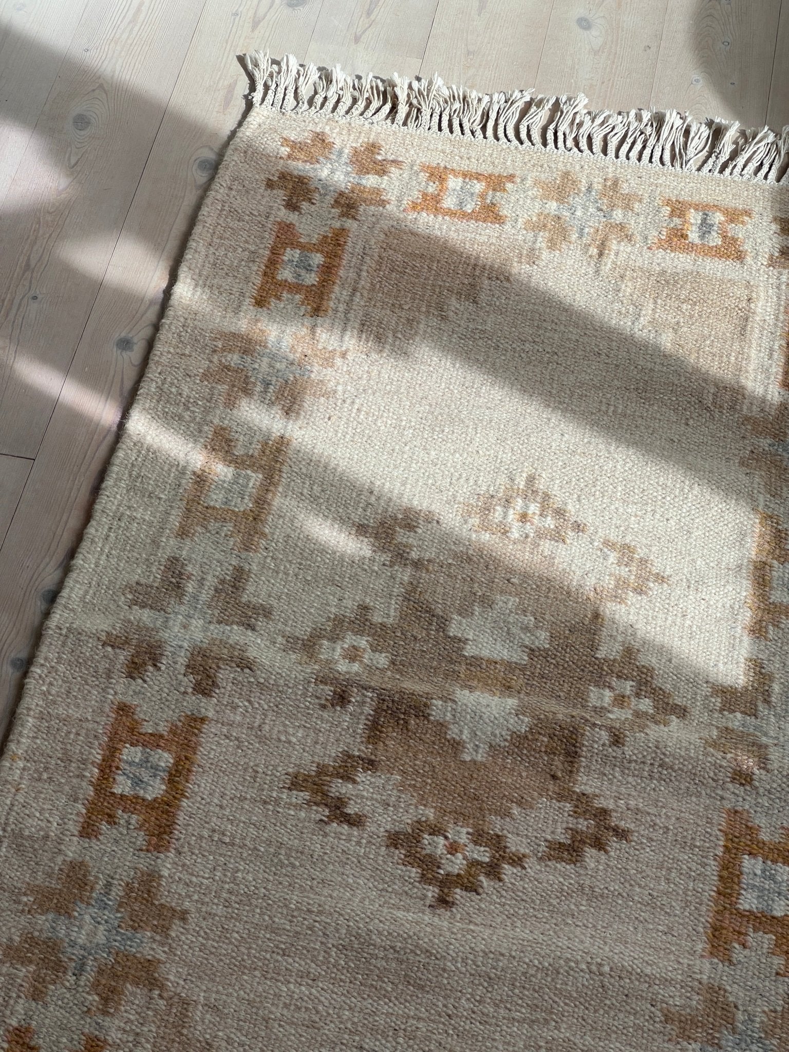 Flatweave rug in a lovely almond colour with a hint of sky blue. In very good vintage condition.