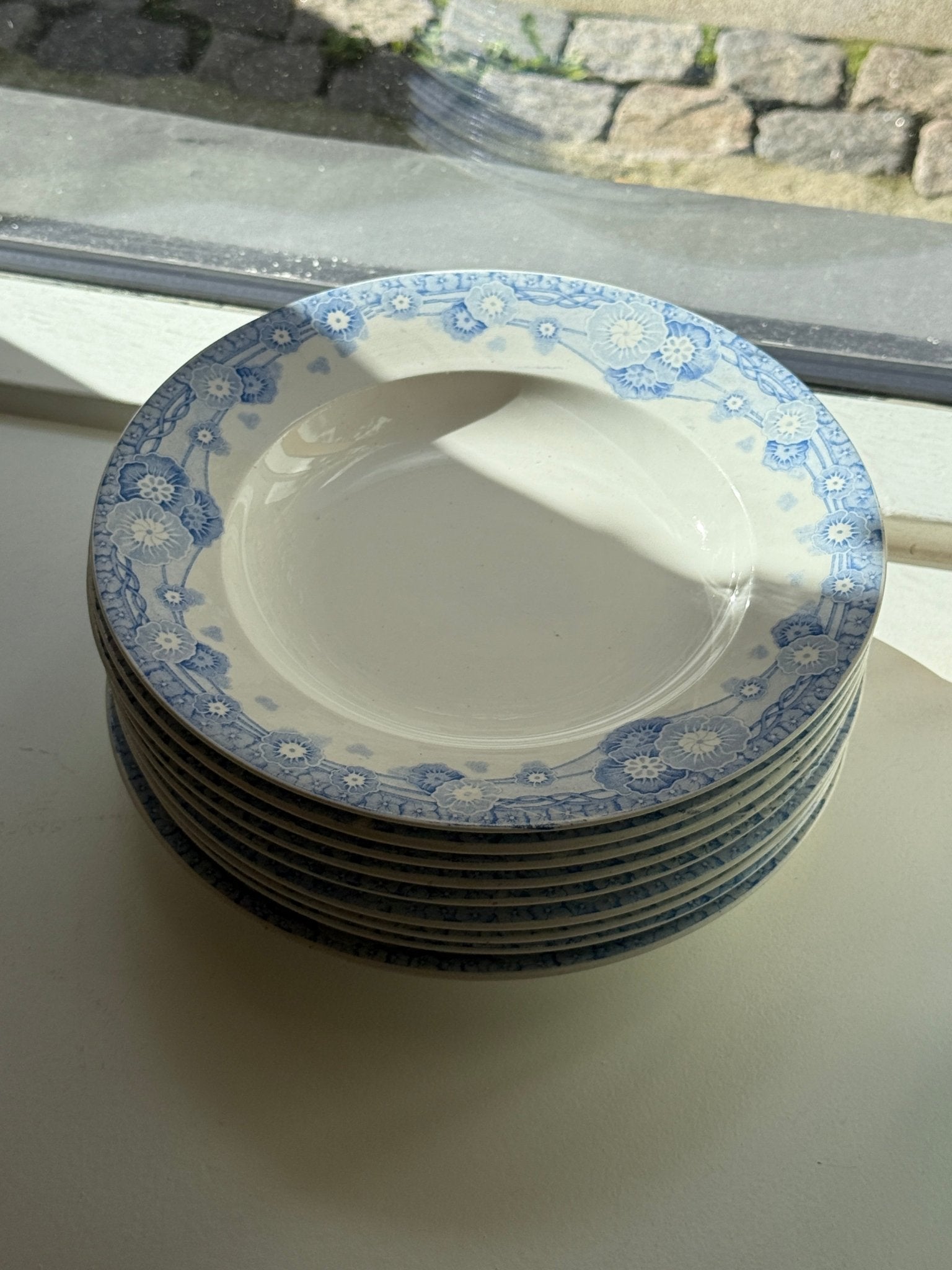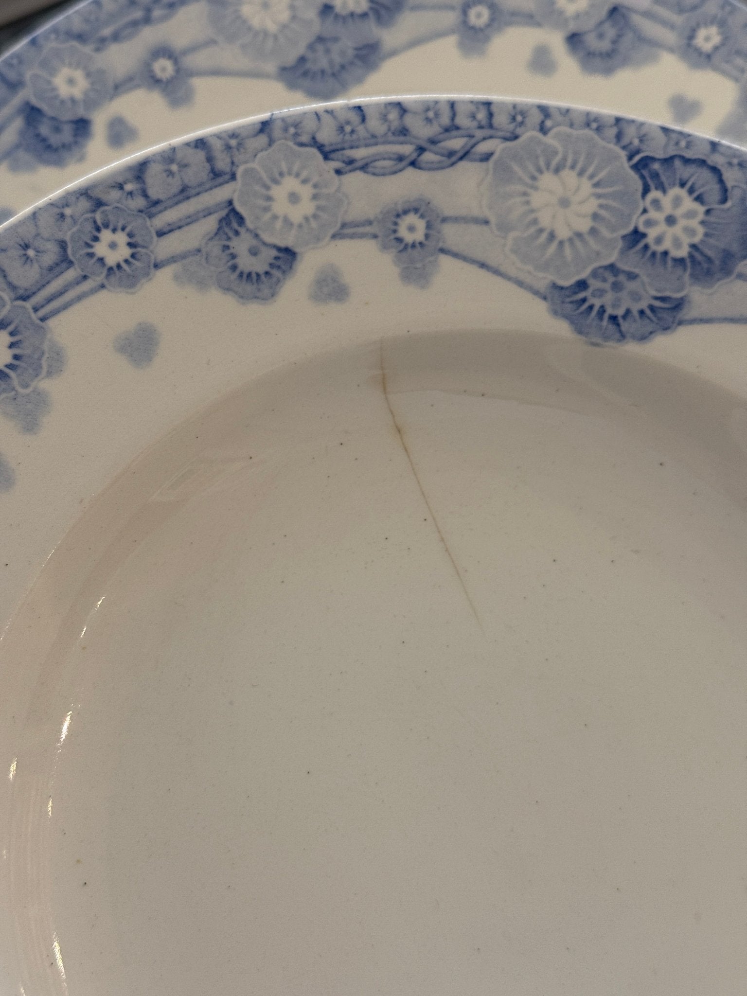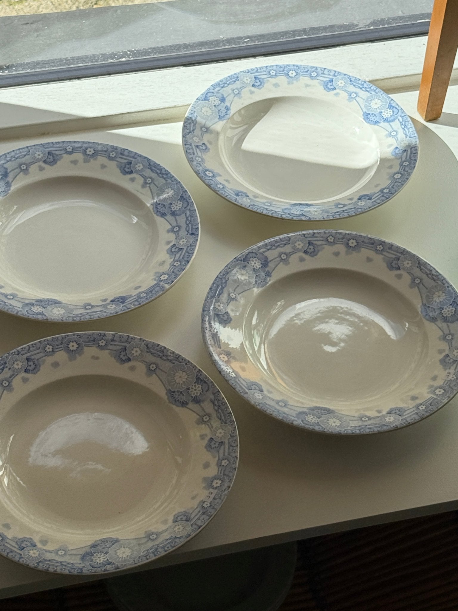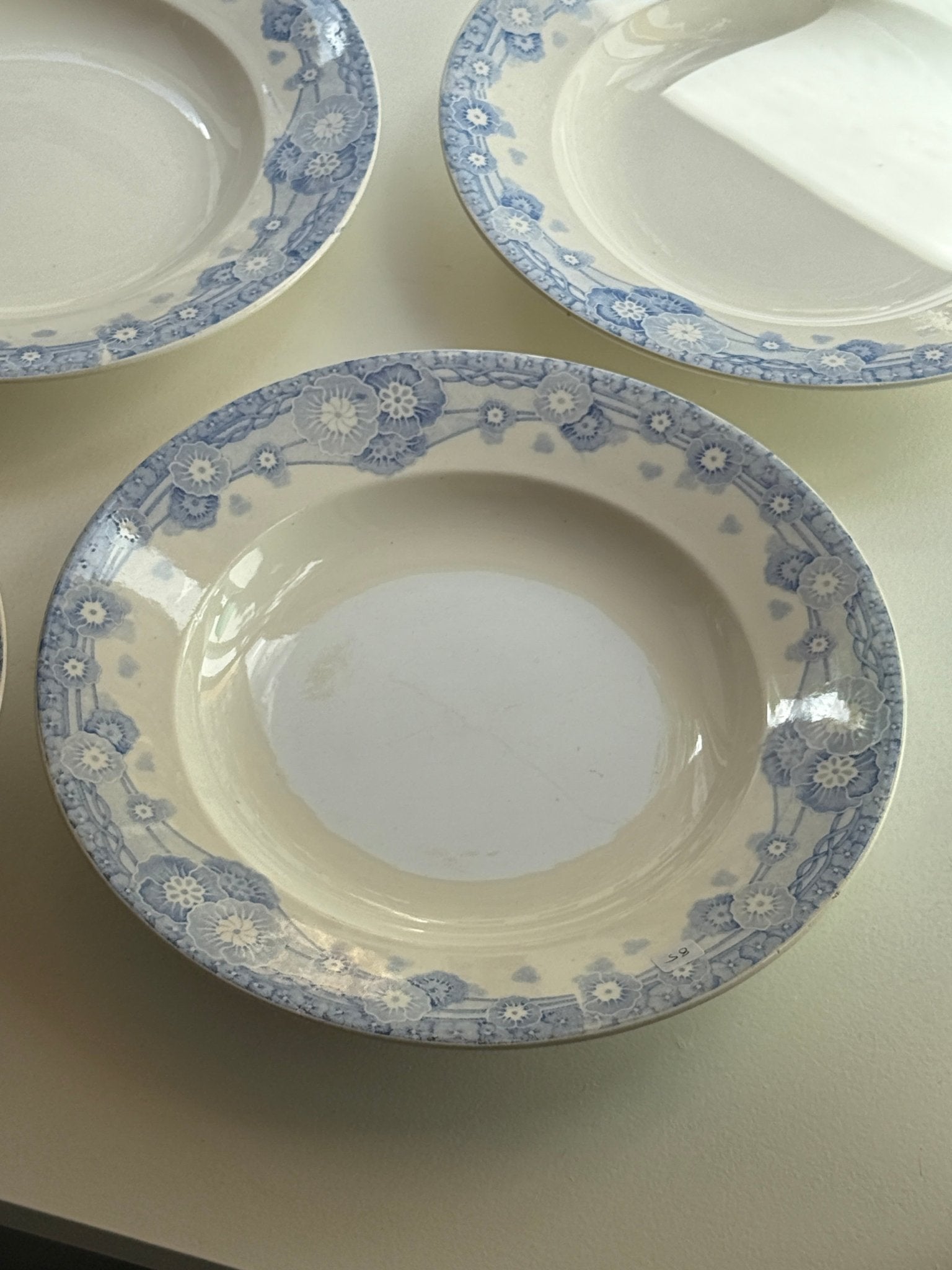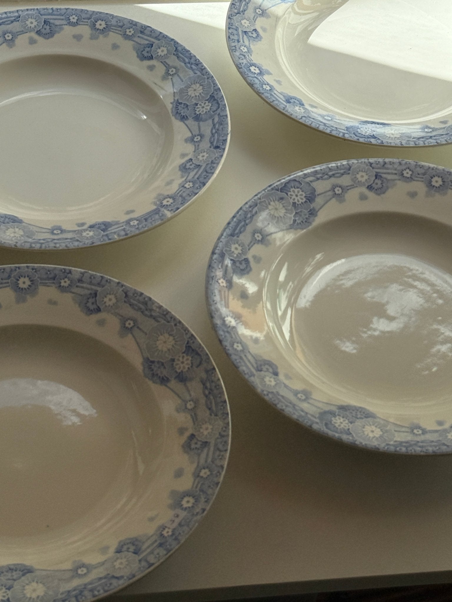 Blue floral pasta plates. 1 pc left. Well-kept and in excellent condition for their age, with only minor signs of wear visible in the photos. One thin hairline appears.