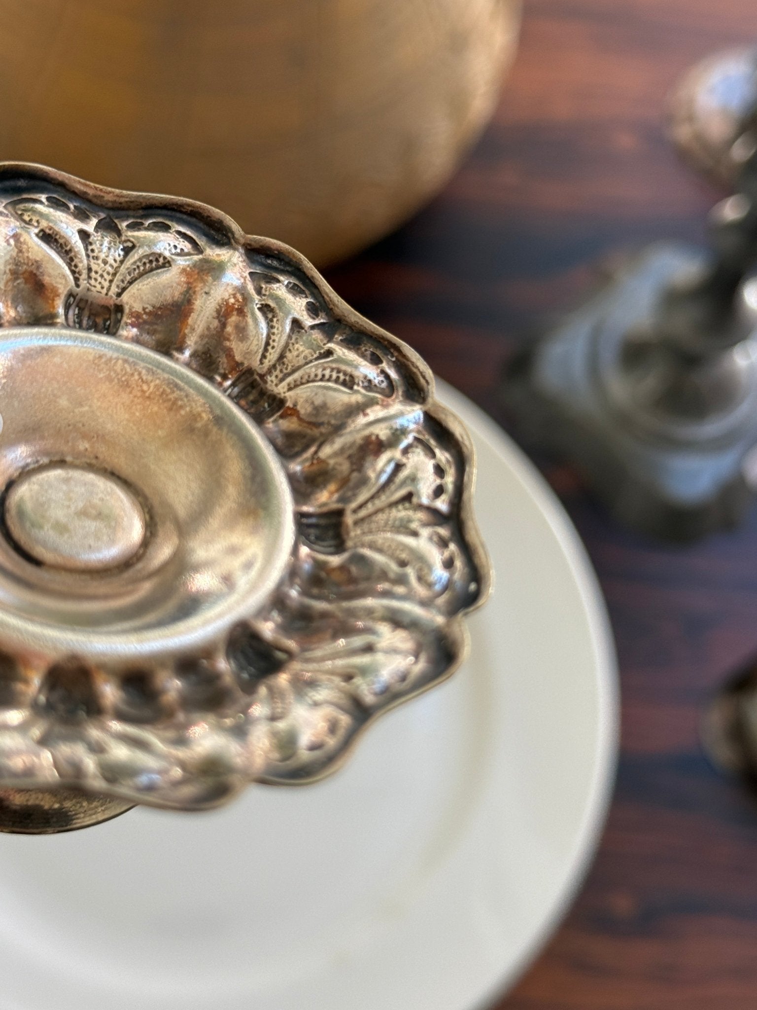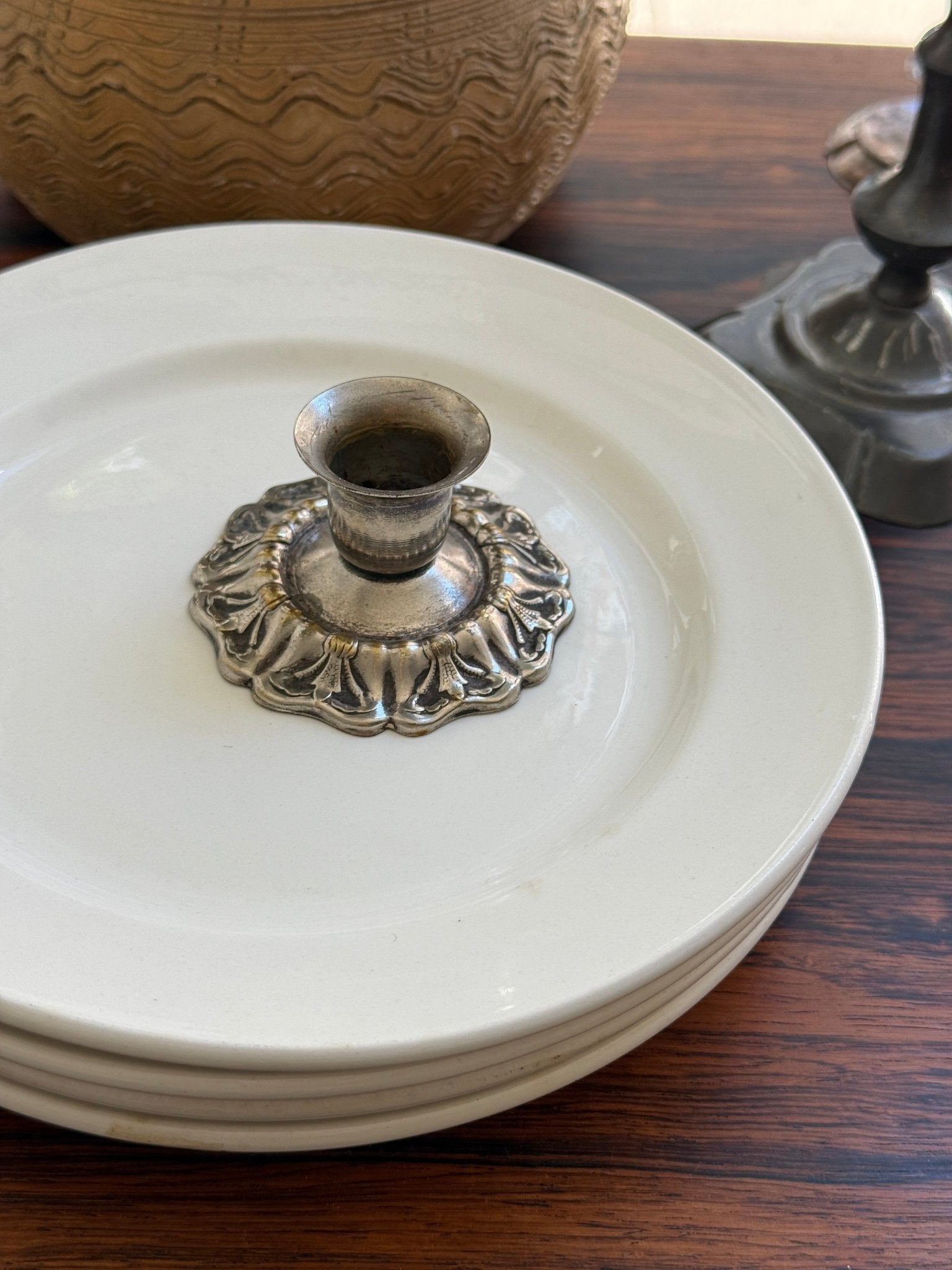 Flower-shaped silver plated candleholder. In excellent condition. Fits a normal candle.