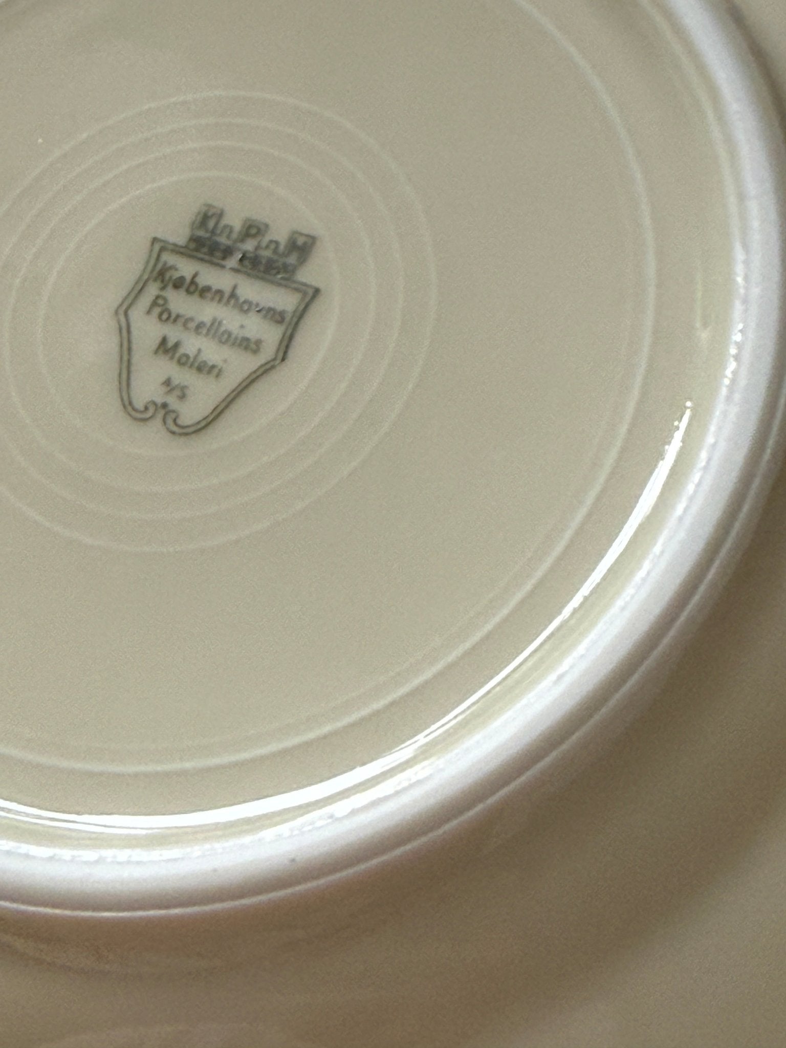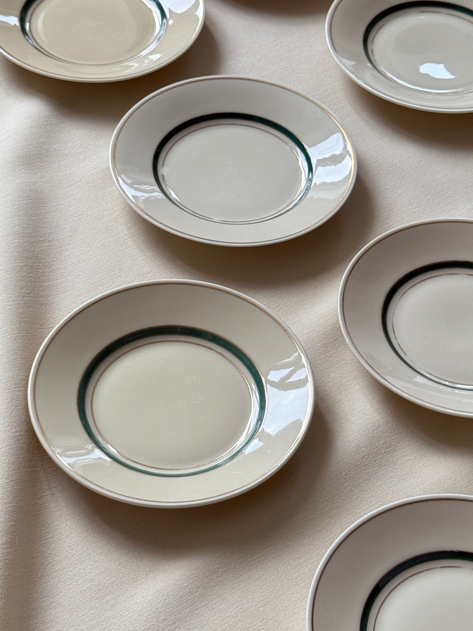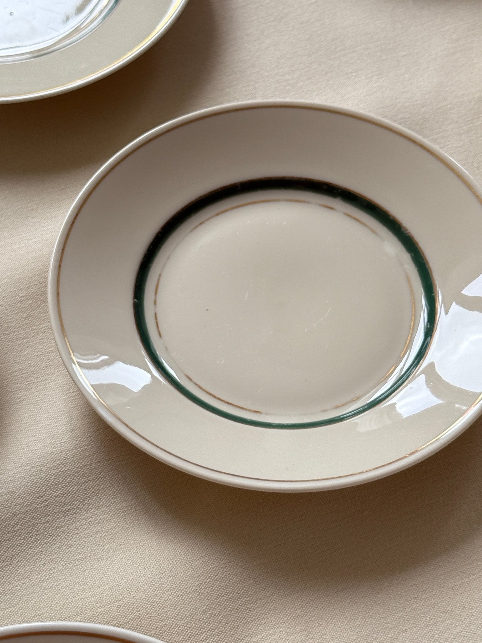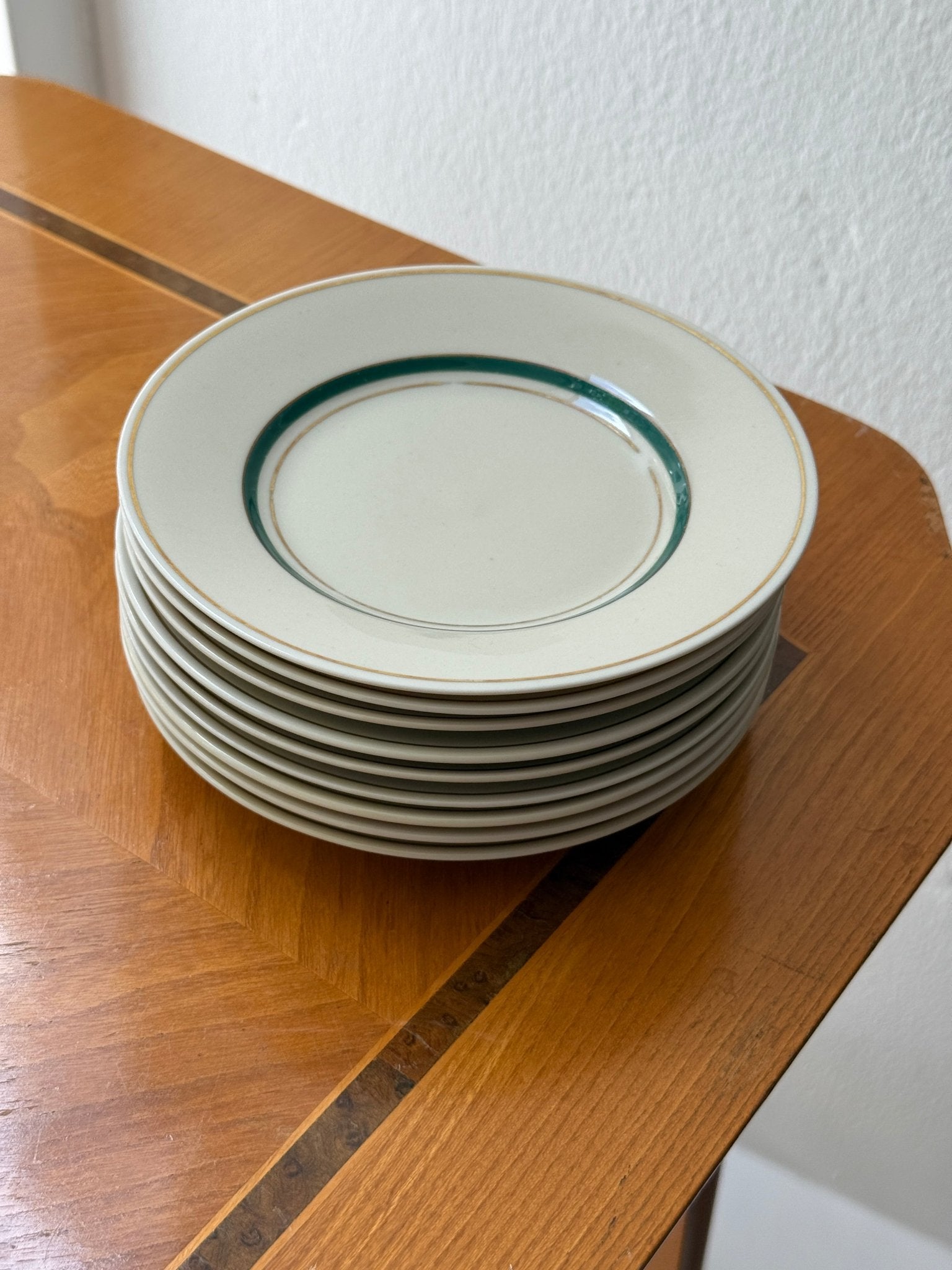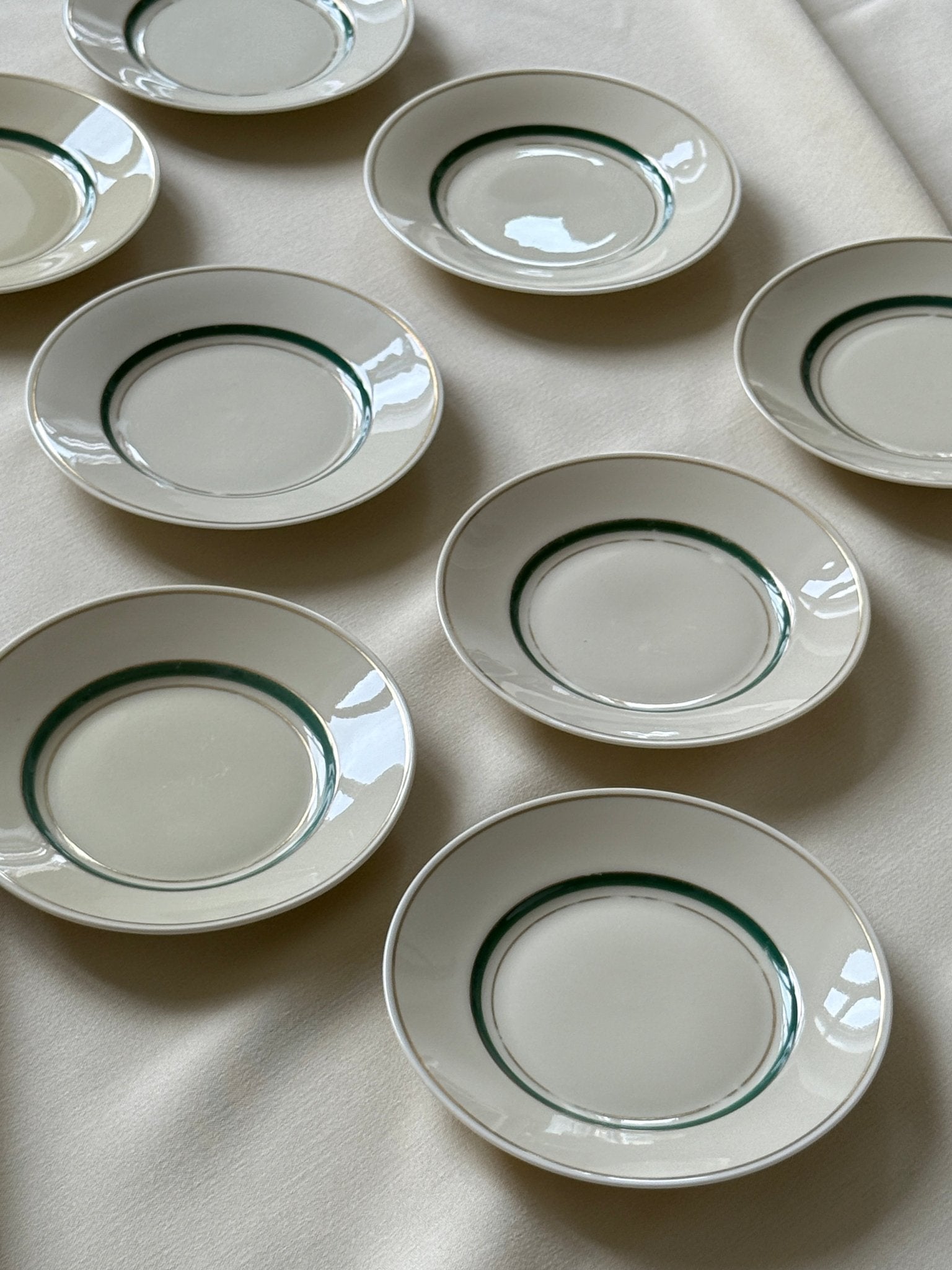 Green striped side plates. Kjøbenhavns Porcellains Maleri. 9 pcs available. The golden lines are slightly blurry, as we prefer it. In excellent condition.