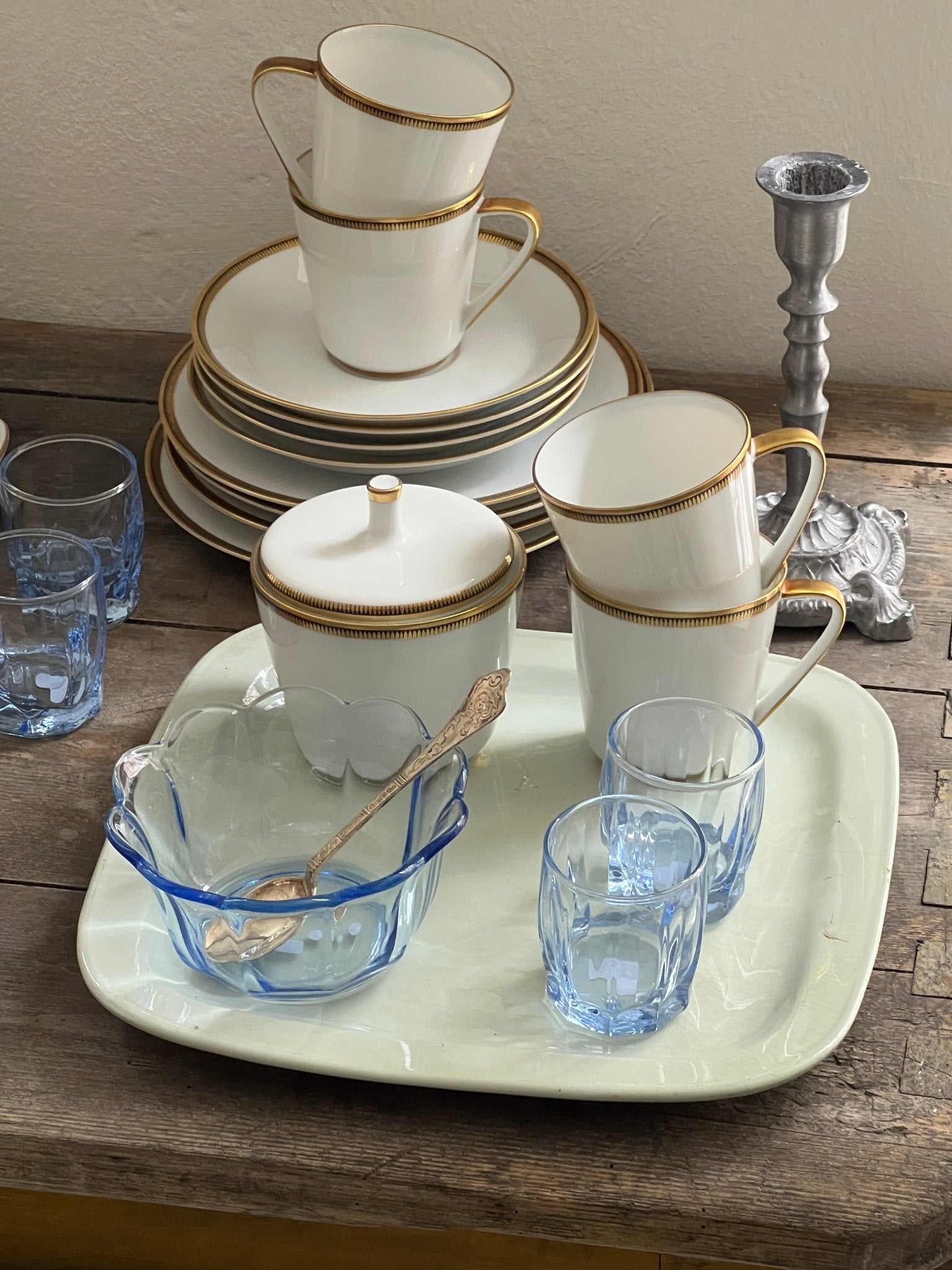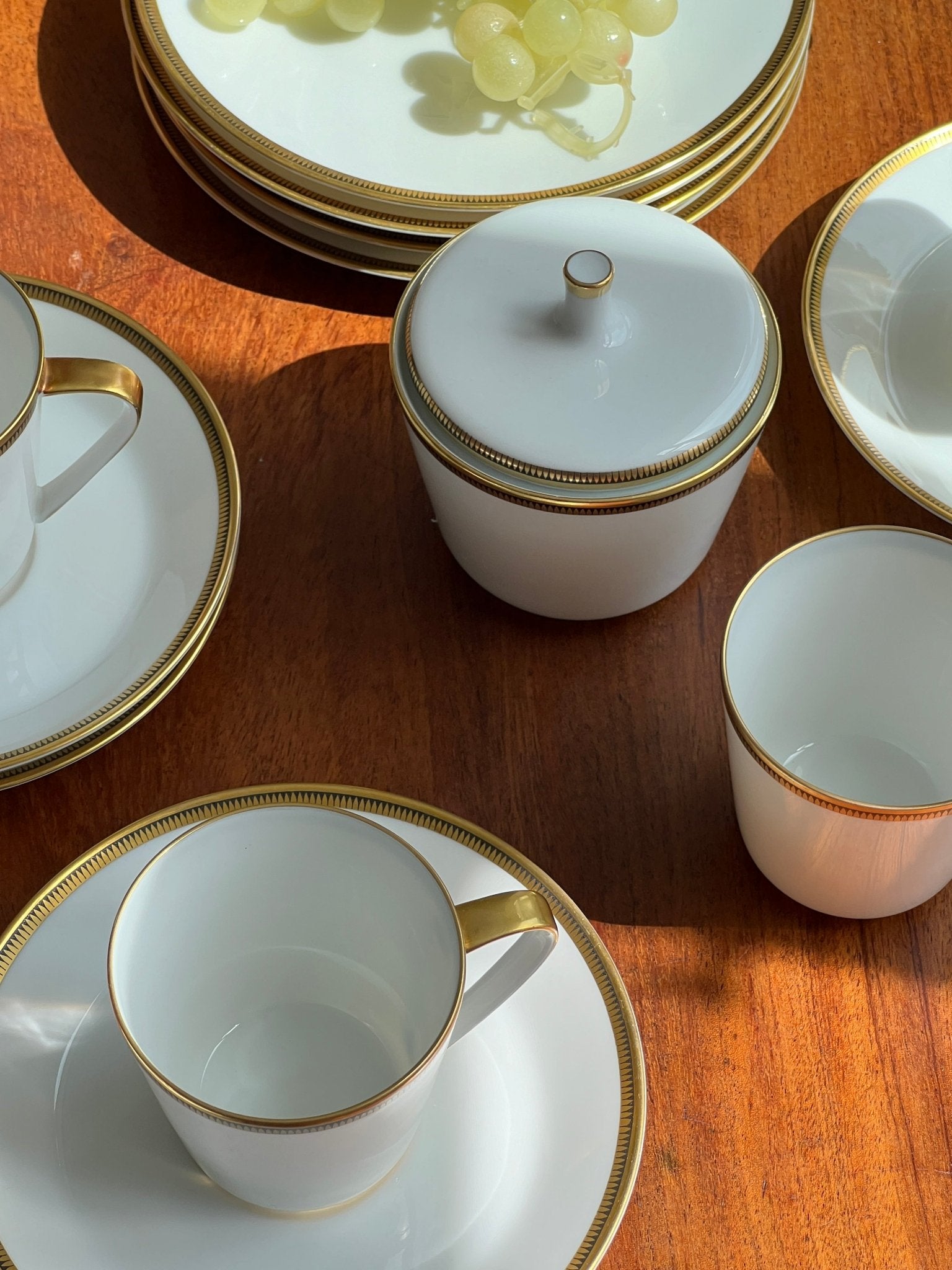 Beautiful tea set extravaganza from Germany. Cups, saucers and cake plates for 4 persons + one sugar bowl. Subtle gold and black details combined with white porcelain. In mint condition. All pcs are sold together.