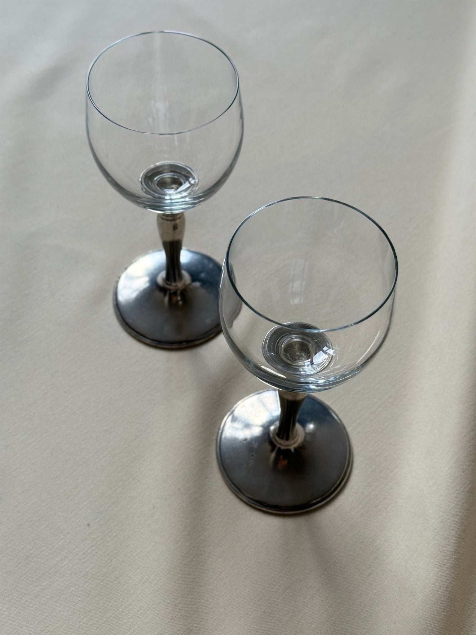 Two large wine glasses with silver plated feet. 2 pcs available, price is per piece. In mint condition.