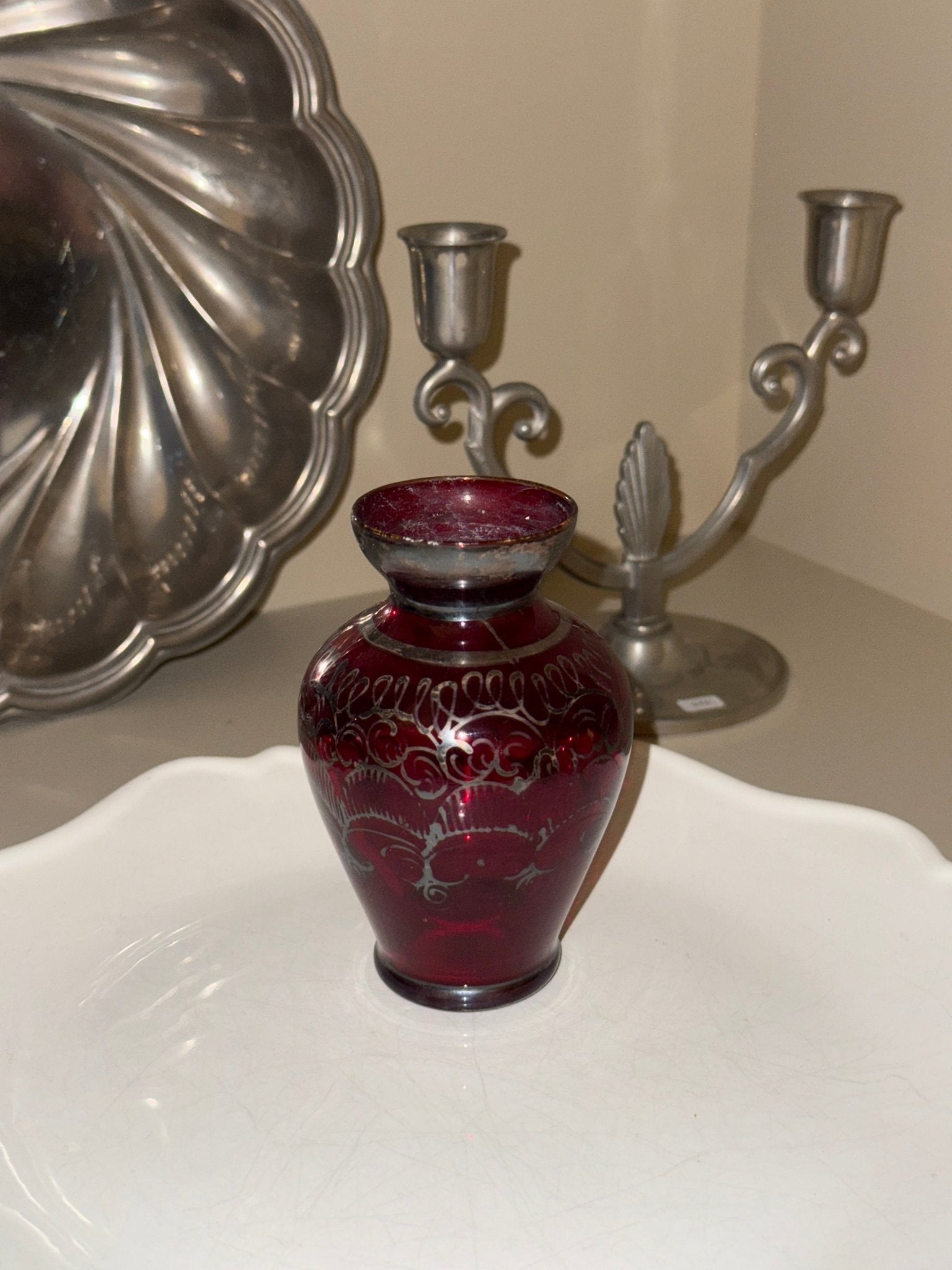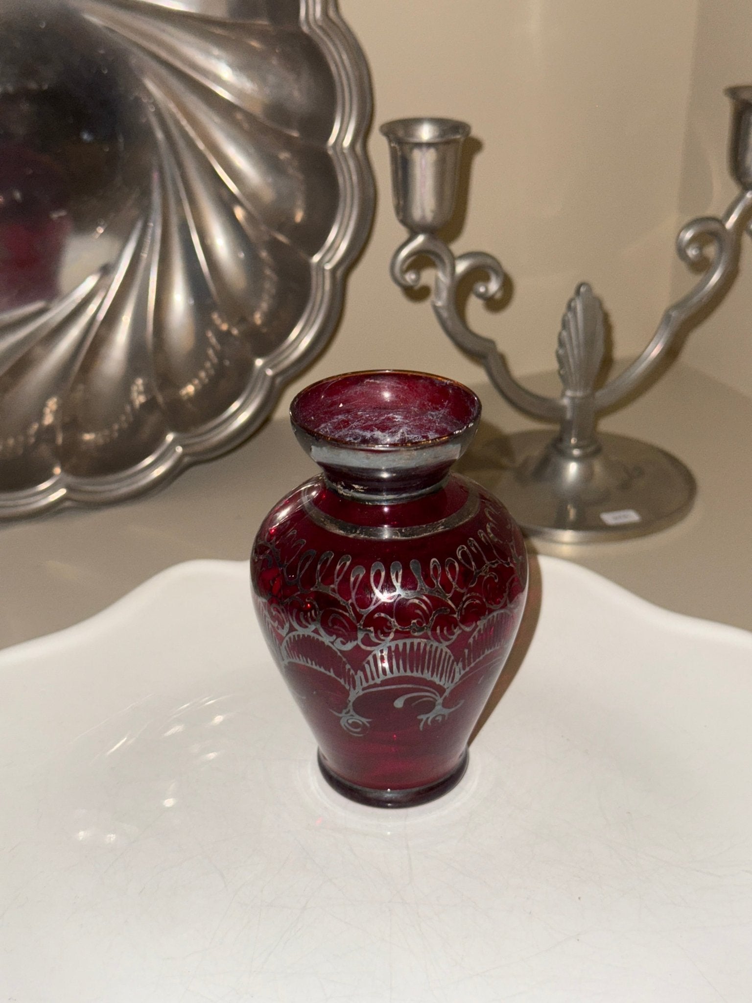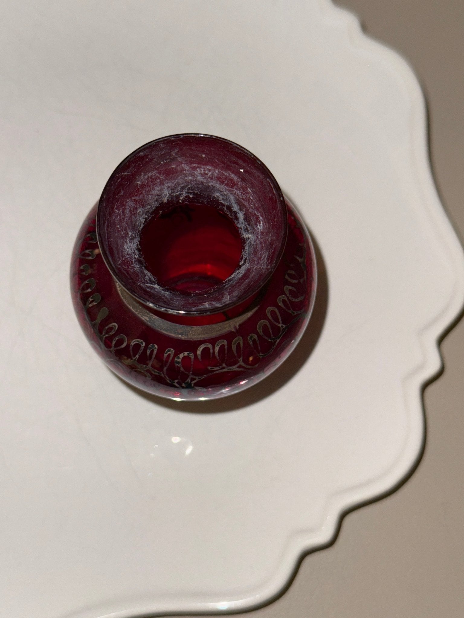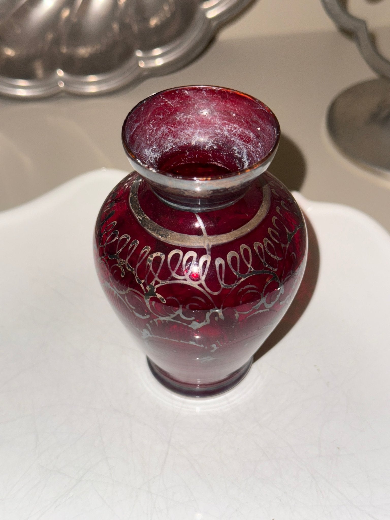 Small, ruby red Venetian vase with silver plated decoration. Visible wear on the top, but still stands beautifully.