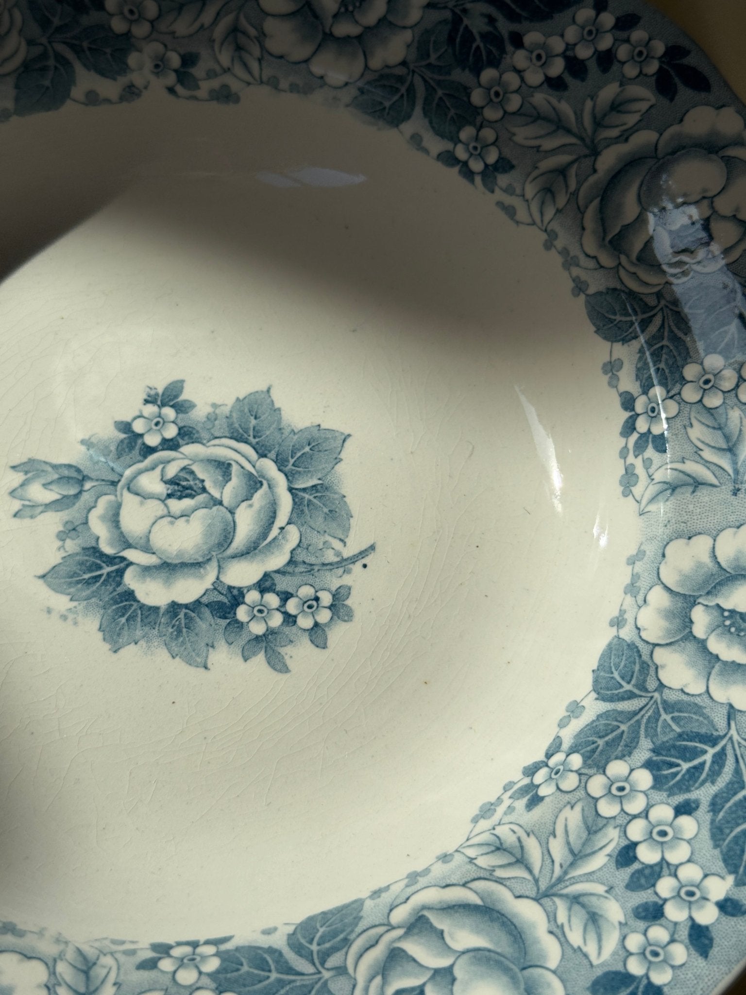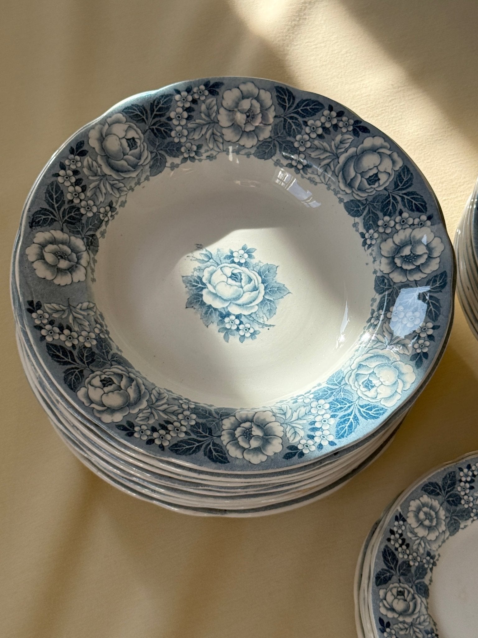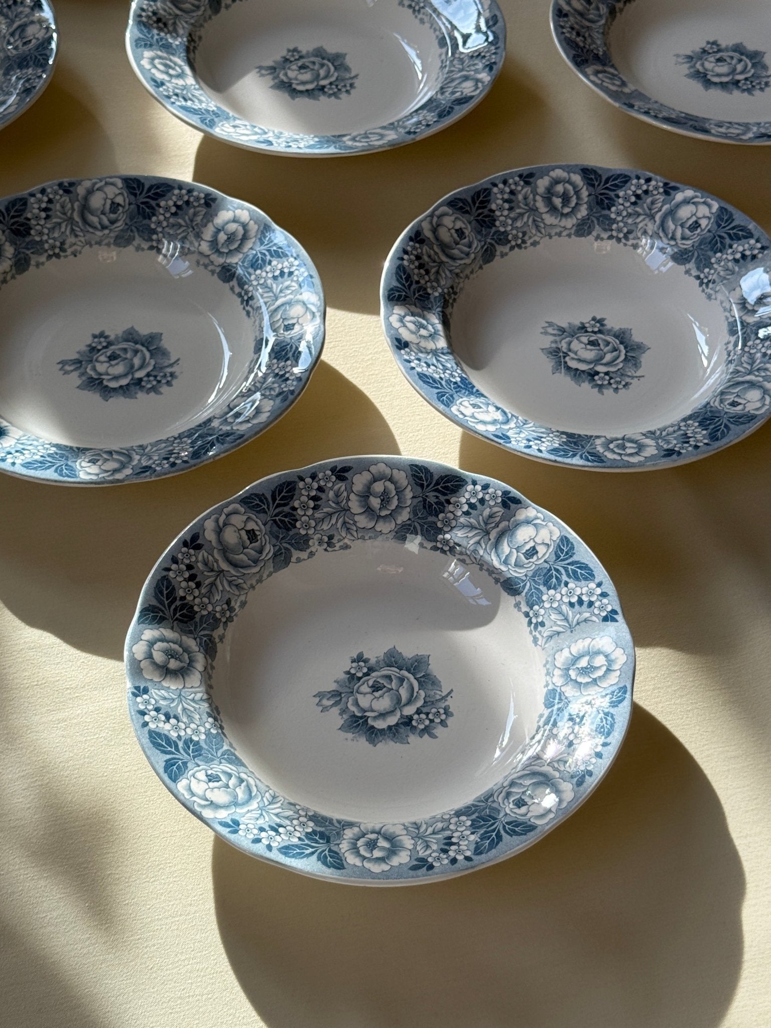 Blue floral pasta plates. Villeroy & Boch, Armin. 12 pcs available, price is per piece. This is an old faience set in very well-preserved condition. One plate has a thin hairline.