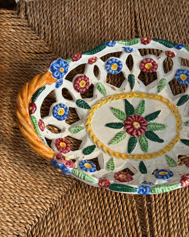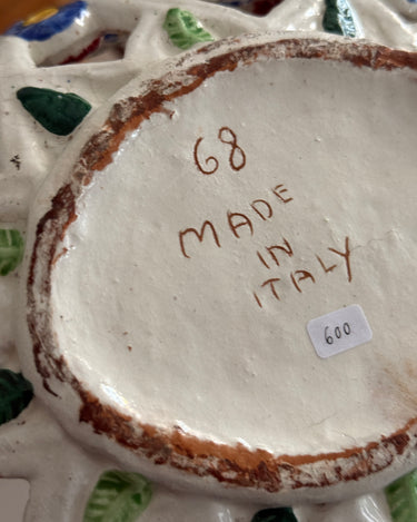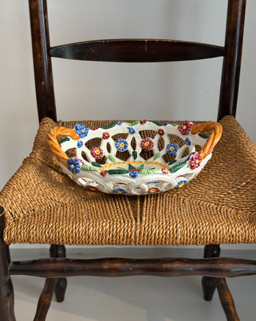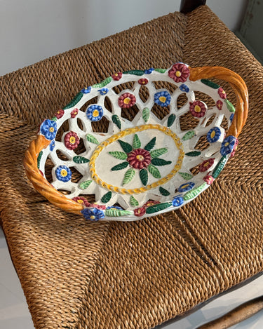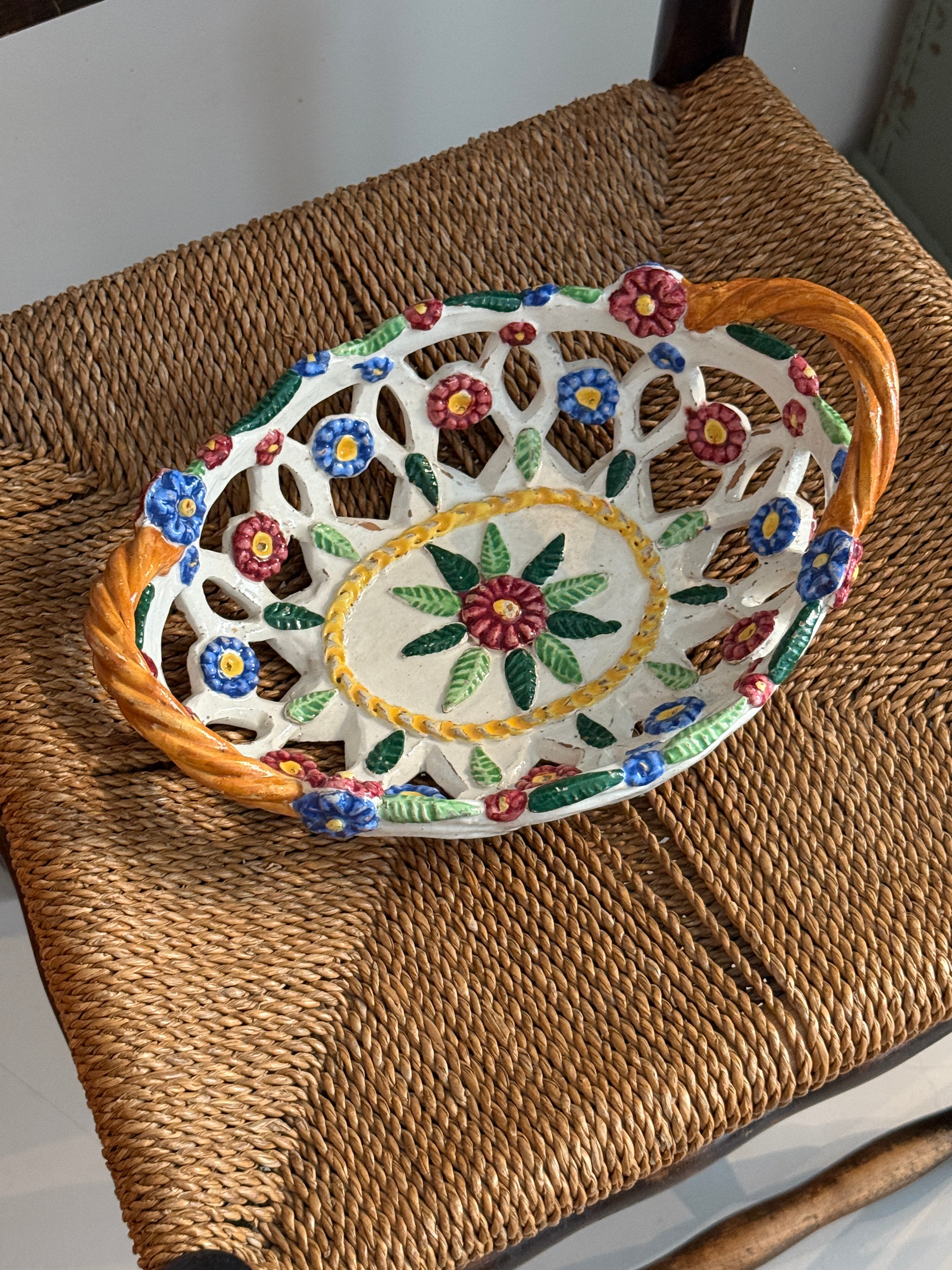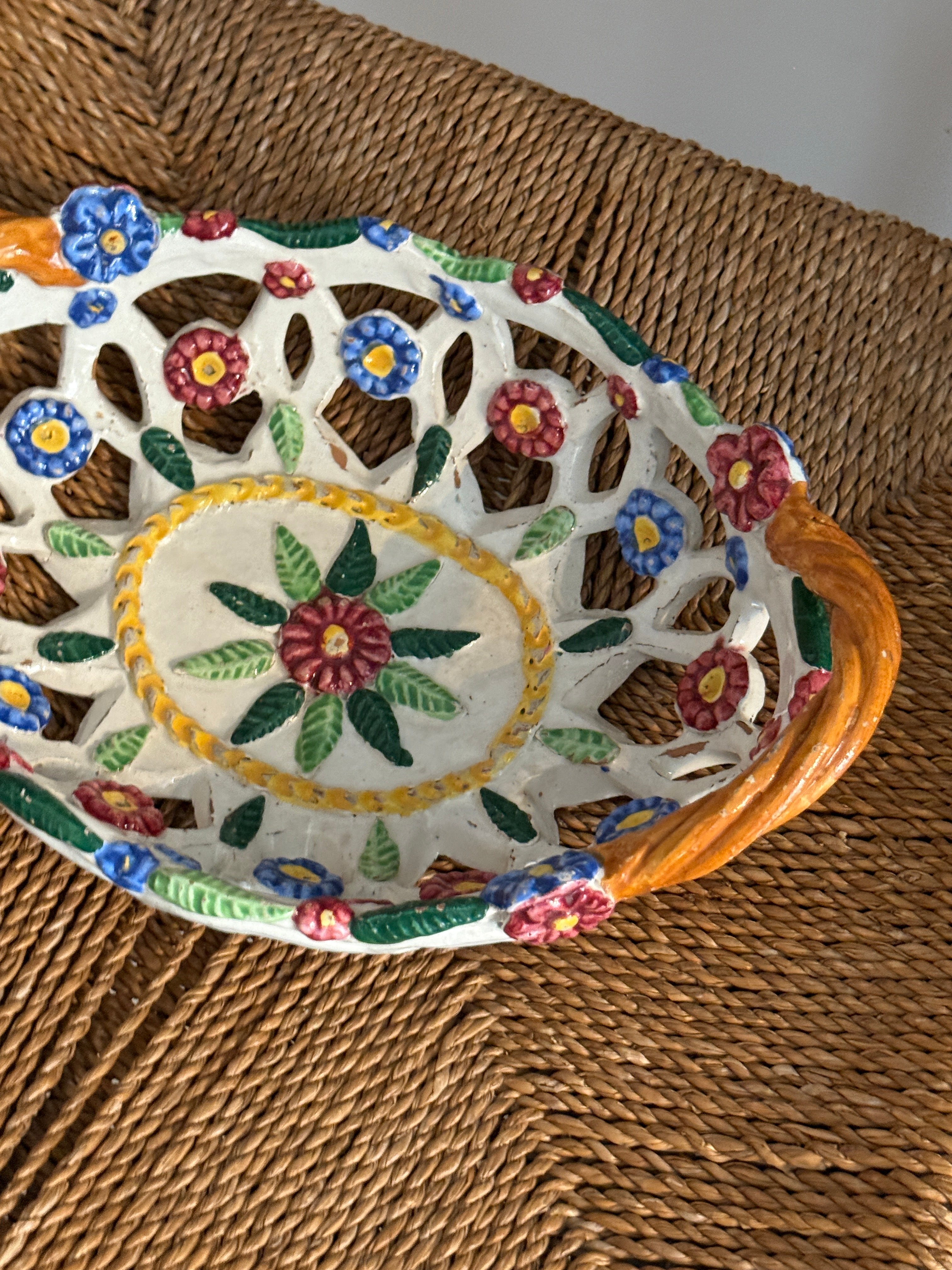Italian floral ceramic basket. Minor patina consistent with age, otherwise in beautiful condition.