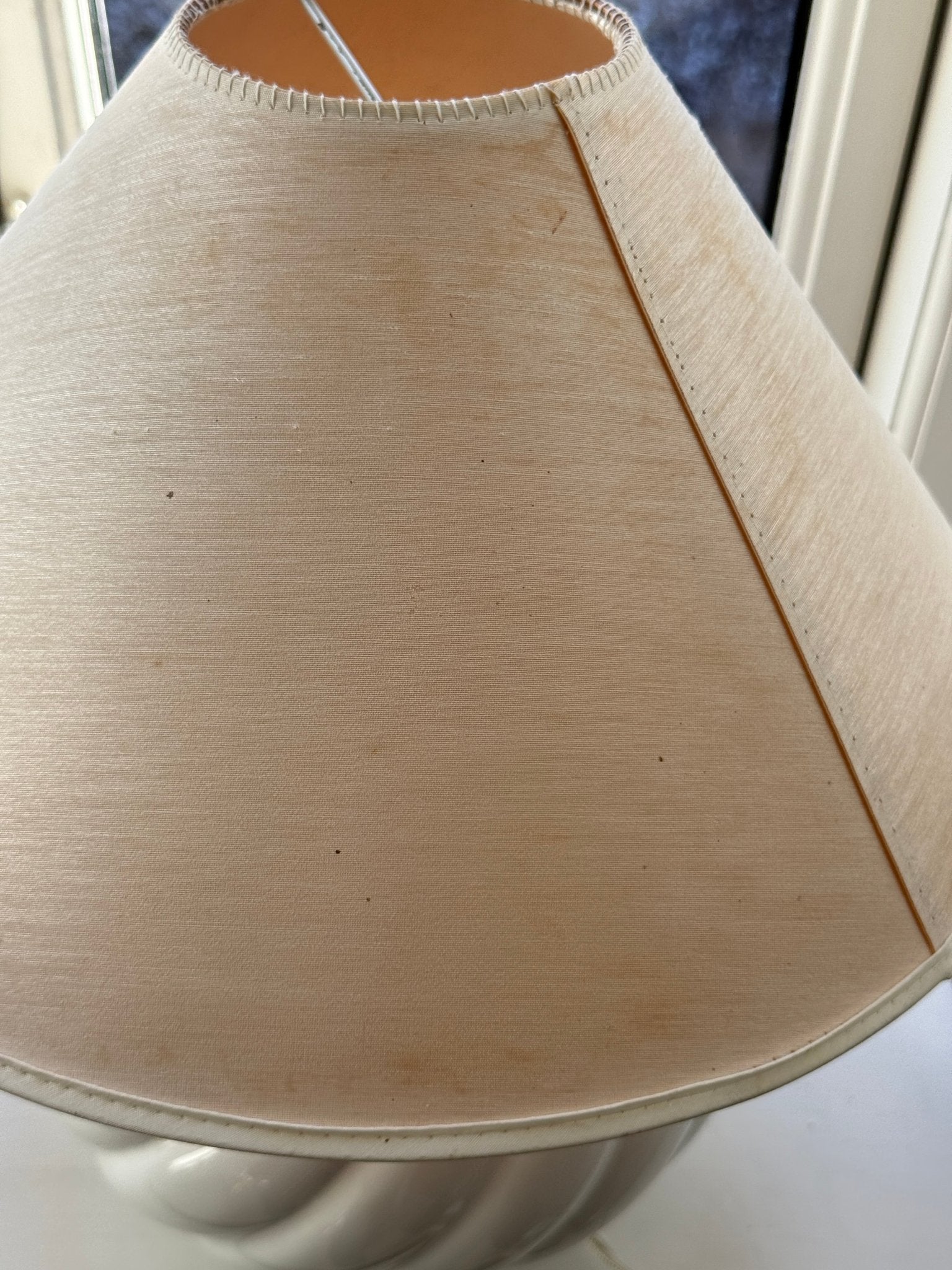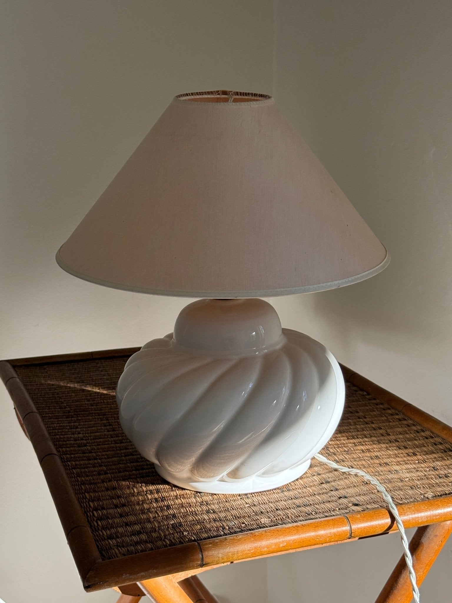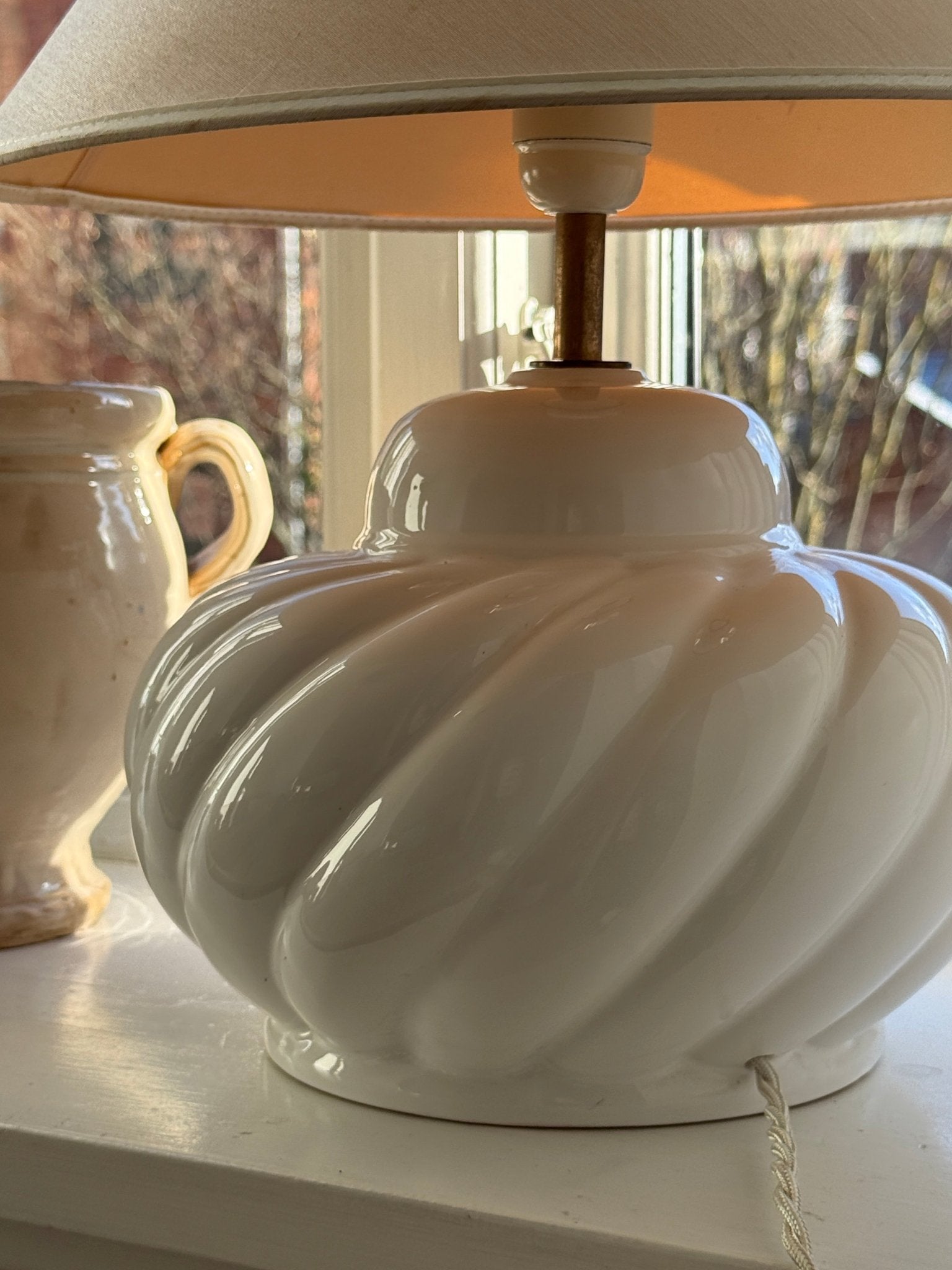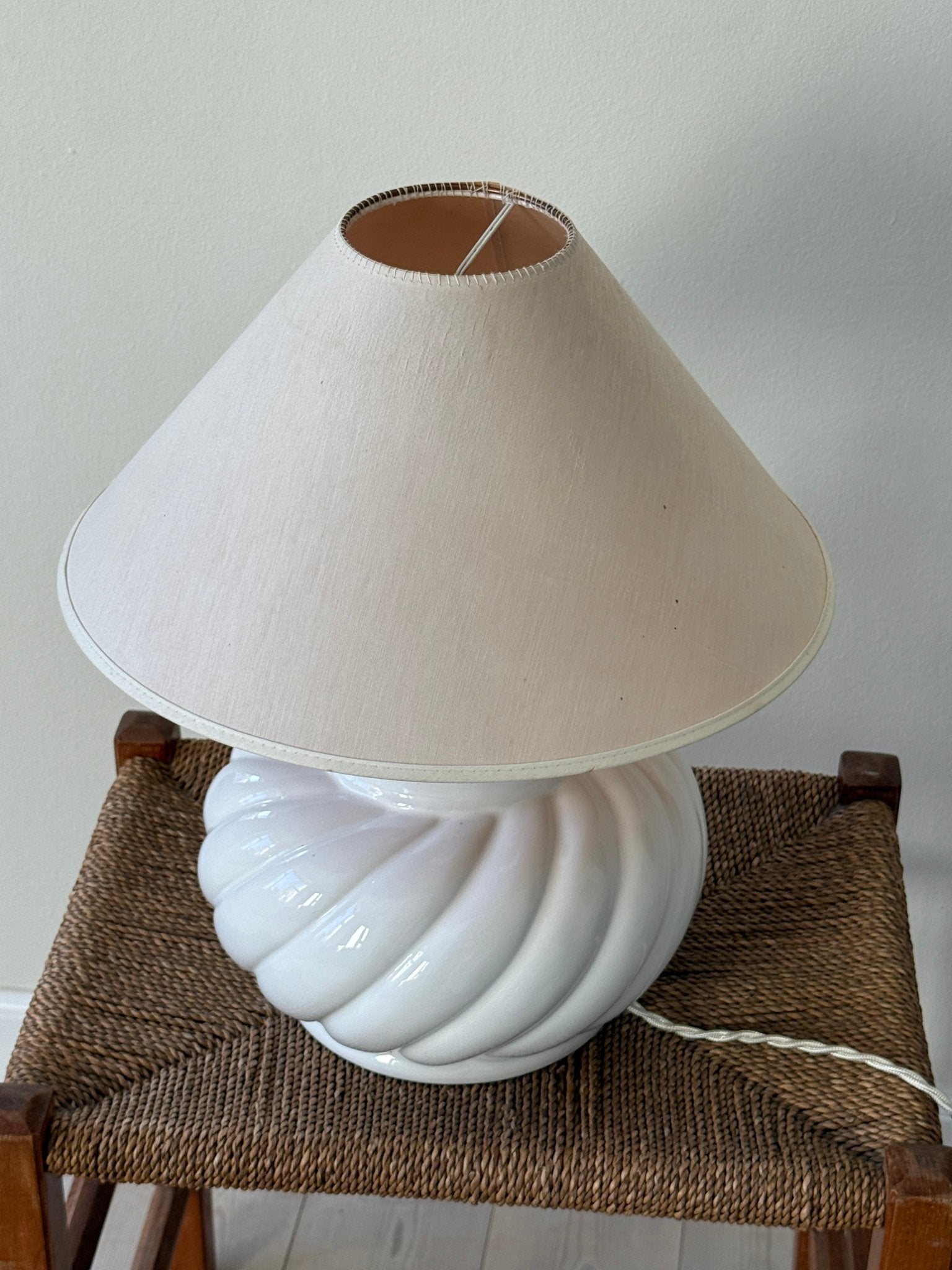 Large, stunning ceramic lamp. Found in Prato, Italy, and in excellent condition. A new fabric cord has been added. The vintage shade is included — small spots appear.