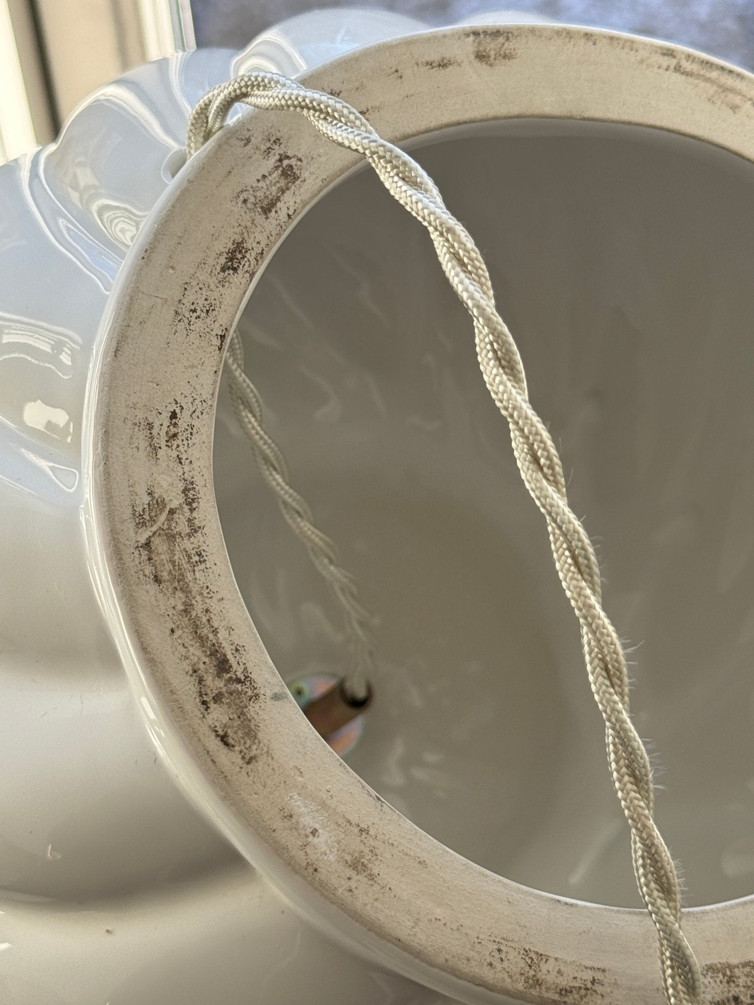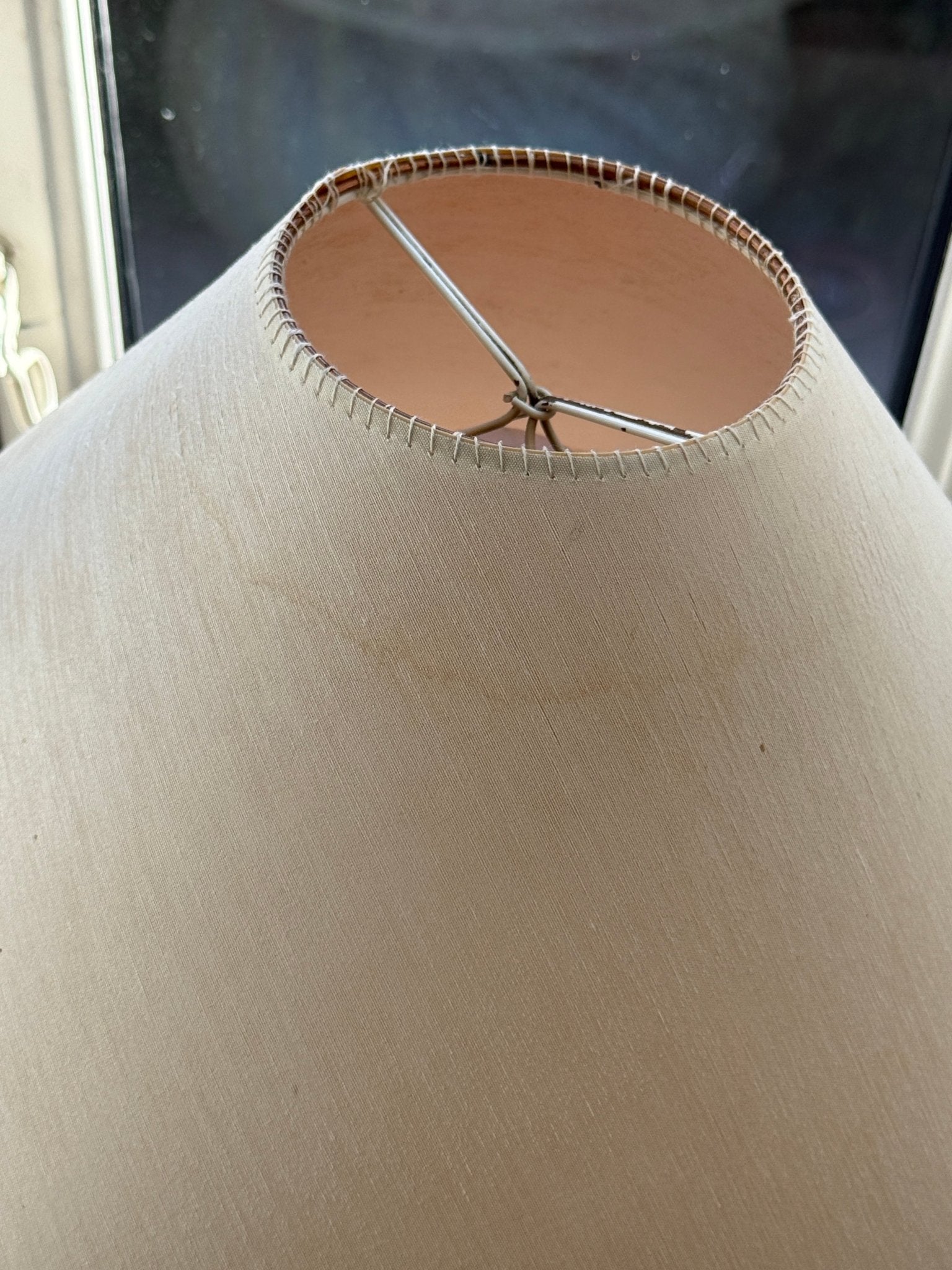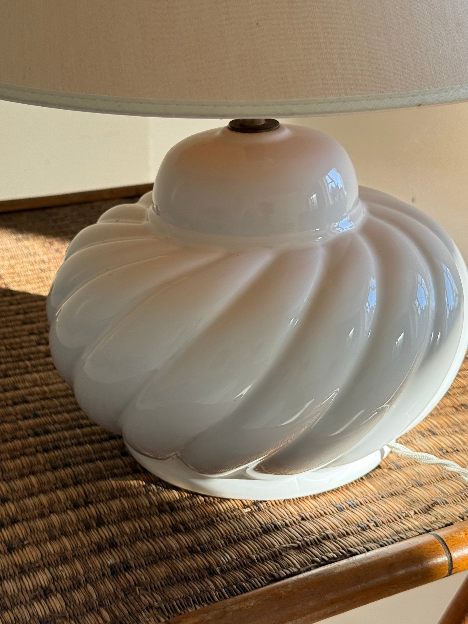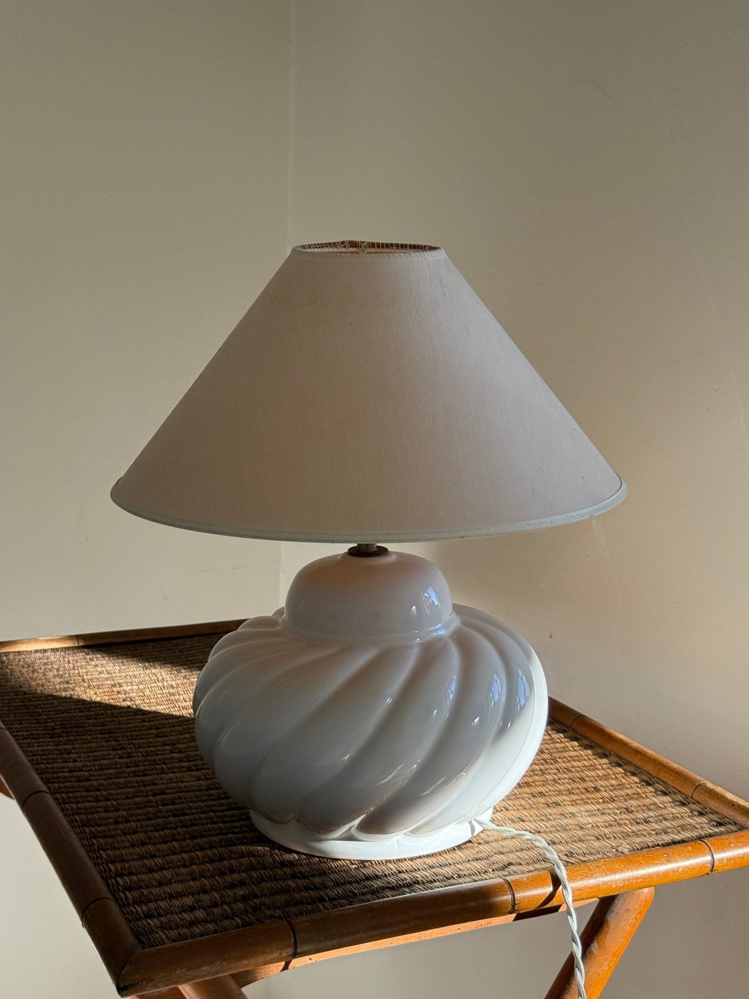 Large, stunning ceramic lamp. Found in Prato, Italy, and in excellent condition. A new fabric cord has been added. The vintage shade is included — small spots appear.