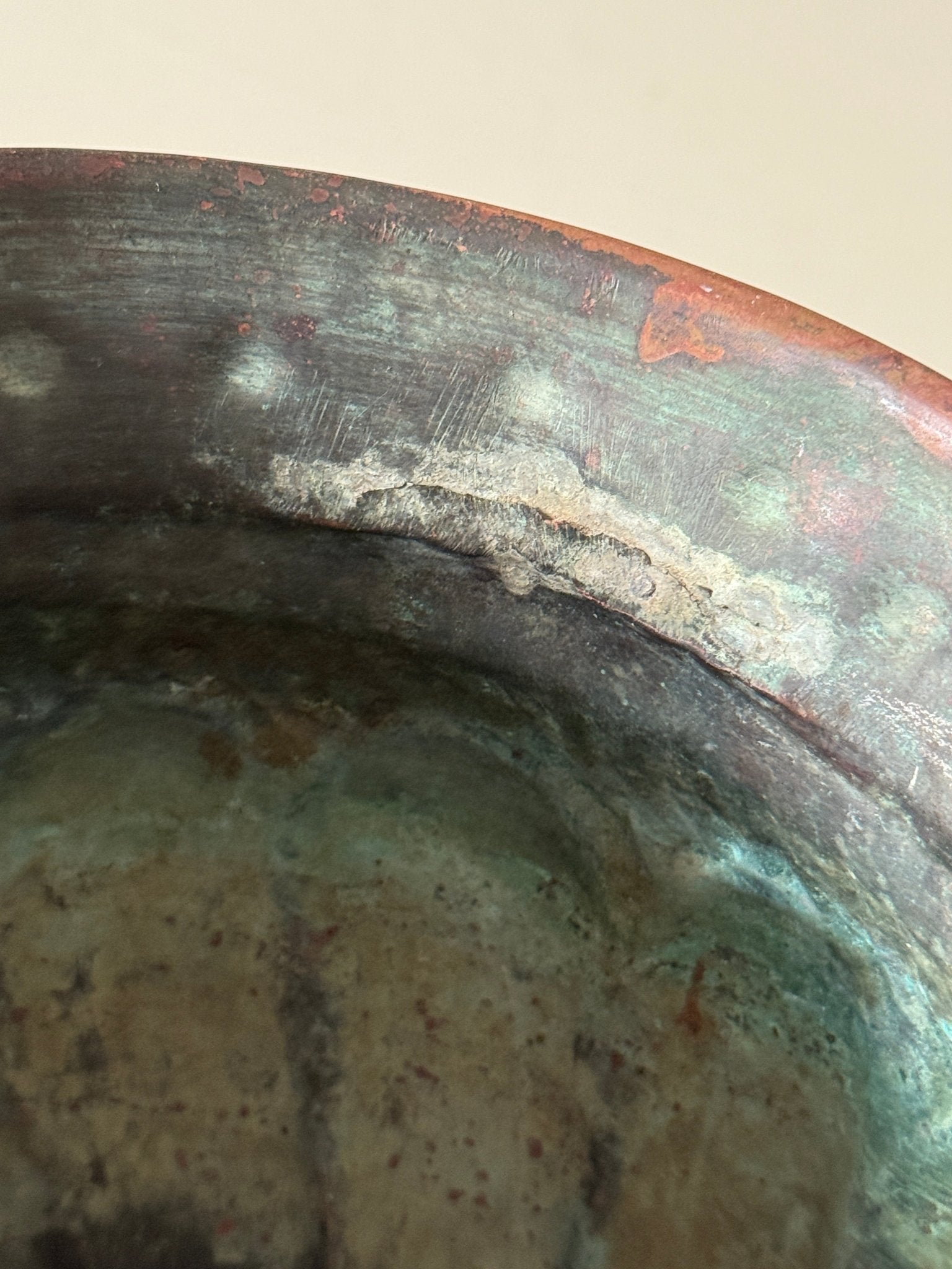 Antique copper vase from Italy. Comes with lots of beautiful patina. Two fine cracks at the top where the metal has slightly separated.