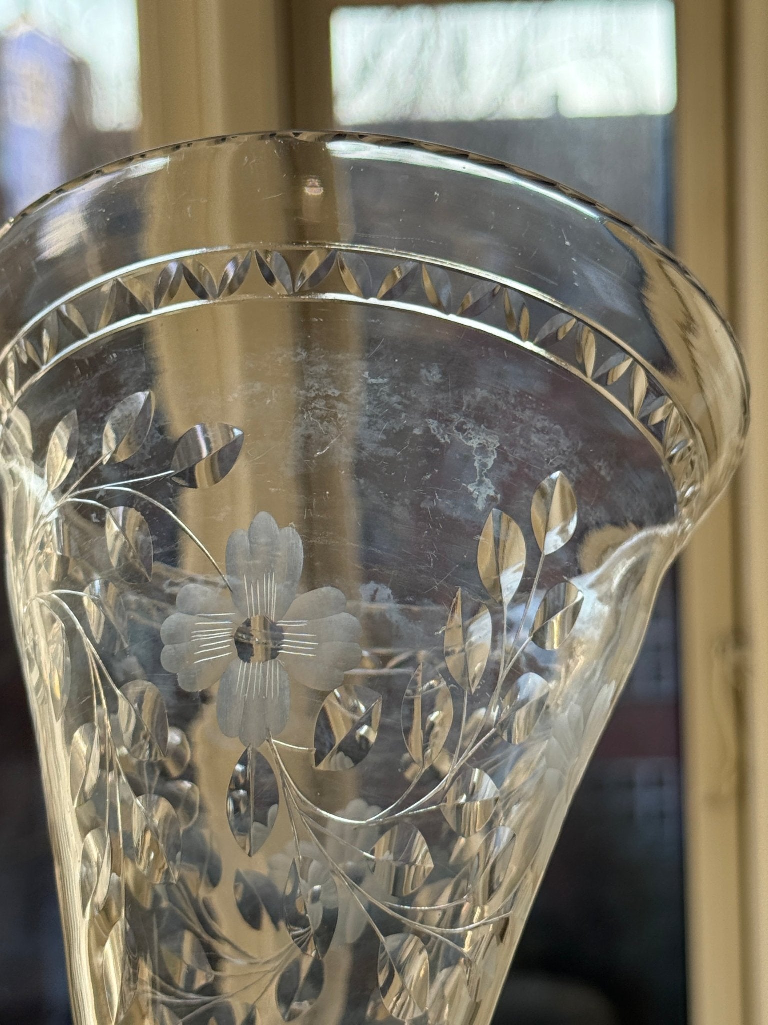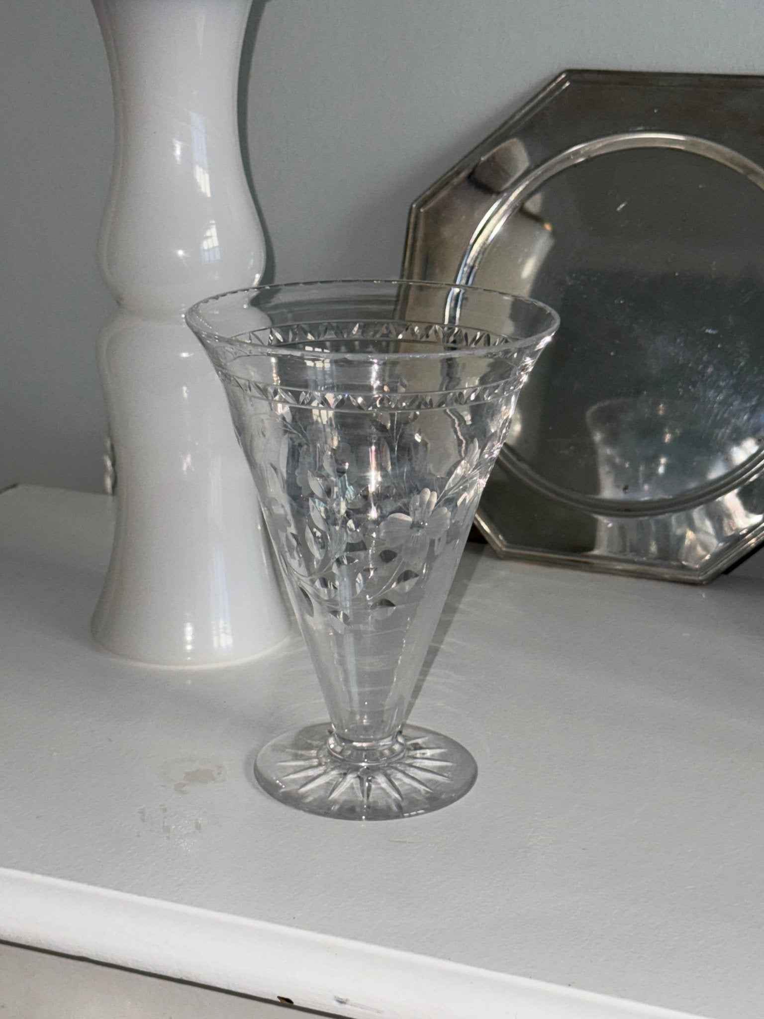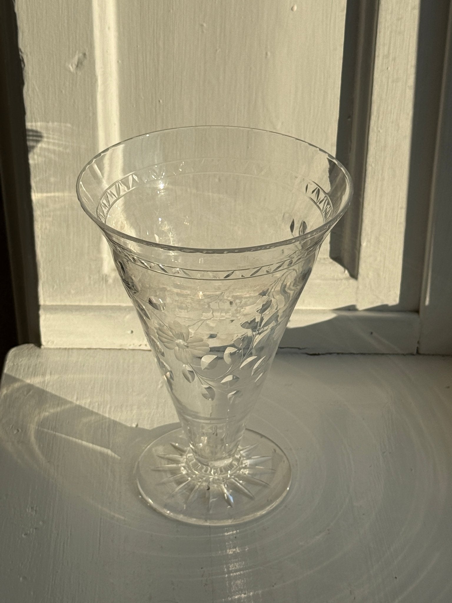 Beautiful, footed glass vase with floral decoration. Found in Sweden. In very good condition with only minor age-related glass disease (crizzling), typical for older glass pieces.