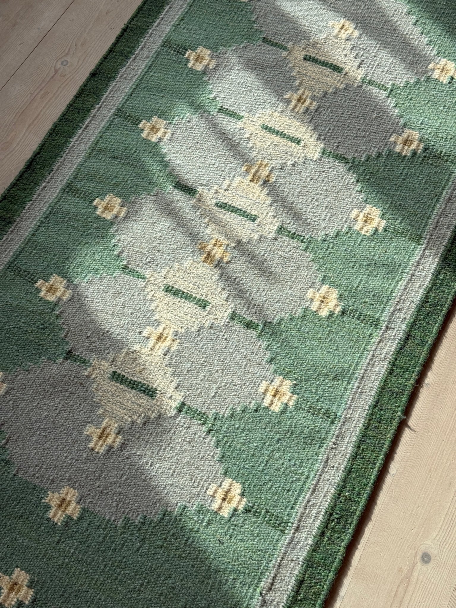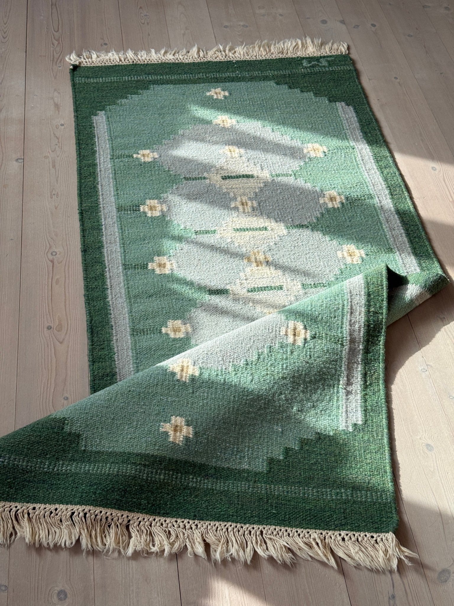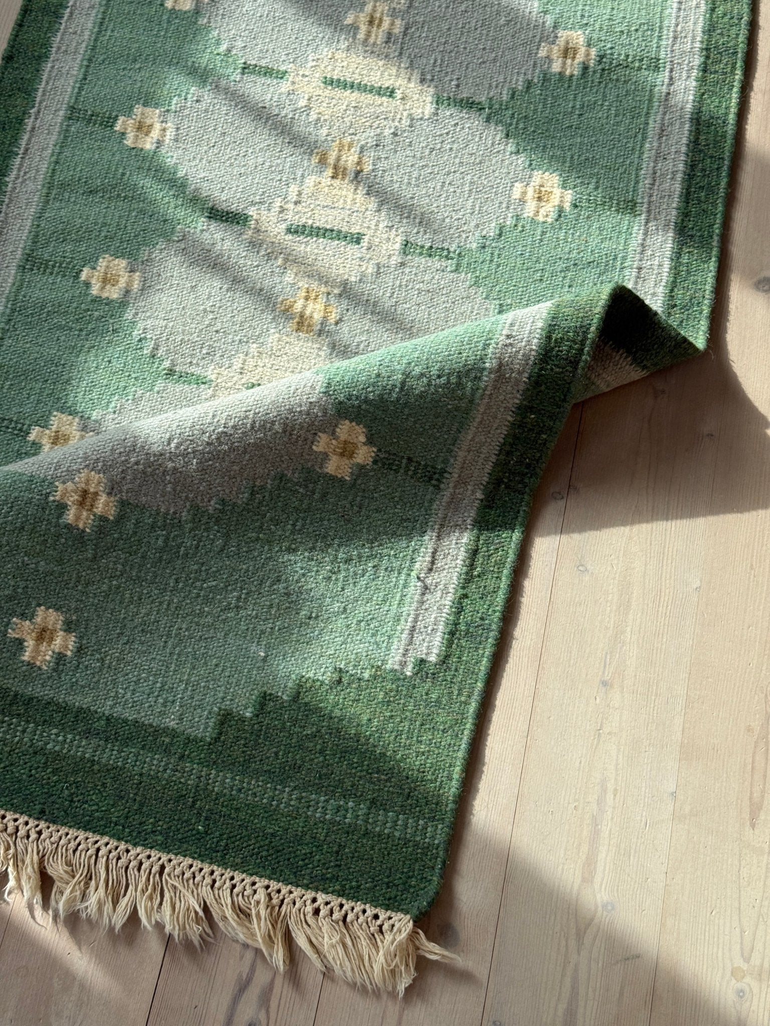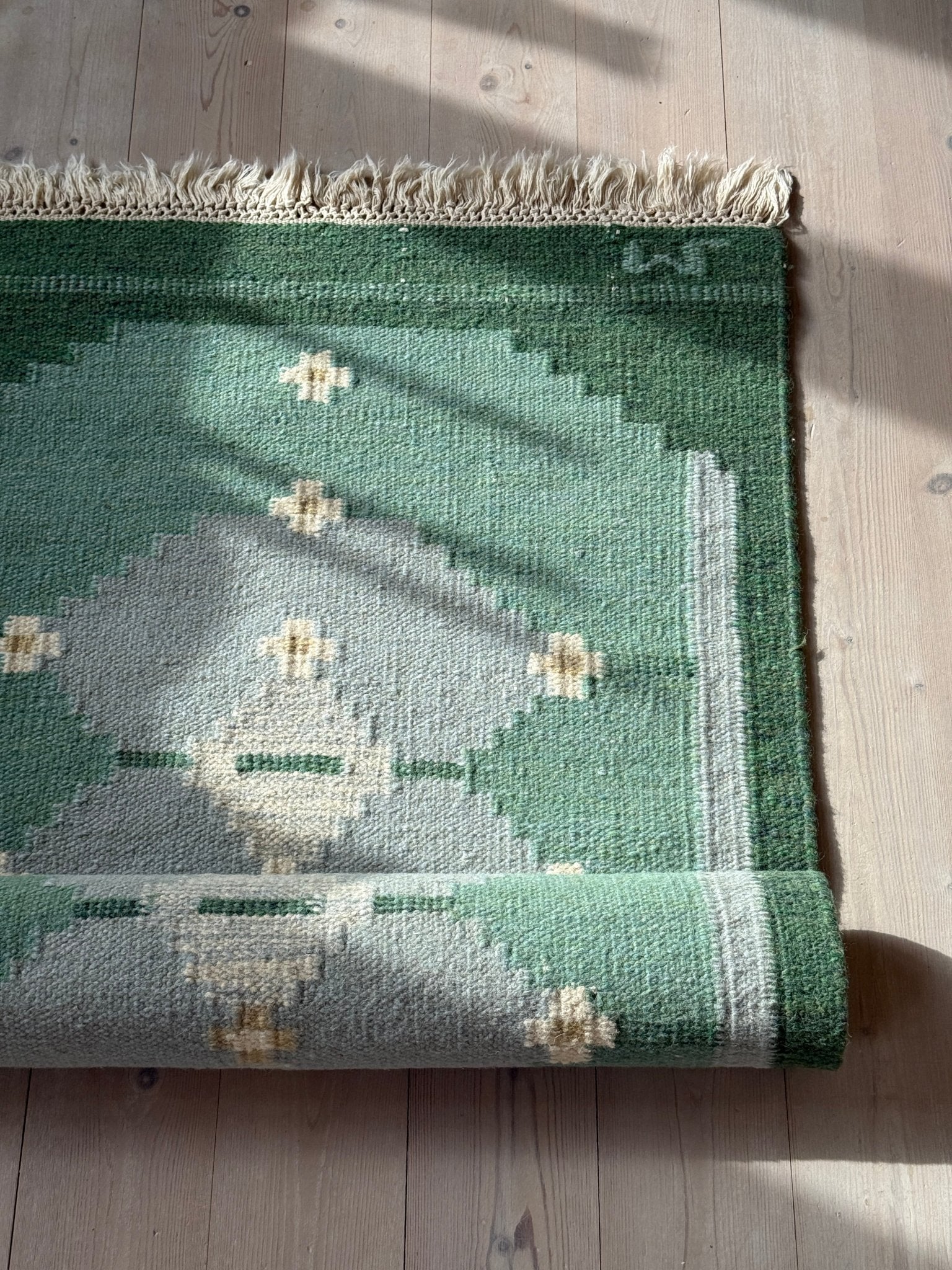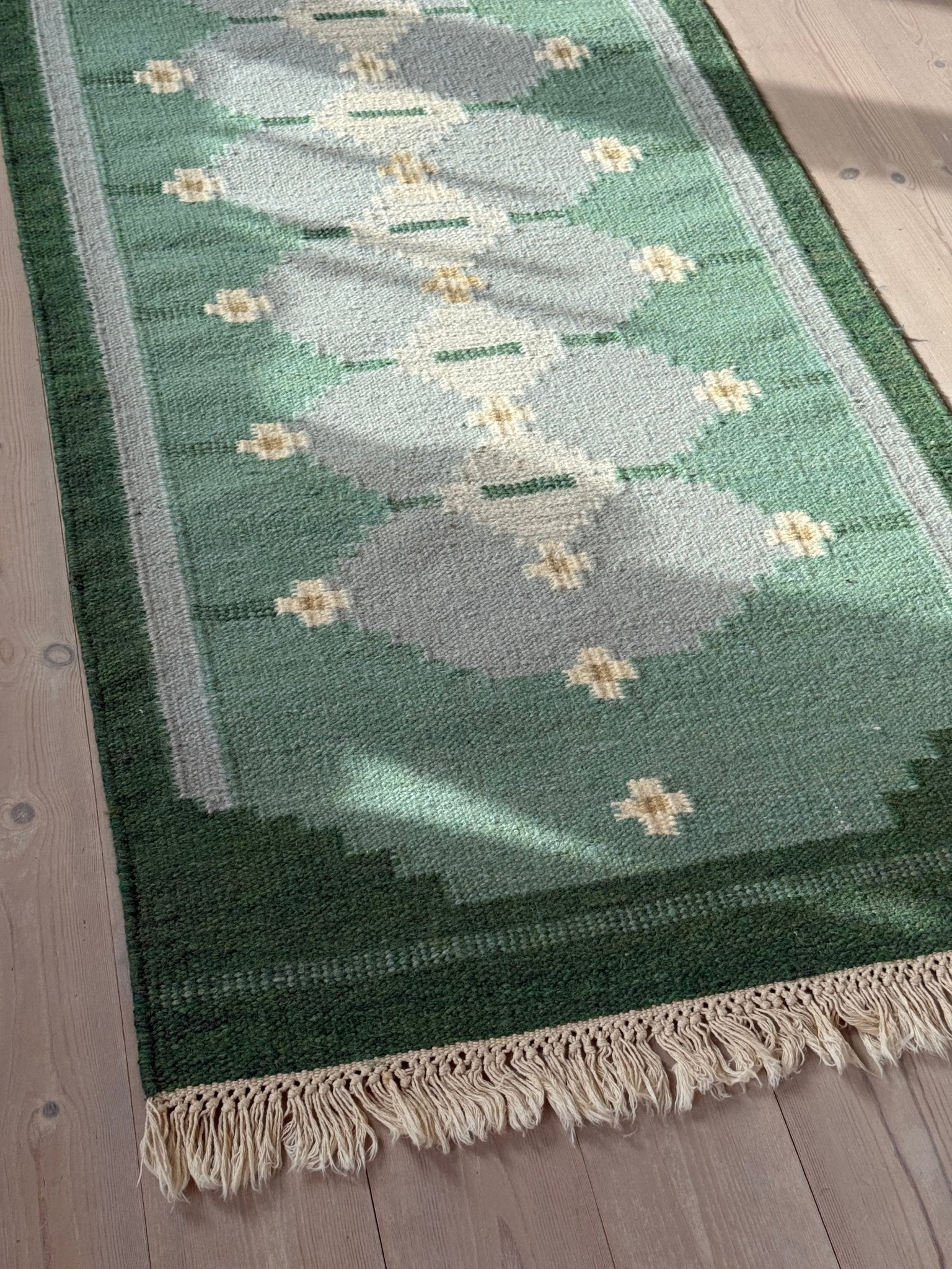 Stunning, green flatweave rug. Signed ML, Margaret’s Lundahl. In mint condition.