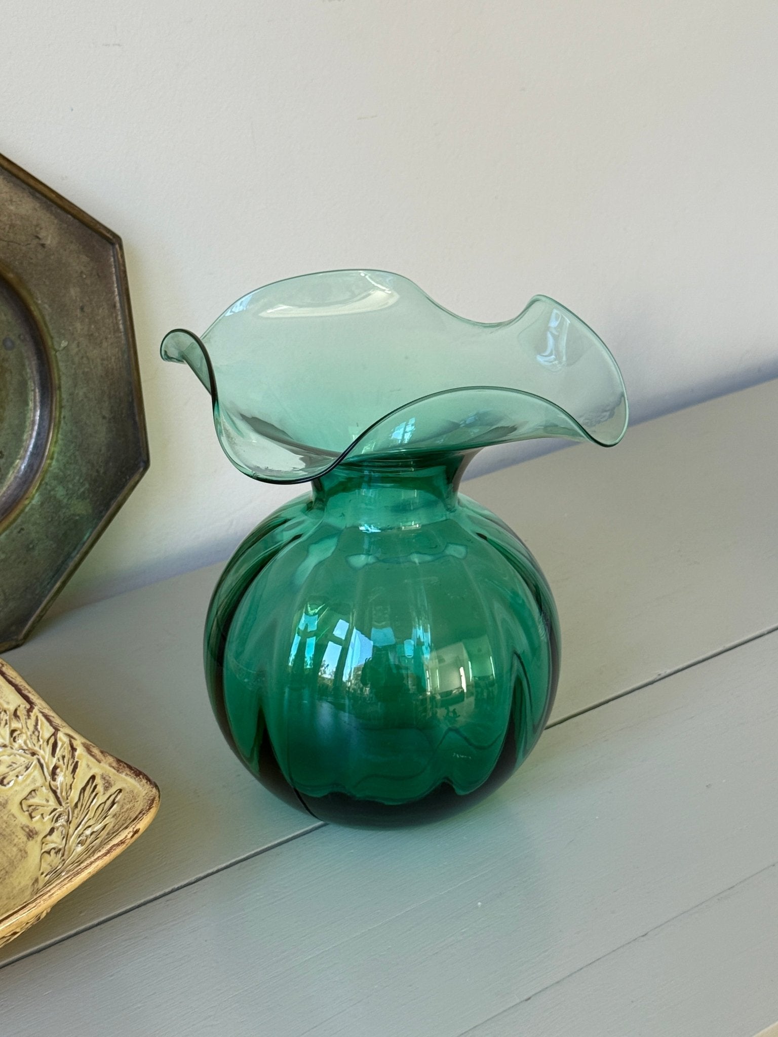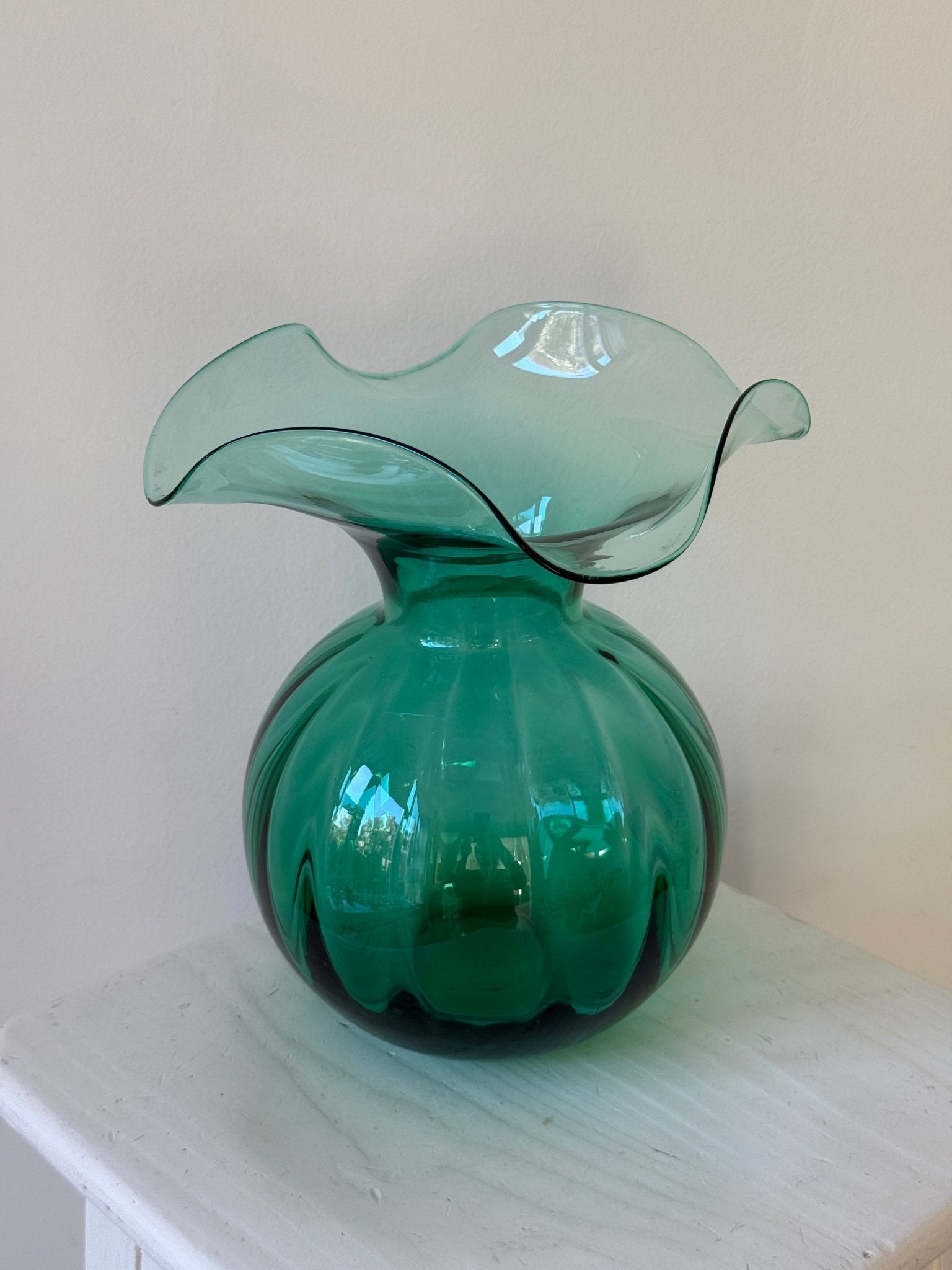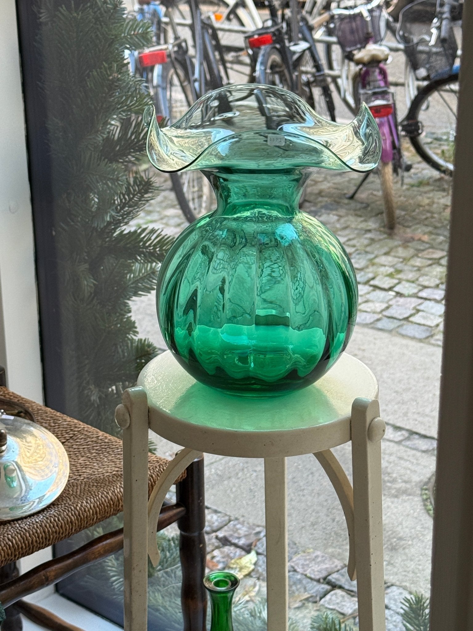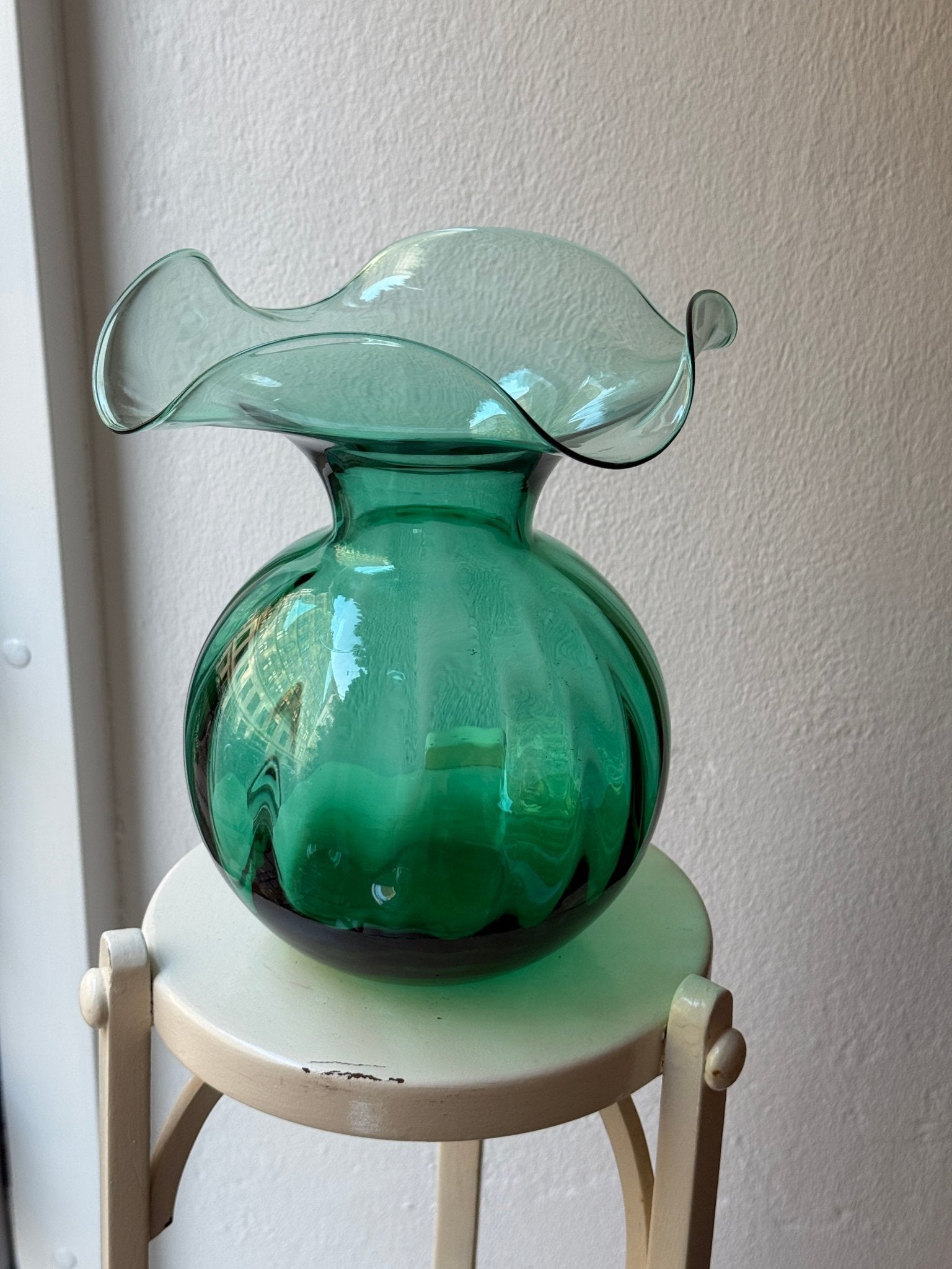 Amazing green murano glass vase with a wavy rim. 1970’s, Italy. In mint condition.