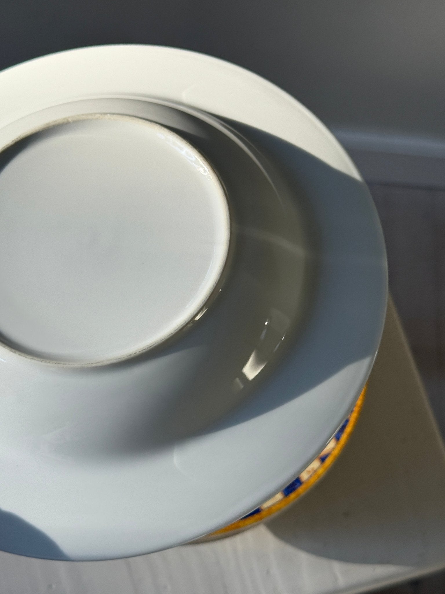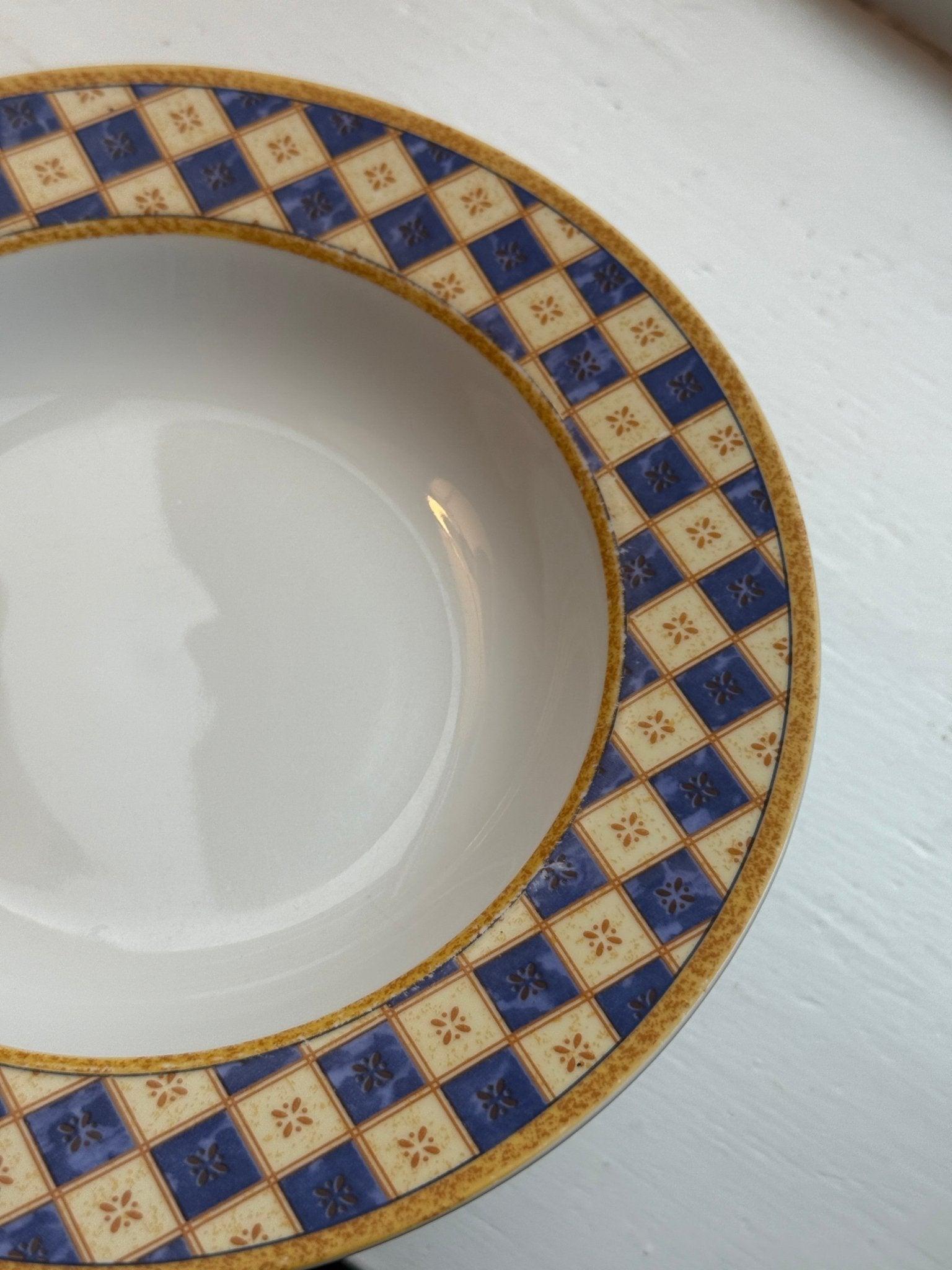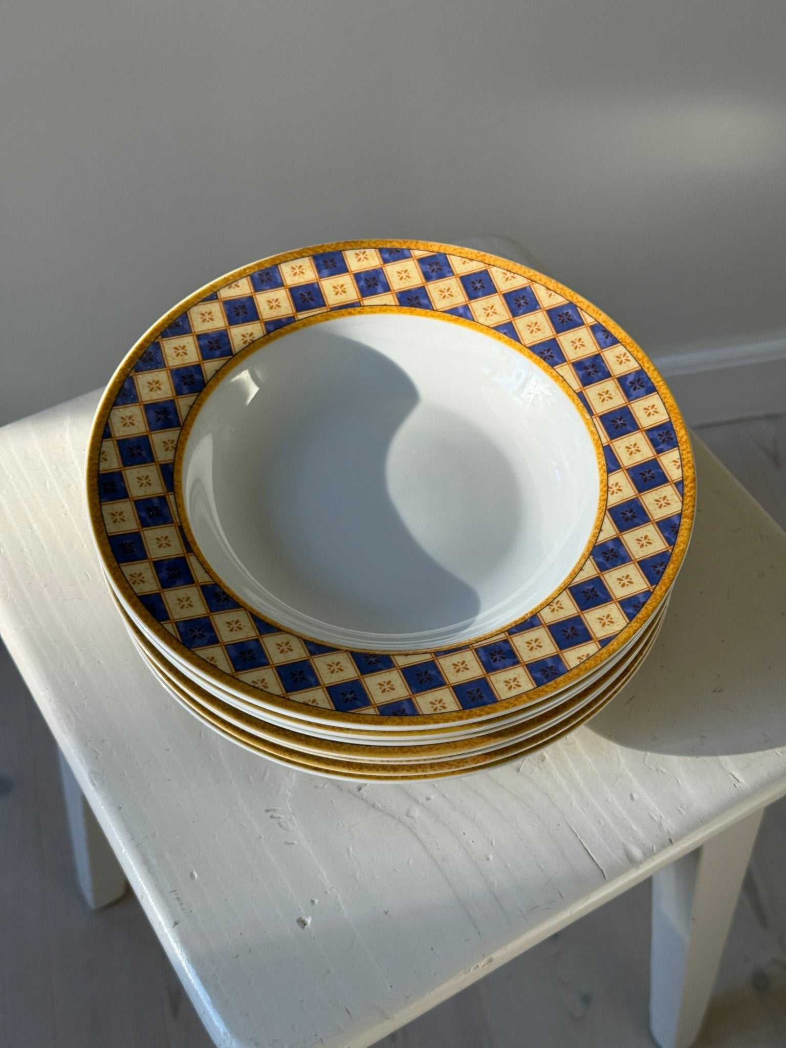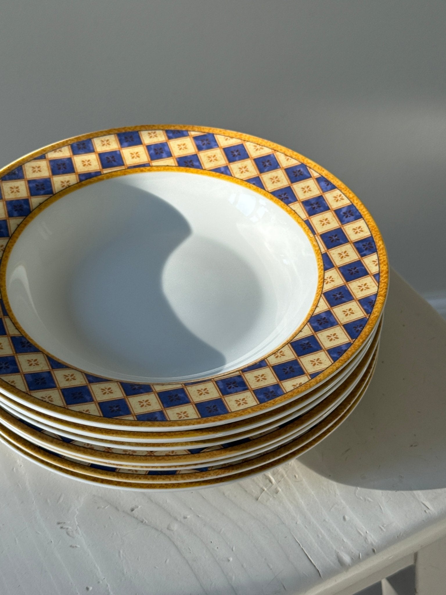 Pasta plates with patterned rim. 9 pcs available, price is per piece. All are in very good condition with only minor blurring in the print on a few plates as shown in the photos.