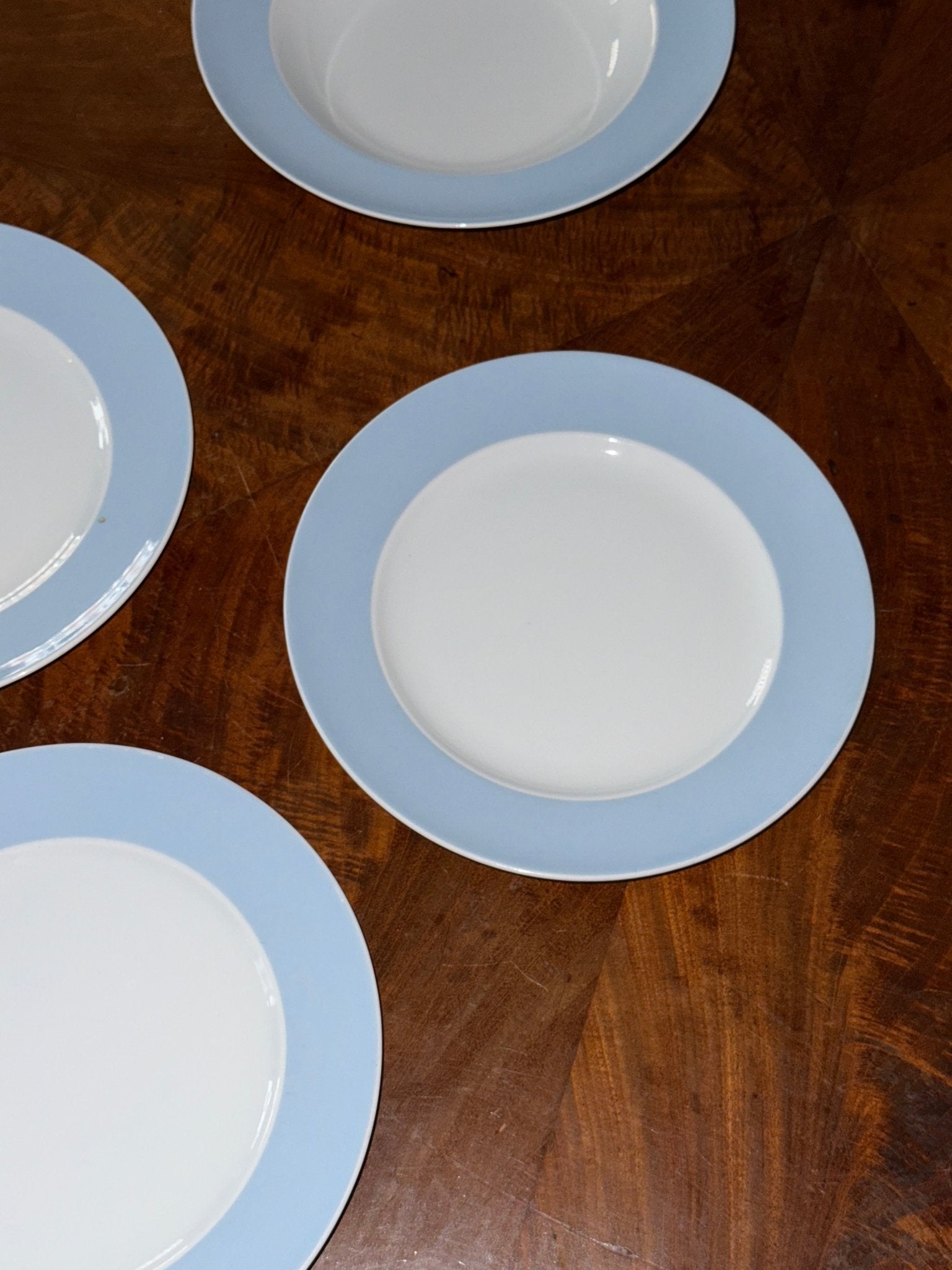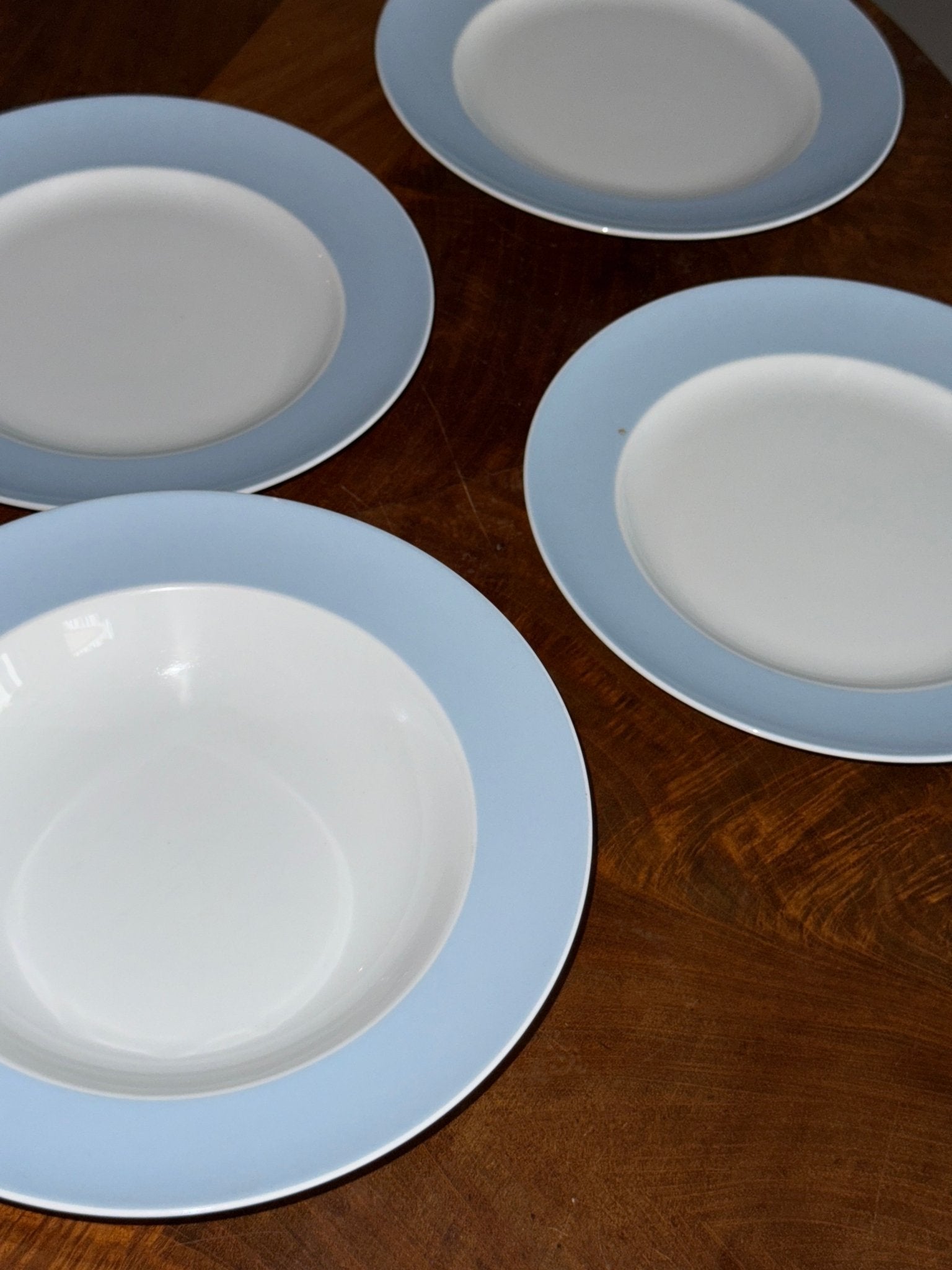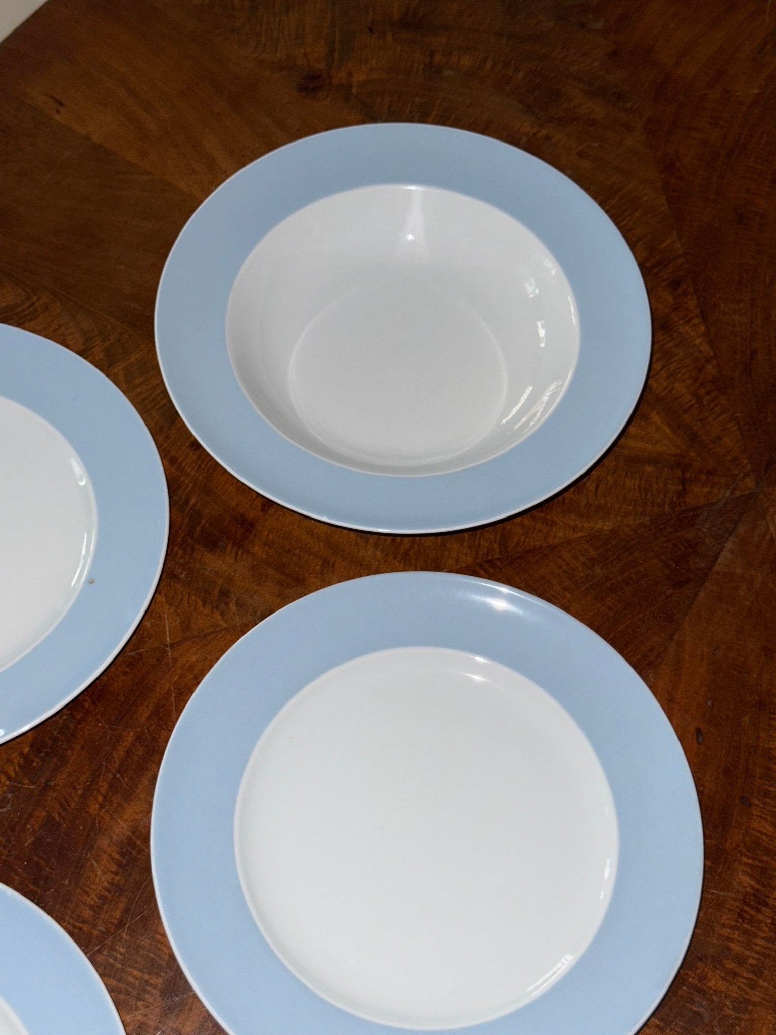 Blue rim plate set consisting of 3 dinner plates and 1 pasta plate. Sold together as a set of 4. Origin: Germany, but found in Italy. In mint condition except for one minor spot at one dinner plate and one tiny flaw at one pasta plate.