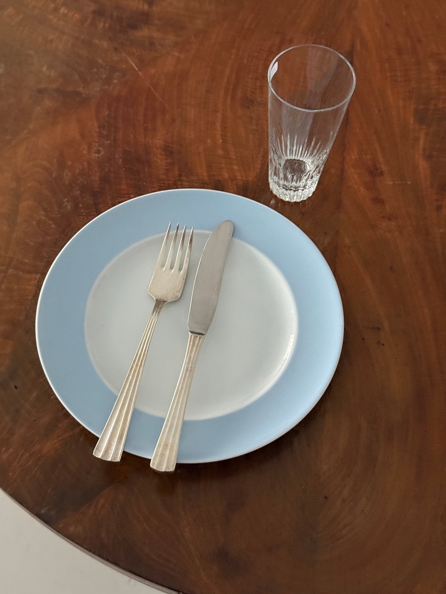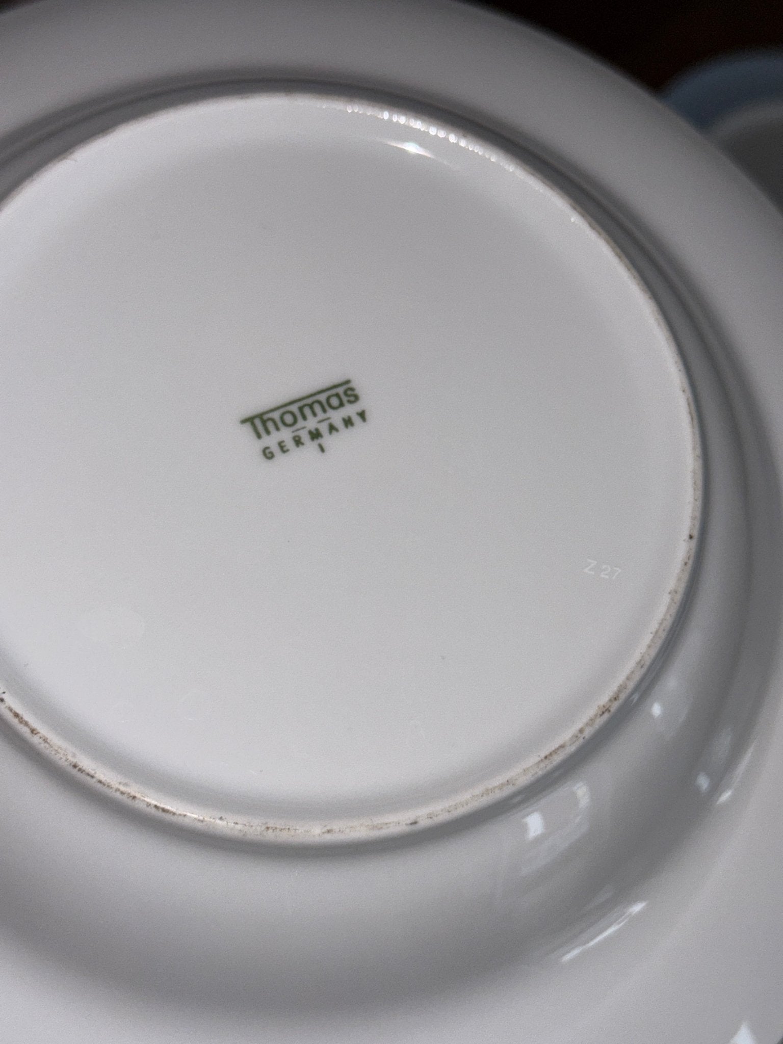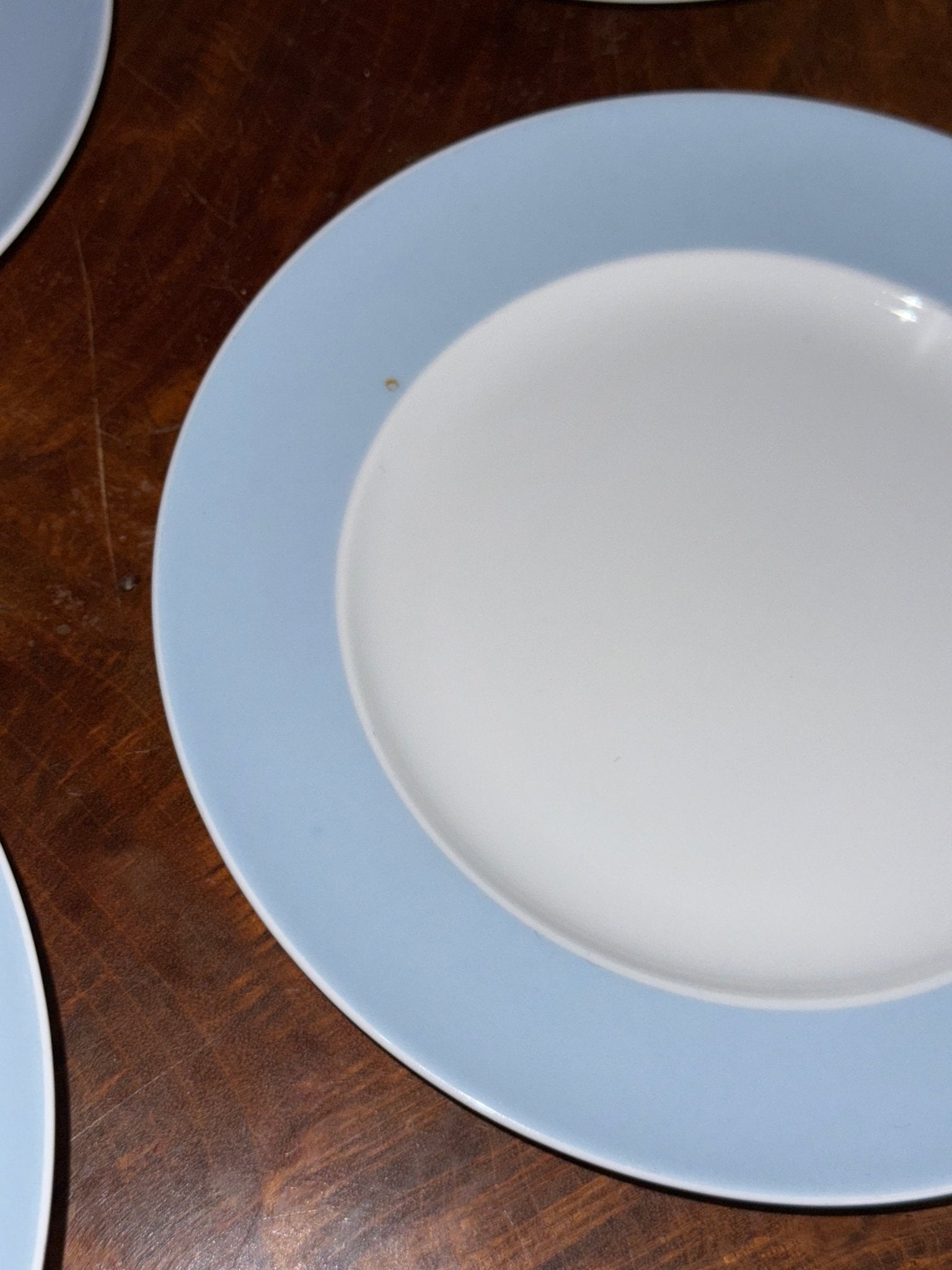 Blue rim plate set consisting of 3 dinner plates and 1 pasta plate. Sold together as a set of 4. Origin: Germany, but found in Italy. In mint condition except for one minor spot at one dinner plate and one tiny flaw at one pasta plate.