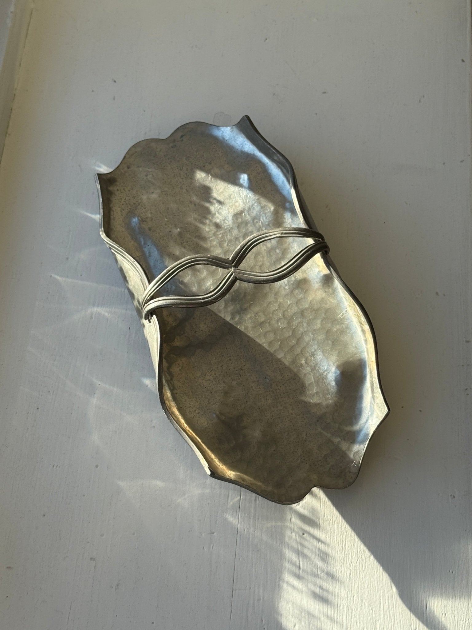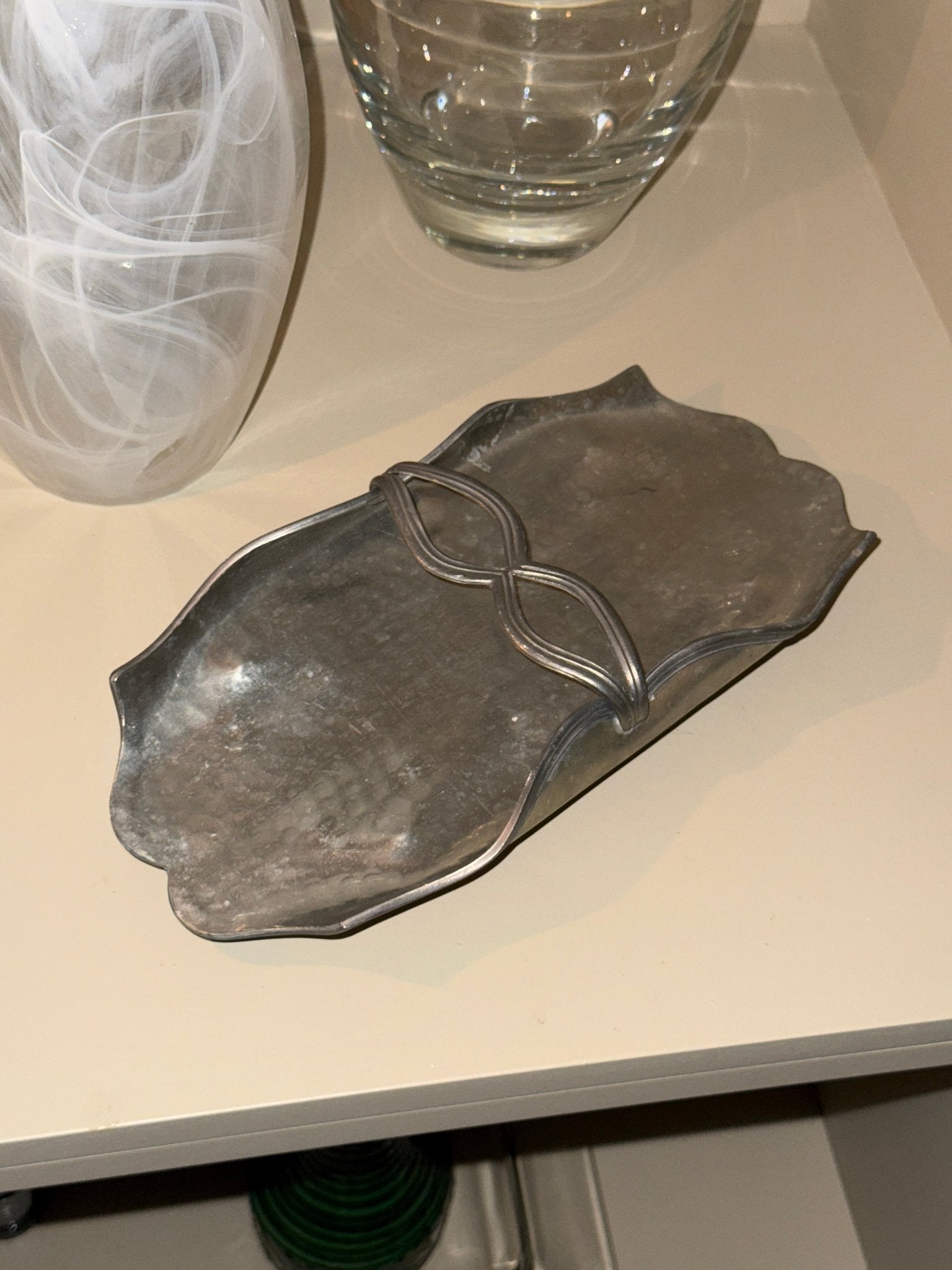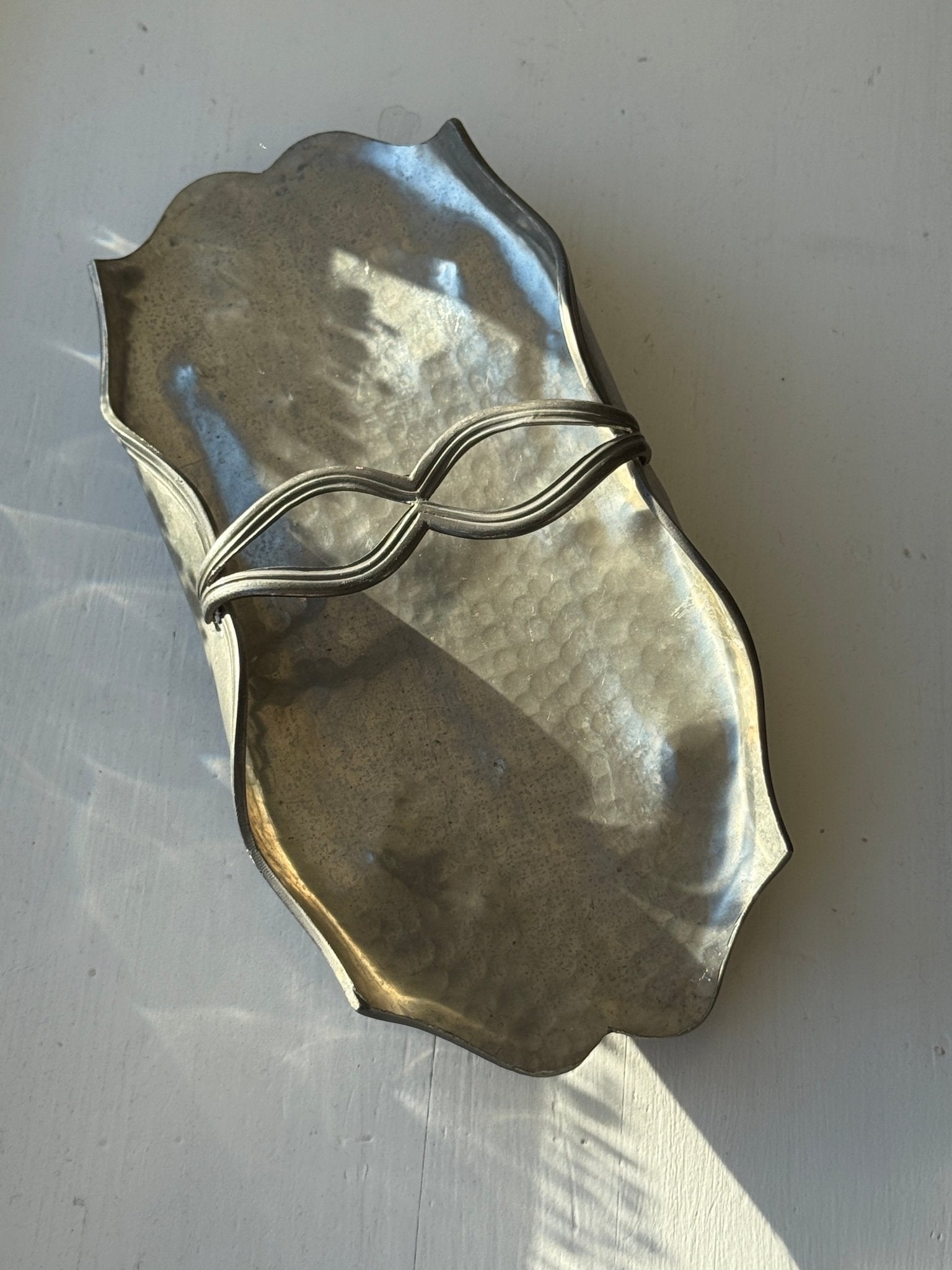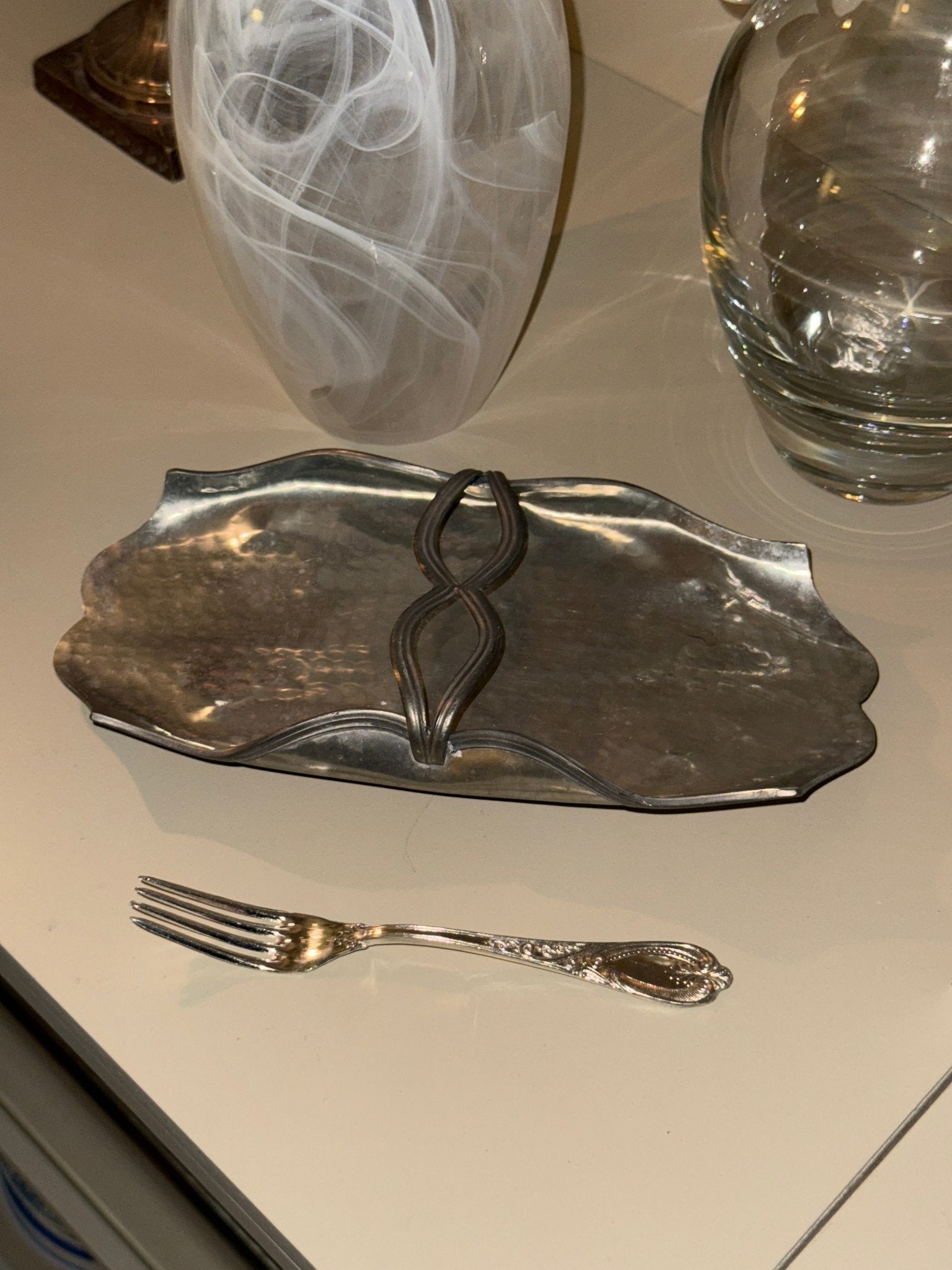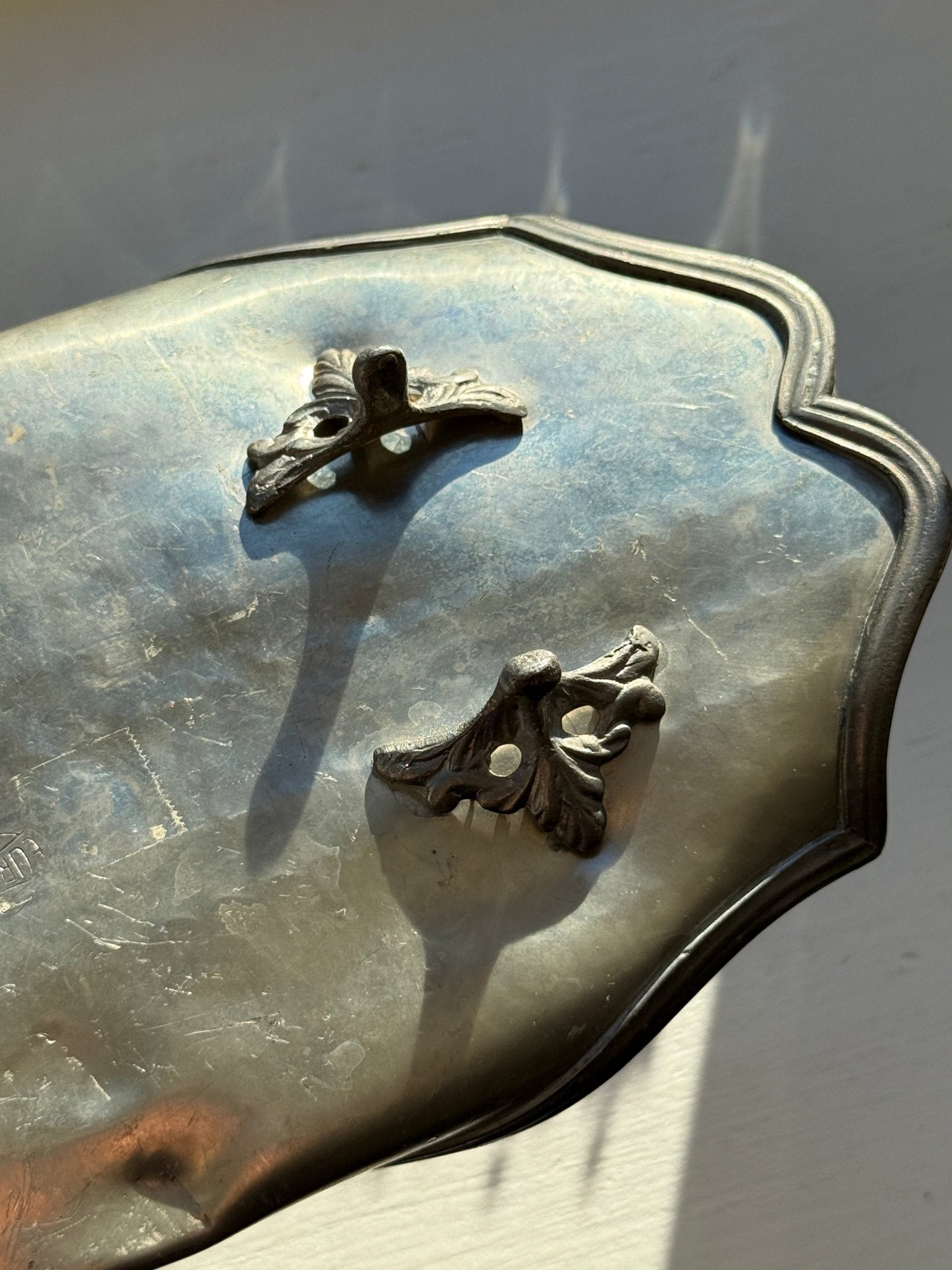 Beautiful silver plated dish with scalloped edge and handle. Italy. In mint condition.