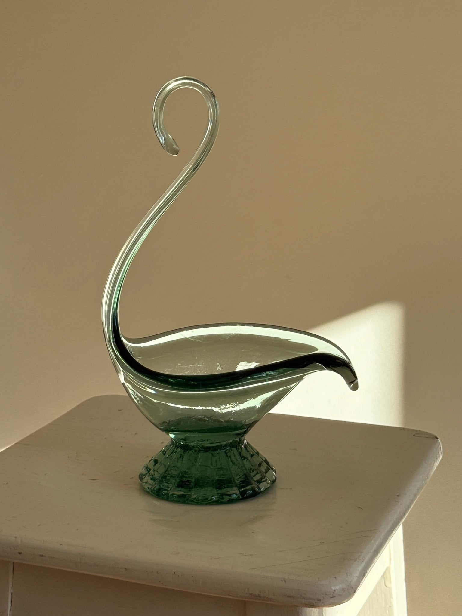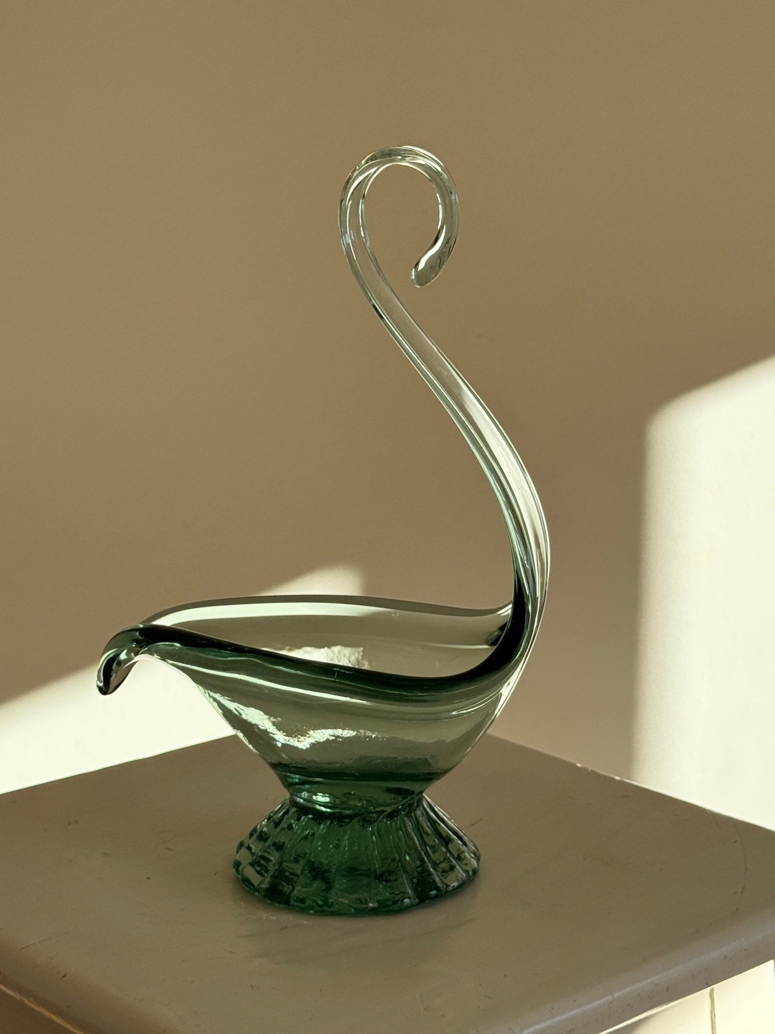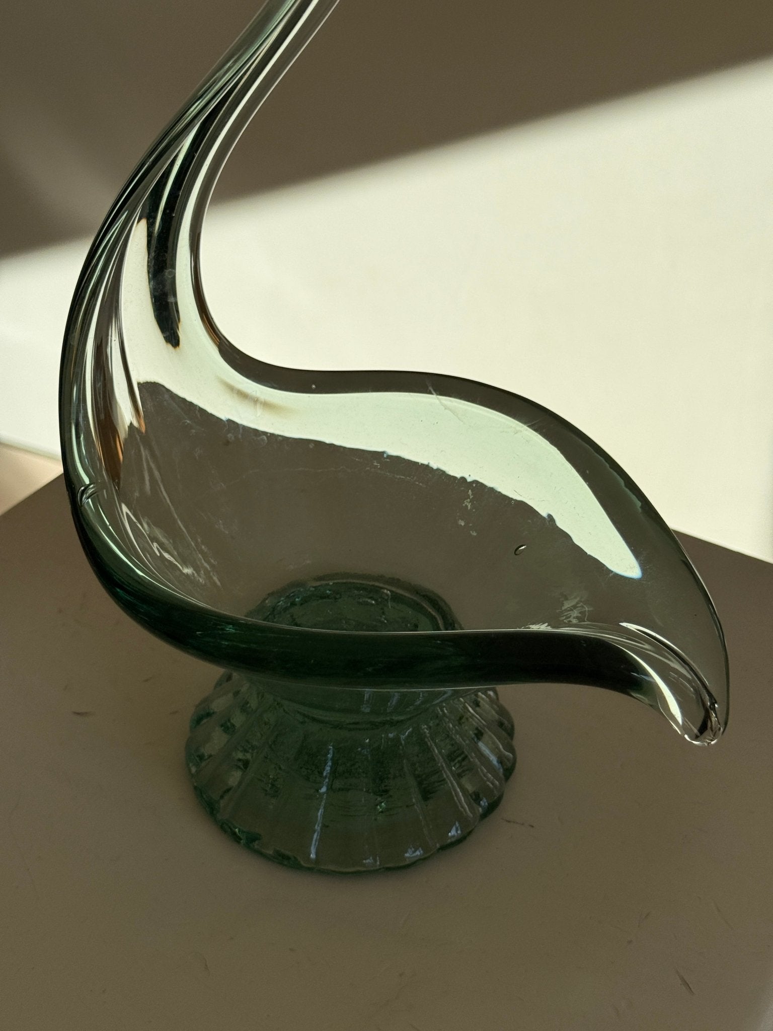 Elegant swan bowl in green glass. Excellent for displaying fruits. In mint condition.