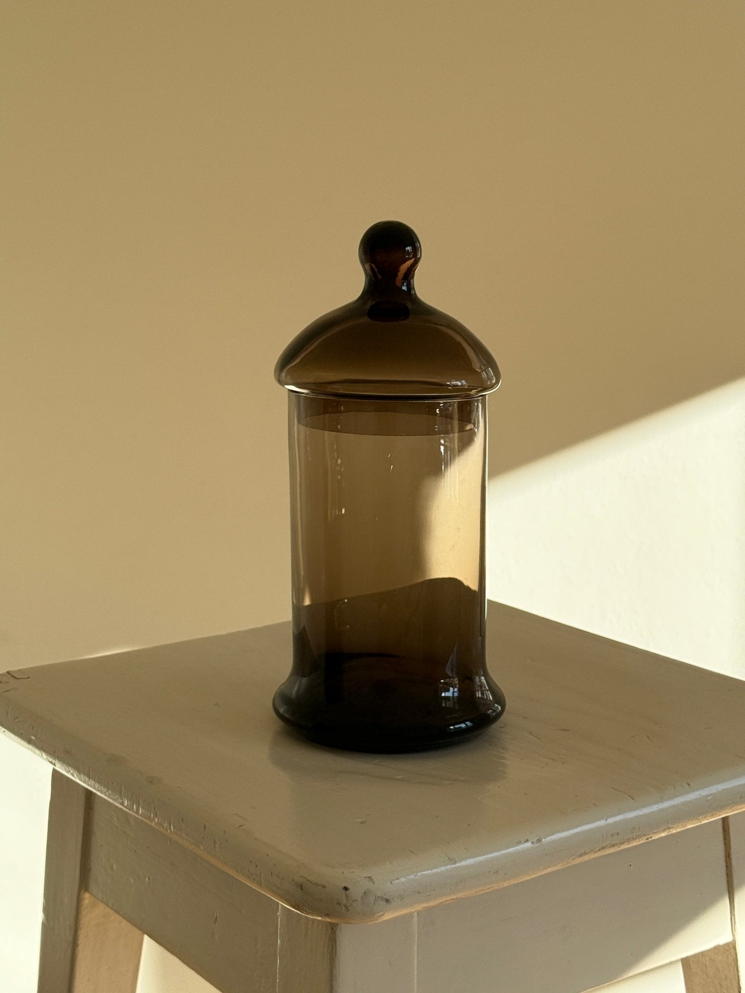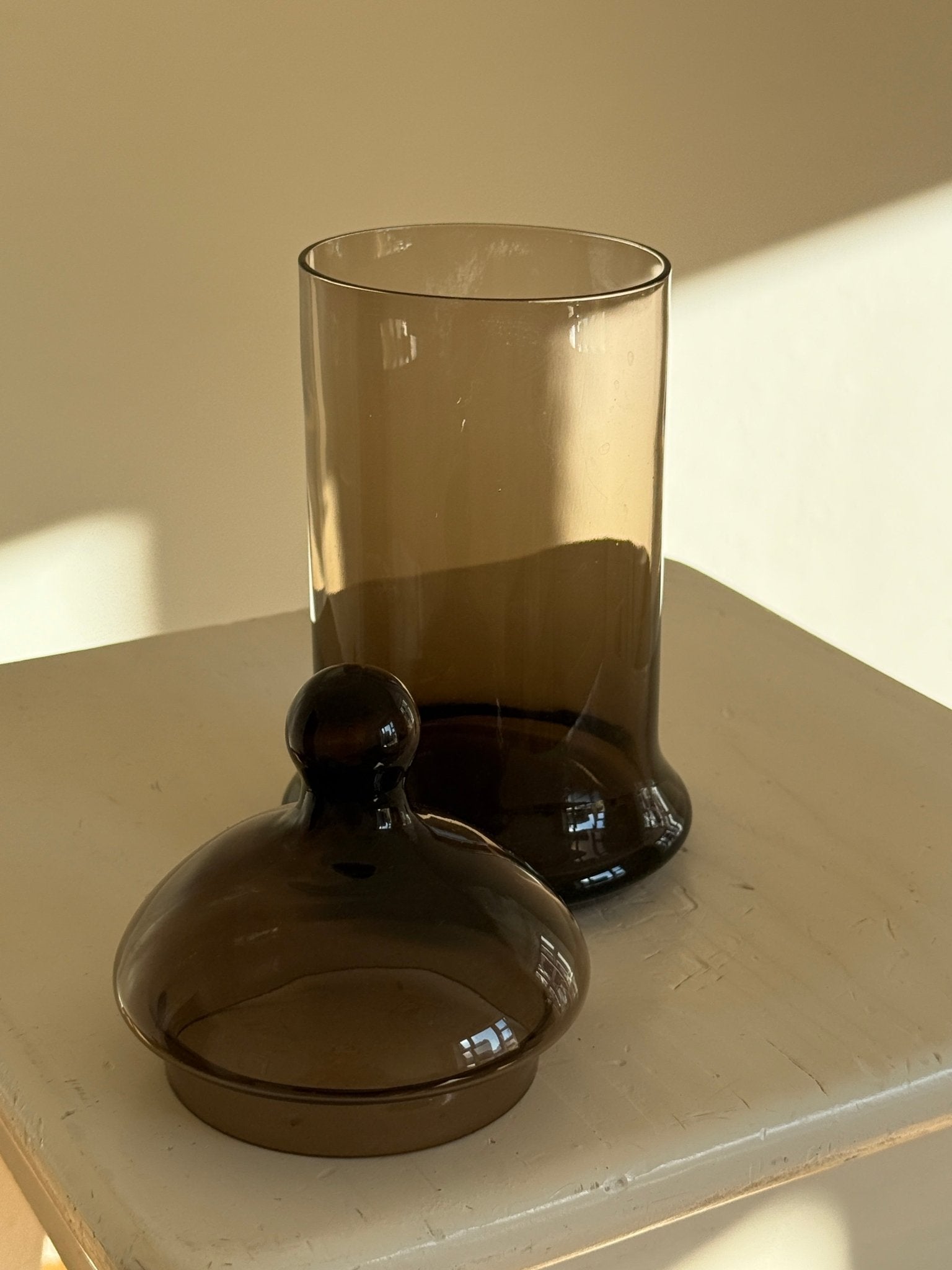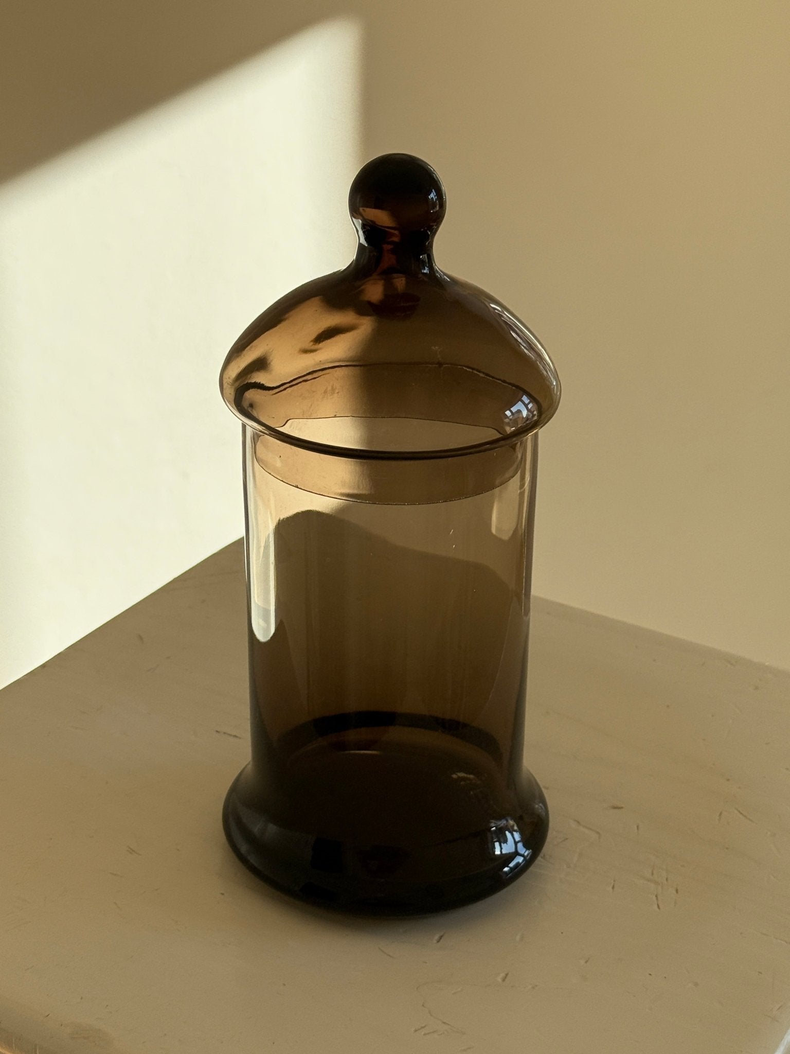 Tall bonbonniere in brown glass. Found in Bologna, Italy. In mint condition.